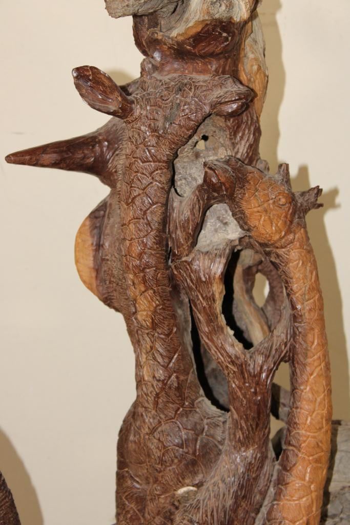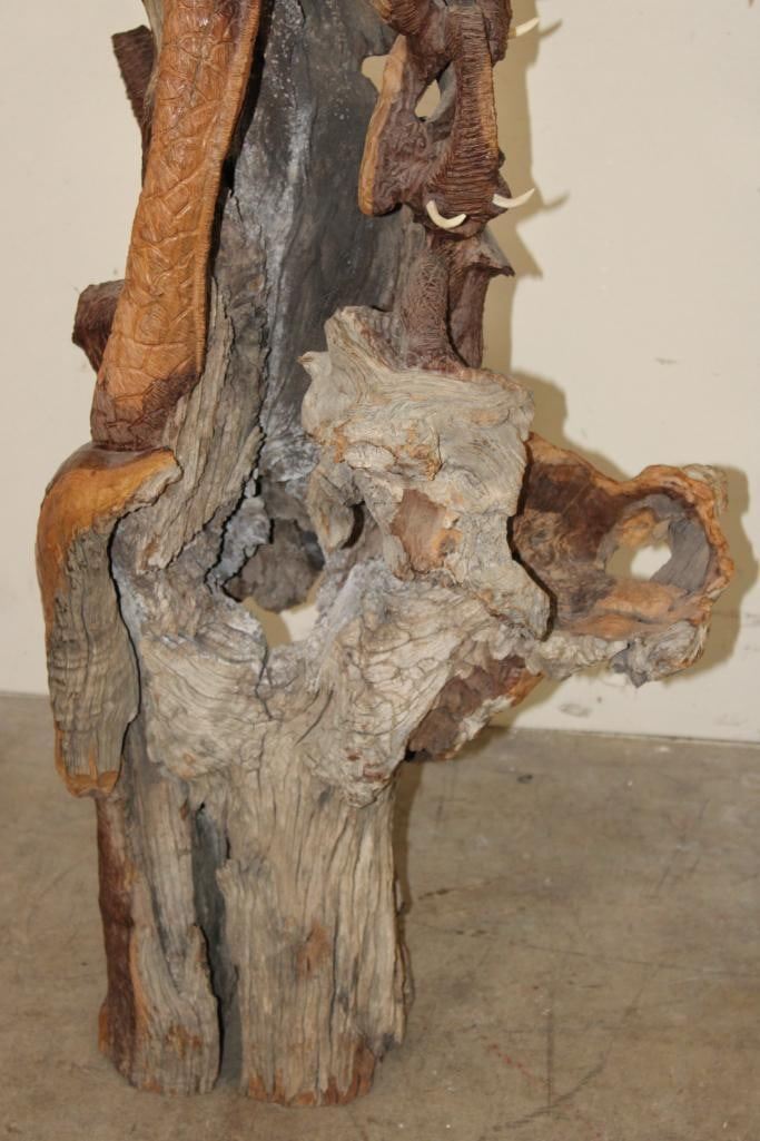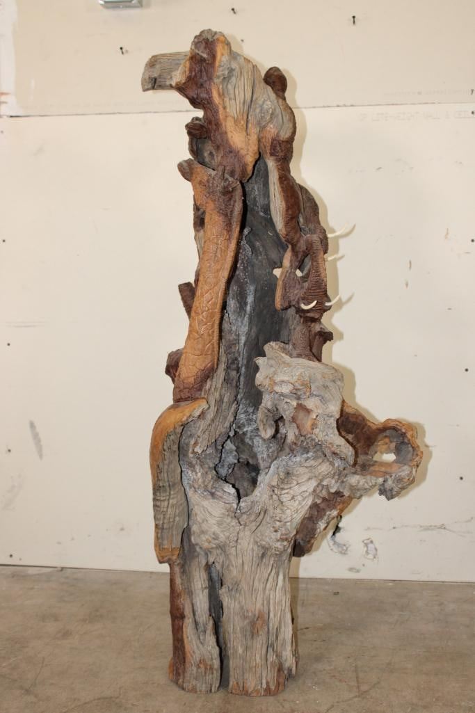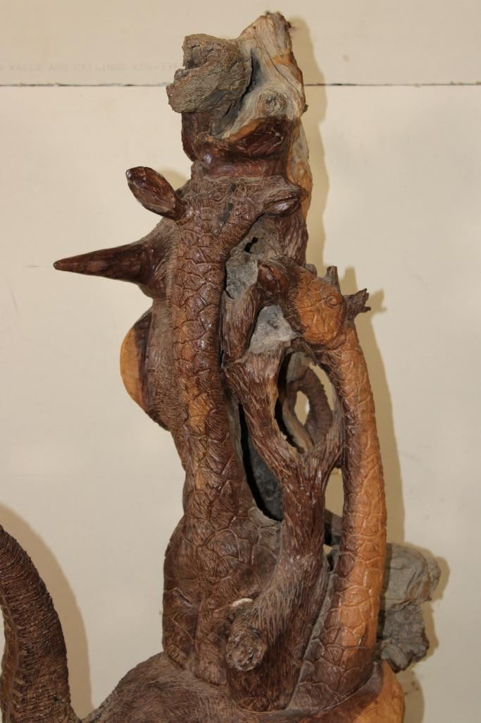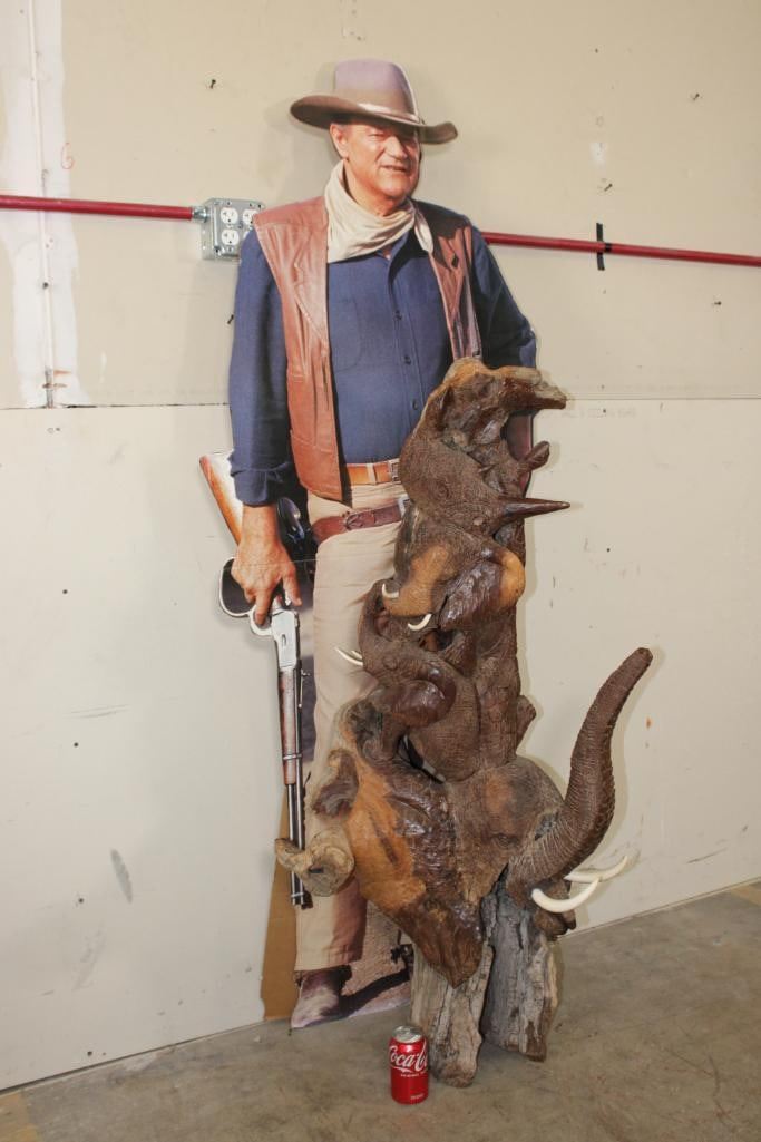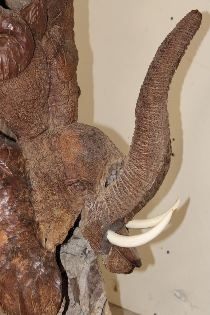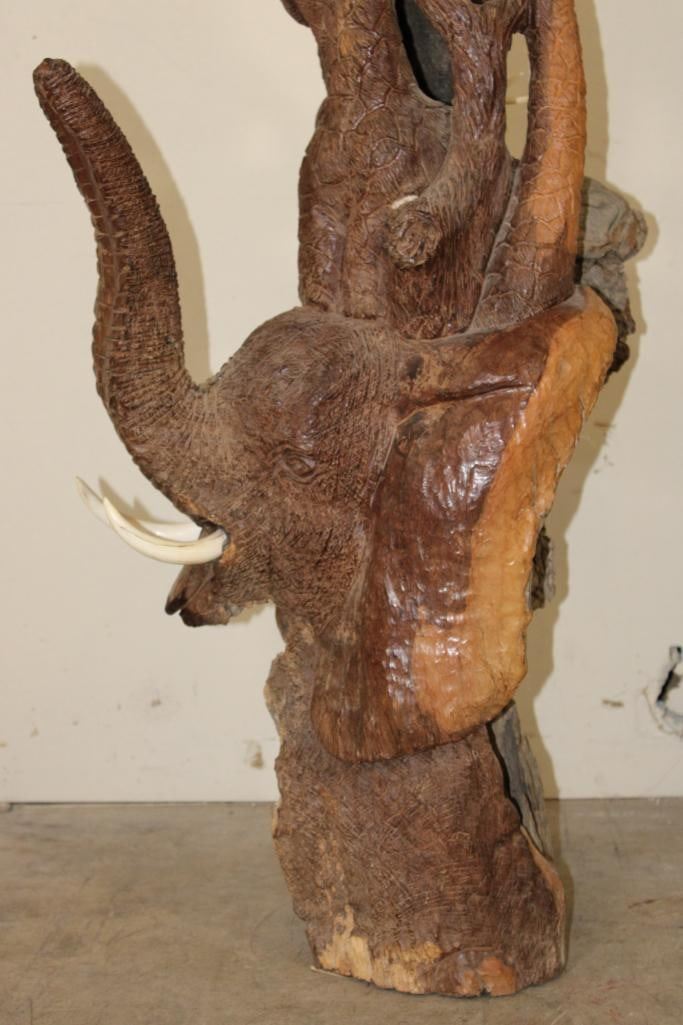 XL 4' Original Leadwood Hand-carved Sculpture "Lucky" by African artist Nhlanhla S. Nkala. This stunning sculpture depicts 3 Elephants, 2 Giraffes, and a Rhinoceros. The Elephants Tusks are believed to be carved from Warthog Tusk. The sculpture measures 51" Tall x 25" Long x 22" Wide and Weighs approximately 100 lbs. The artist has carved "Lucky. Nhlanhla. S. Nkala" into the piece. COLLECTIBLE AFRICAN ART SCULPTURES AND CARVINGS