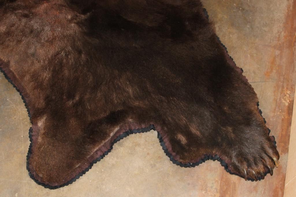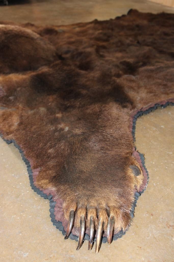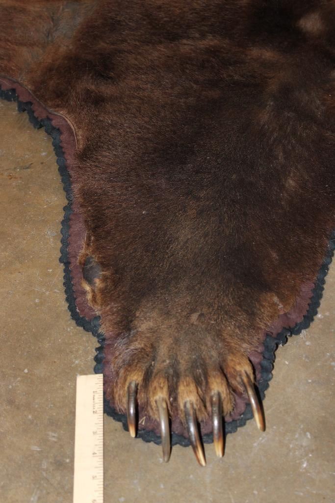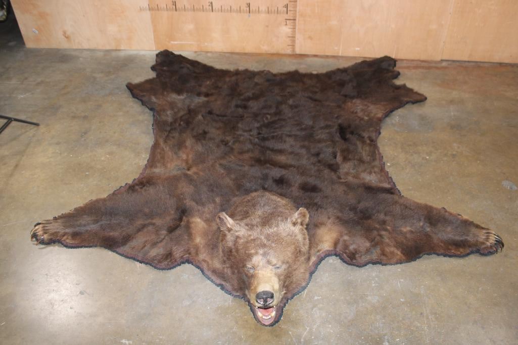 Very Nice, Newer, and Clean XL BROWN BEAR Rug mounted with its Head. It has All its Big Claws and measures 8' 7" Long x 8' 3" Wide. A thick Double Felt and Canvas have been added for Backing, plus Hanging Loops. This Brown Bear has a Great Face and is in Very Good Condition. TAXIDERMY RUGS