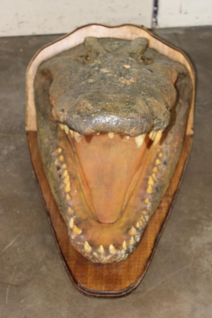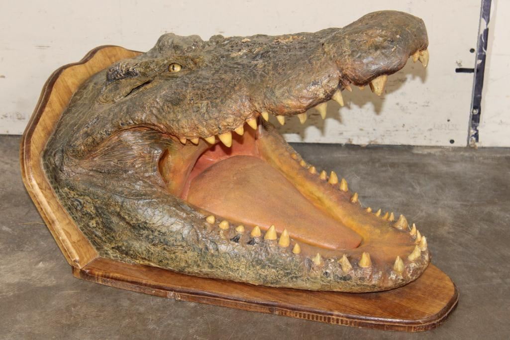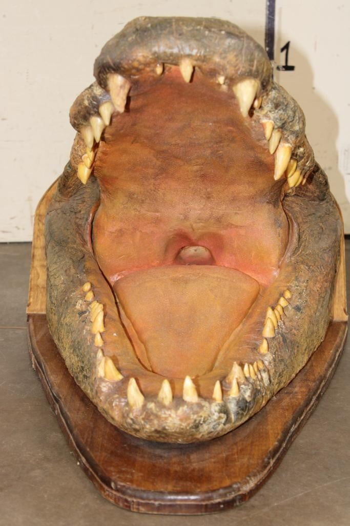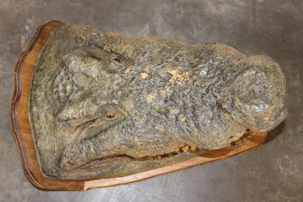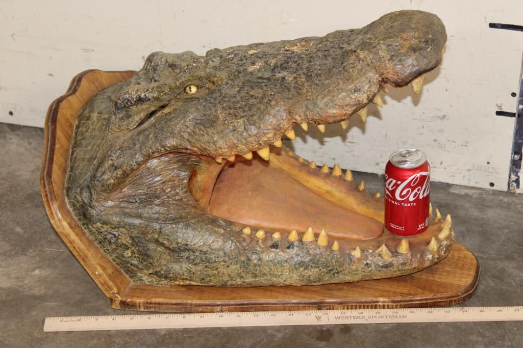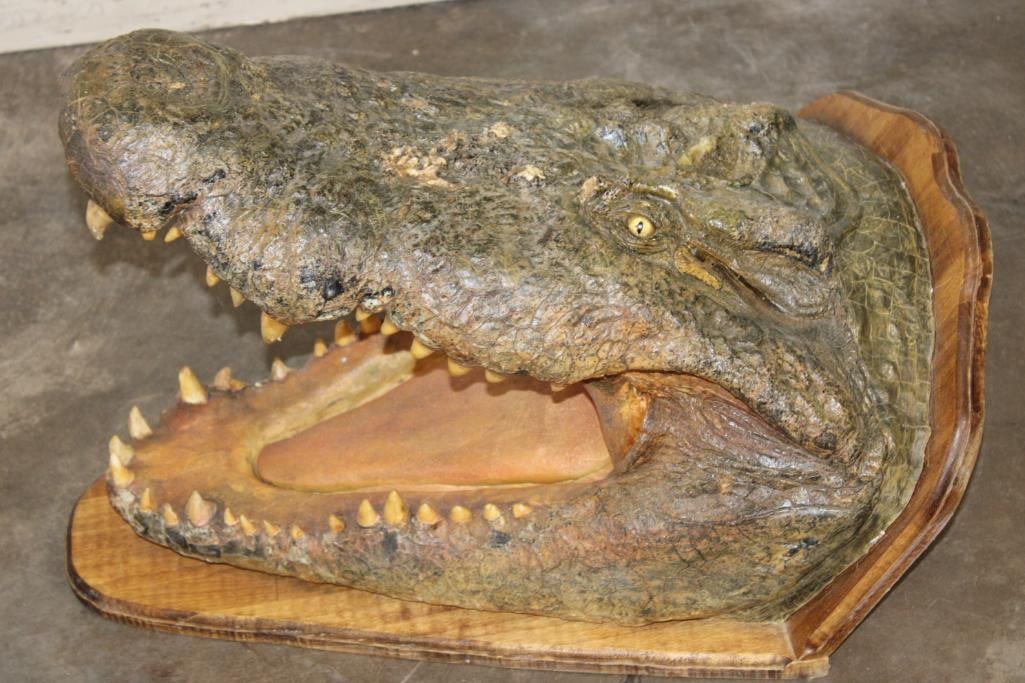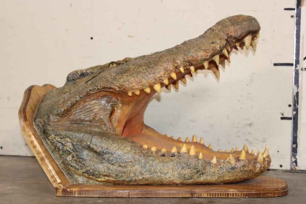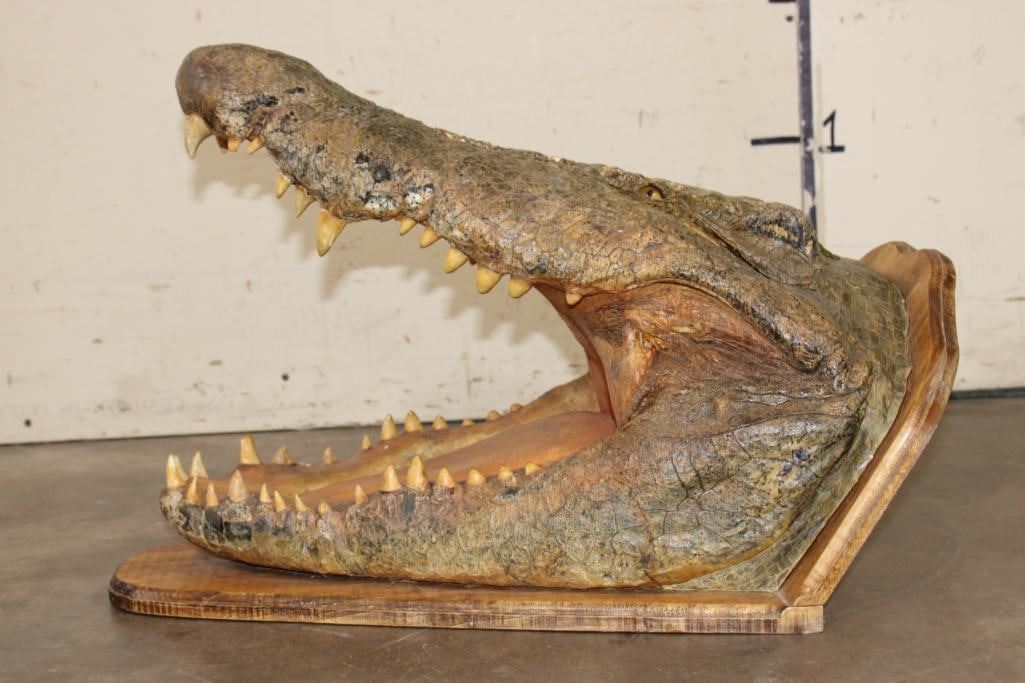 XL CROCODILE Head with *Real Skin* and *Real Teeth* mounted on a Wood Pedestal. It measures 26" Long x 17" Wide x 17" Tall. TAXIDERMY