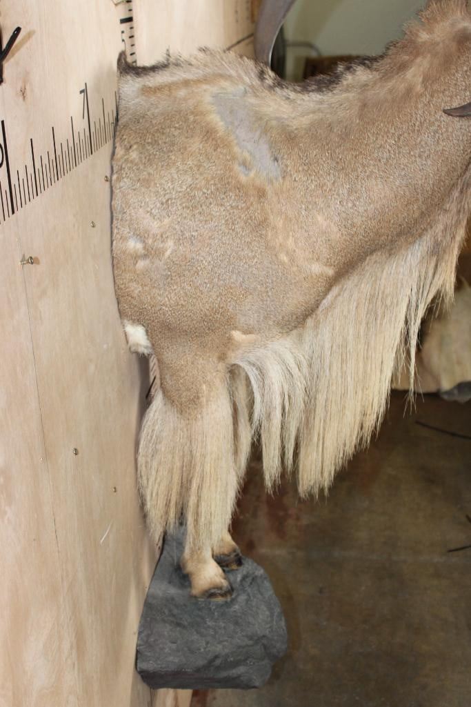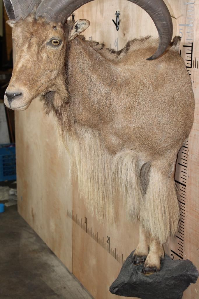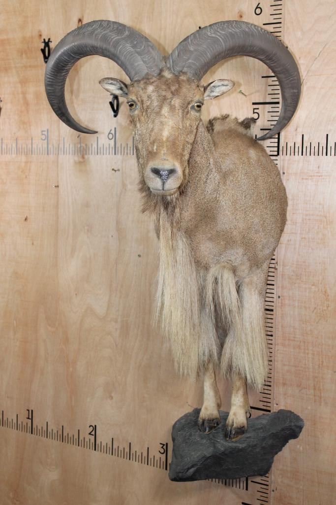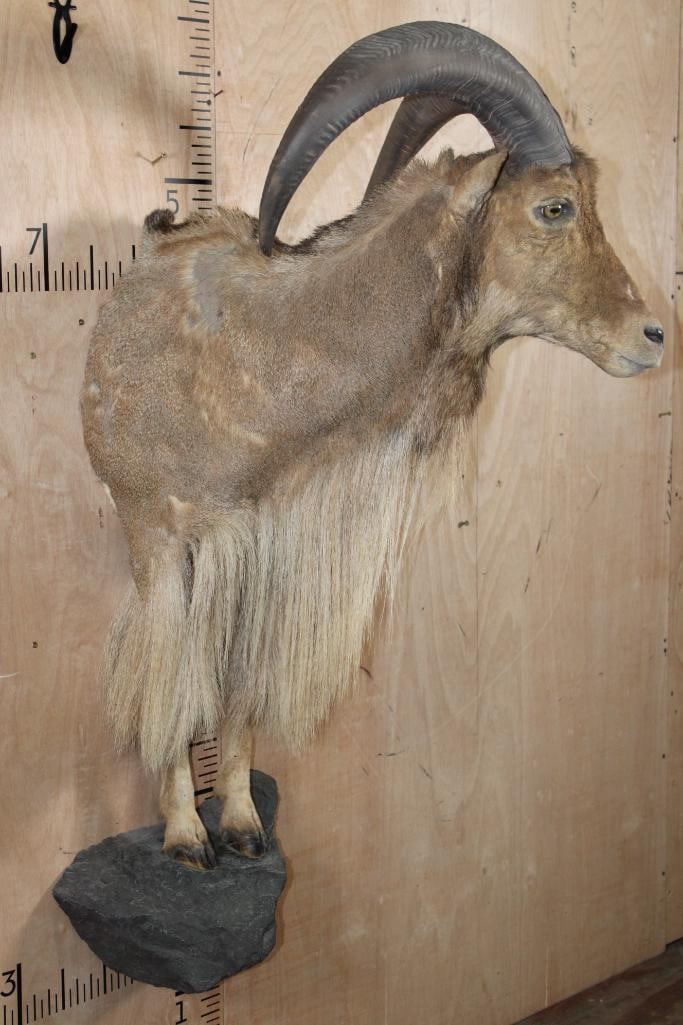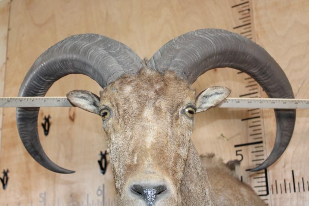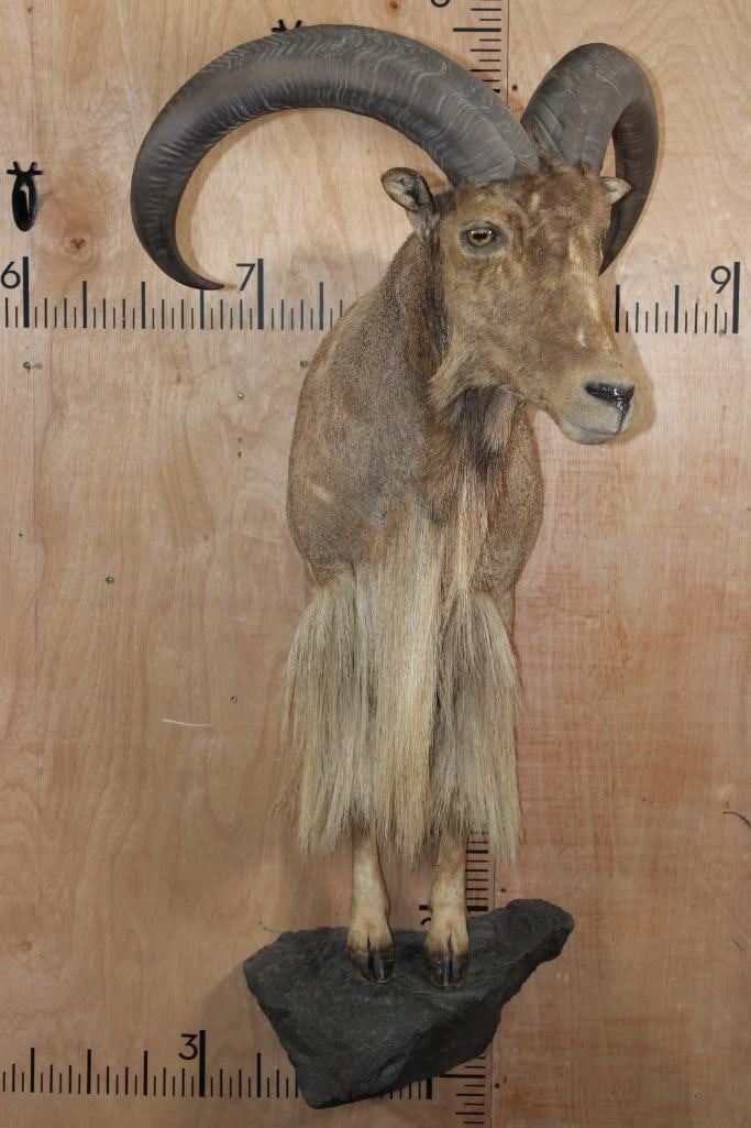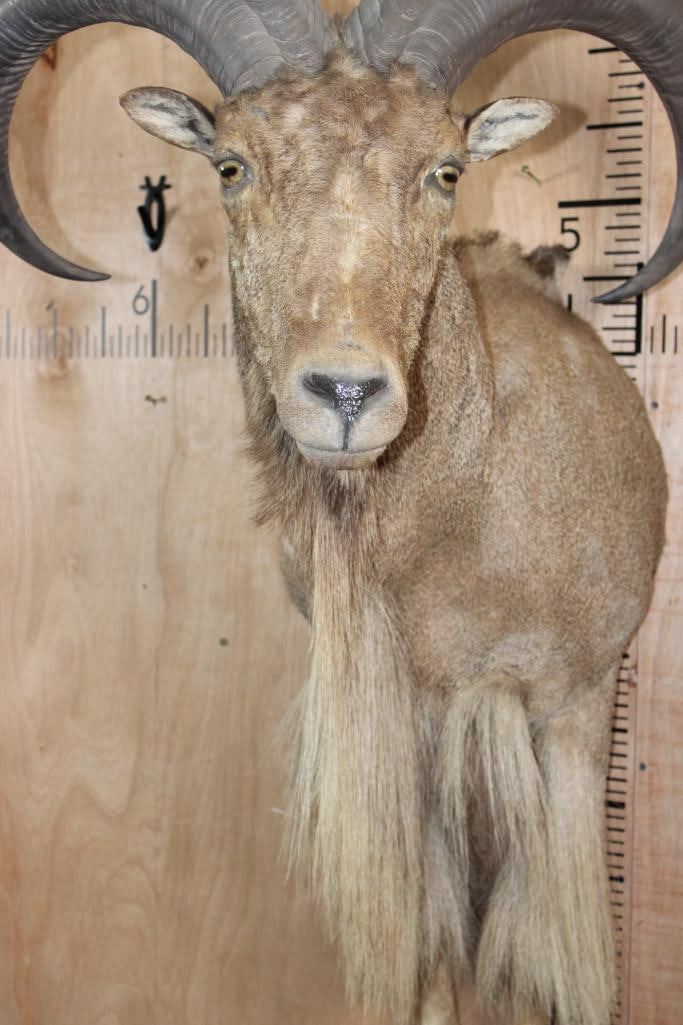 XL Half body AOUDAD. The Left Horn measures 30" Long and the Right Horn measures 30.5" Long. It is missing some hair on the right side, otherwise it is a nice mount in Good Condition. TAXIDERMY