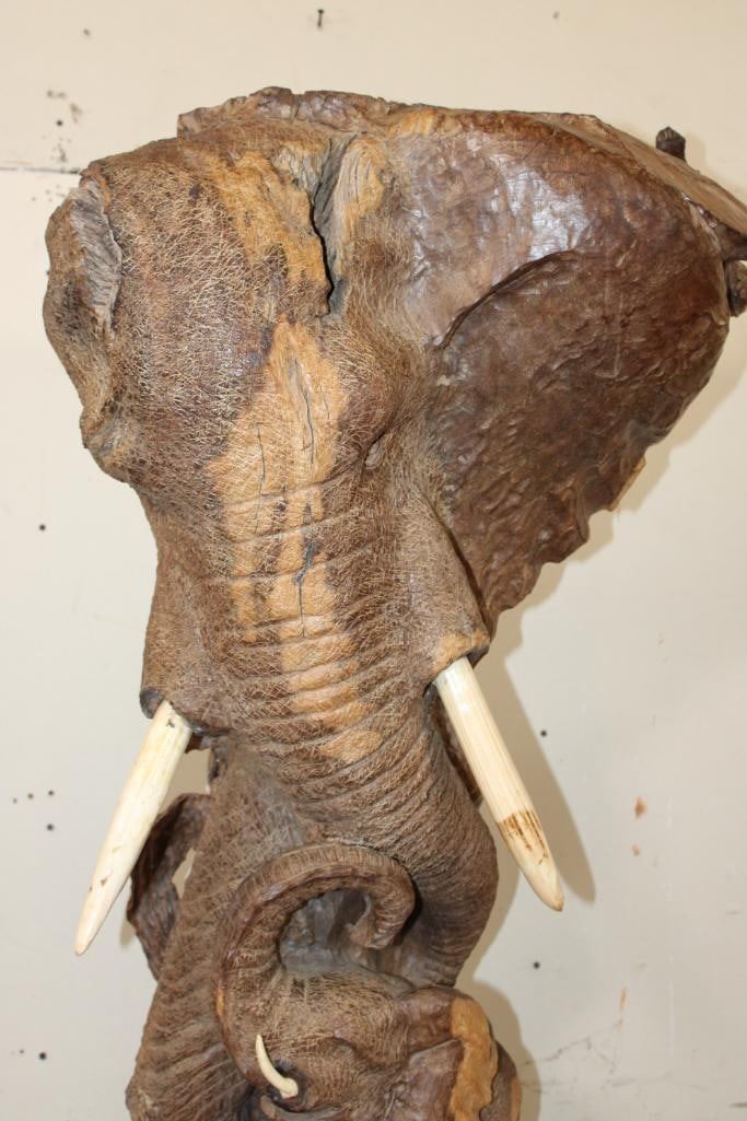 XL Leadwood Carving of a Mother Elephant and her Elephant Calf on one side and a Giraffe on the other. The Mother Elephant's Tusks are made from *Real* Hippopotamus Tooth Ivory. A Cigar Ashtray has been carved at the top of the sculpture. The beautiful carving measures 46" Tall x 25" Wide (at the top) x 23" Wide (at the Bottom). The sculpture Weighs over 200 lbs. COLLECTIBLE AFRICAN ART AND CARVINGS