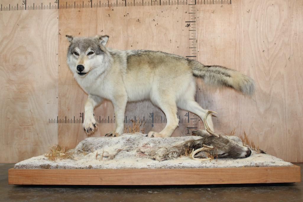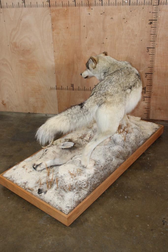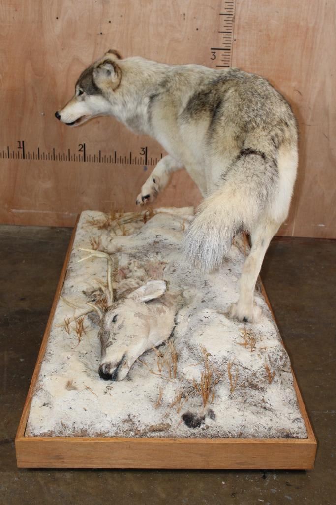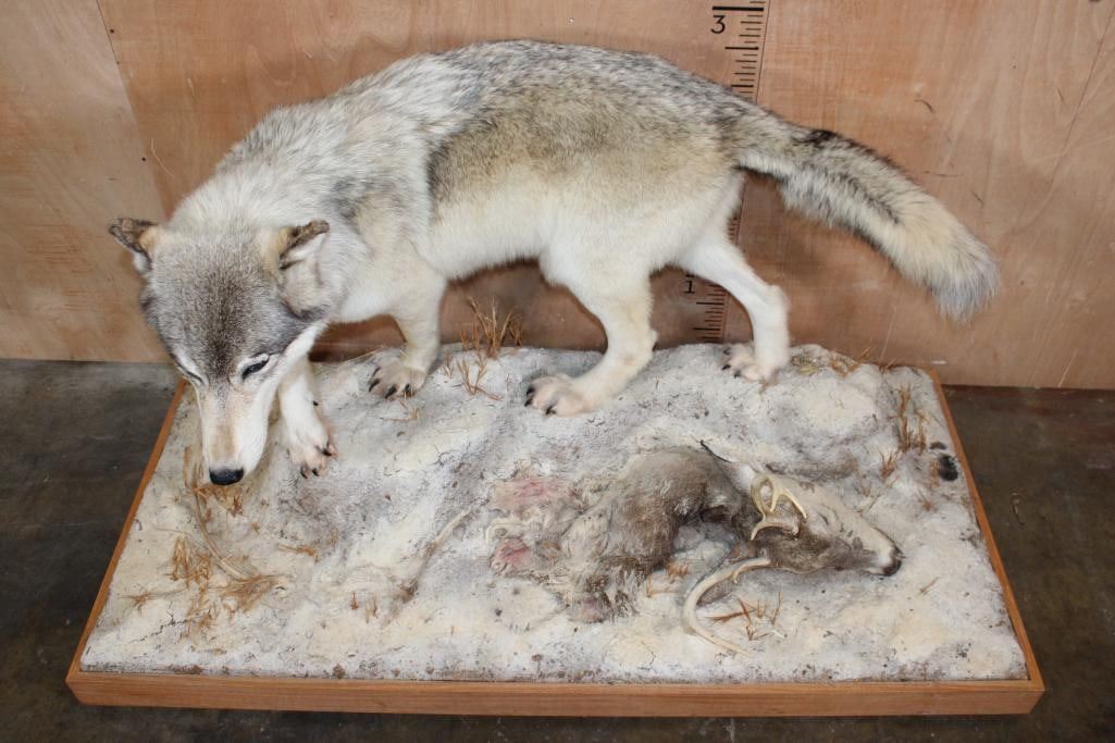 Incredible XL Life-sized WOLF. It is mounted on a decorative Snowy Base with Wheels and includes a Whitetail Deer Head. It measures 67" Long x 32" Wide x 38" Tall. This is a High Quality Mount in Very Good Condition. TAXIDERMY
