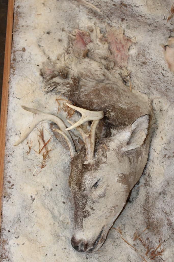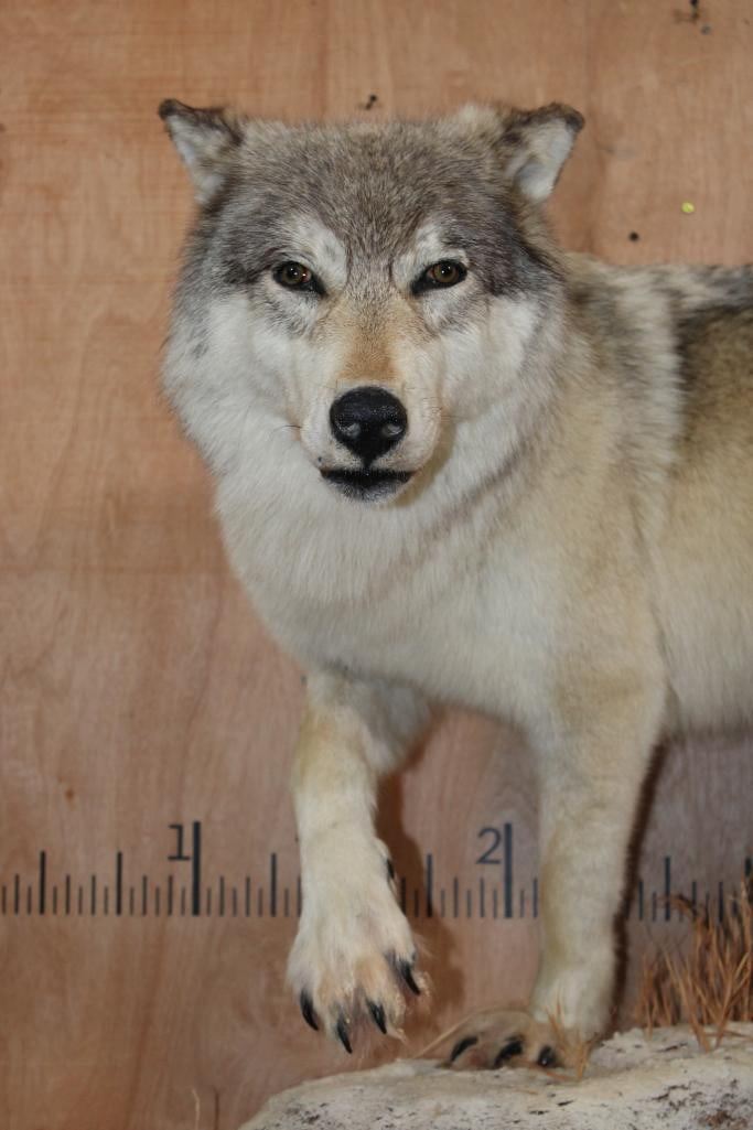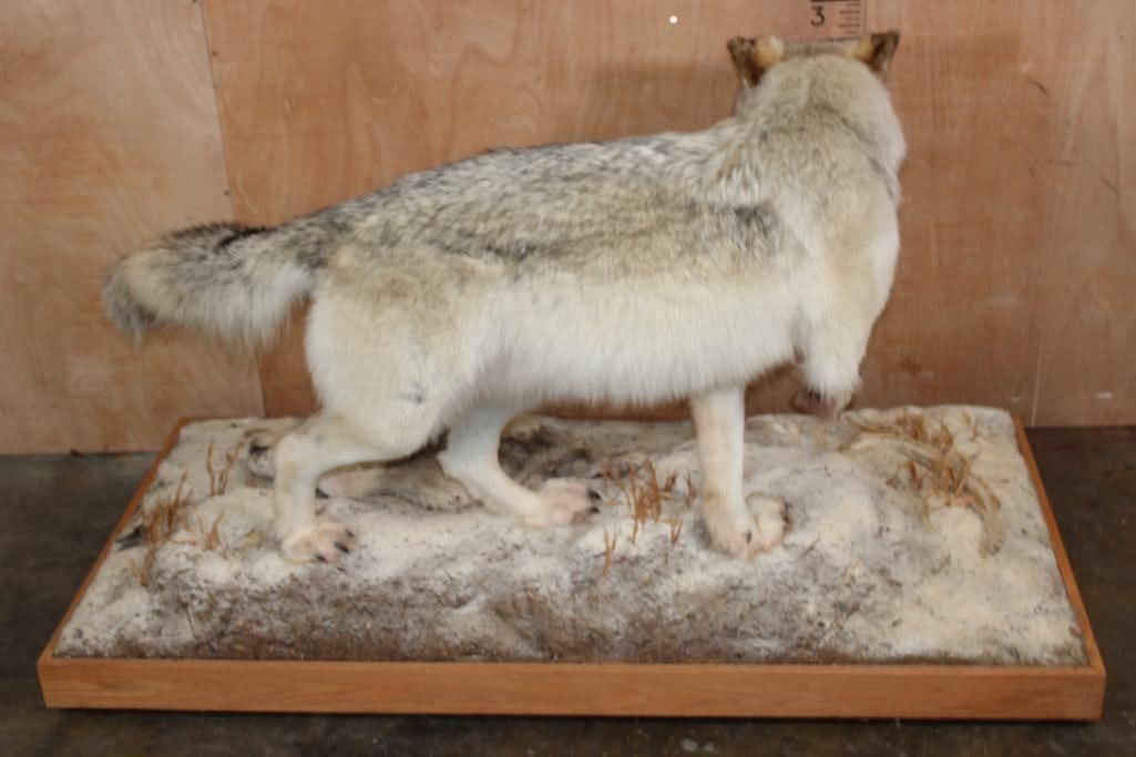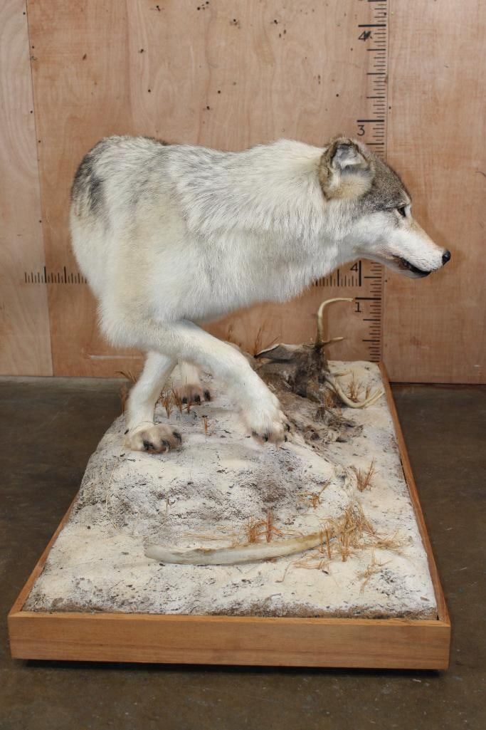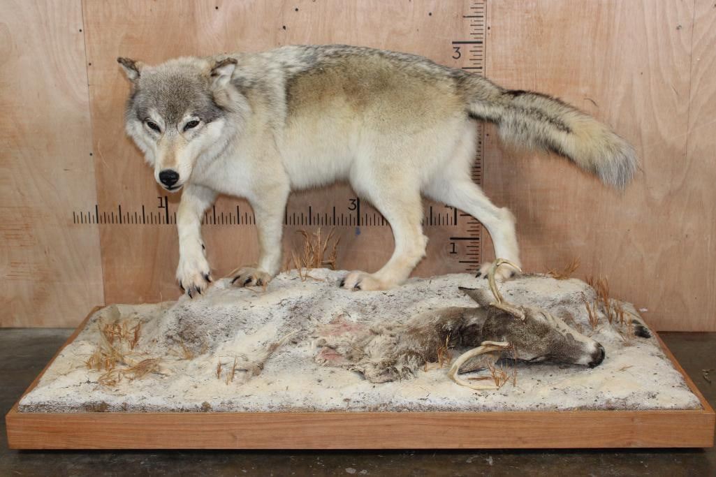 Incredible XL Life-sized WOLF. It is mounted on a decorative Snowy Base with Wheels and includes a Whitetail Deer Head. It measures 67" Long x 32" Wide x 38" Tall. This is a High Quality Mount in Very Good Condition. TAXIDERMY