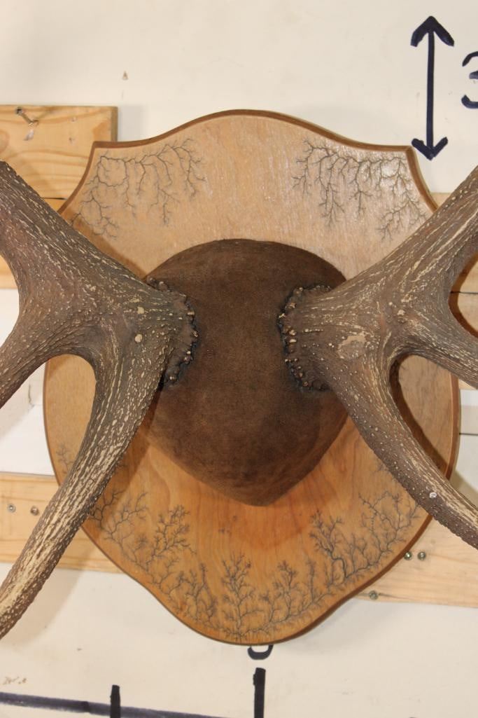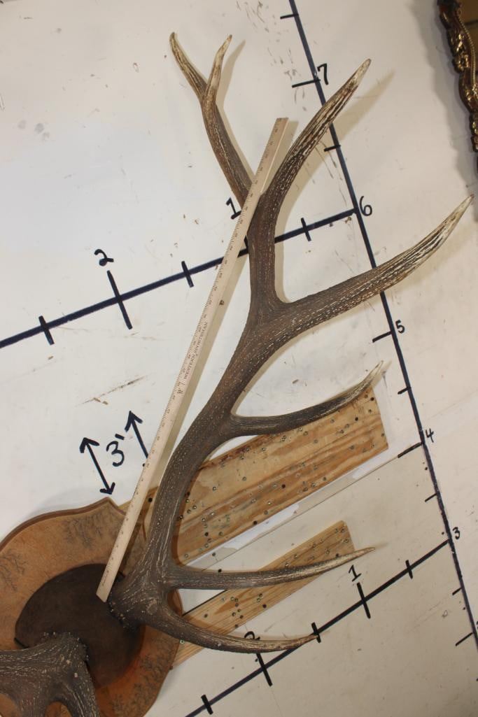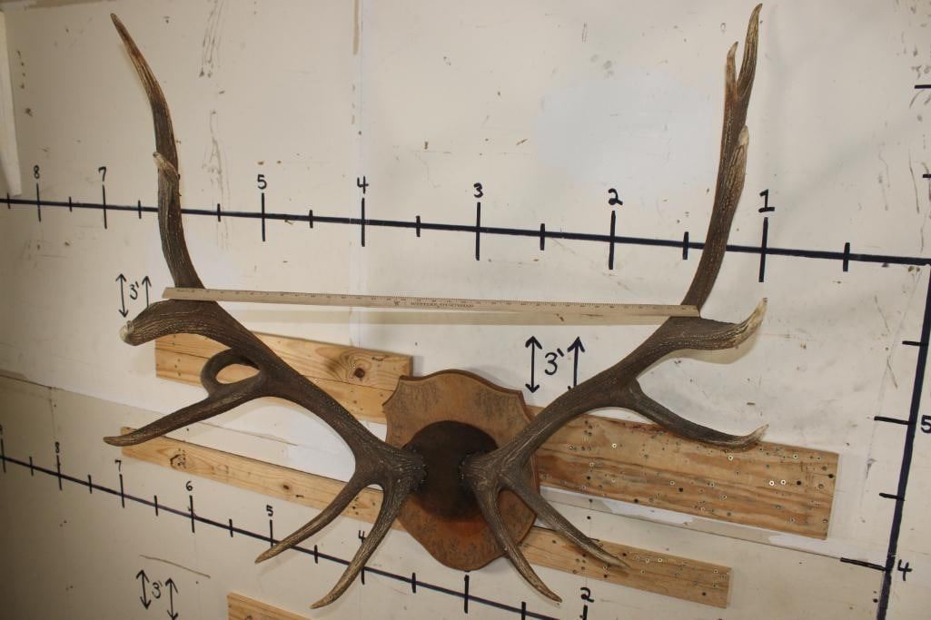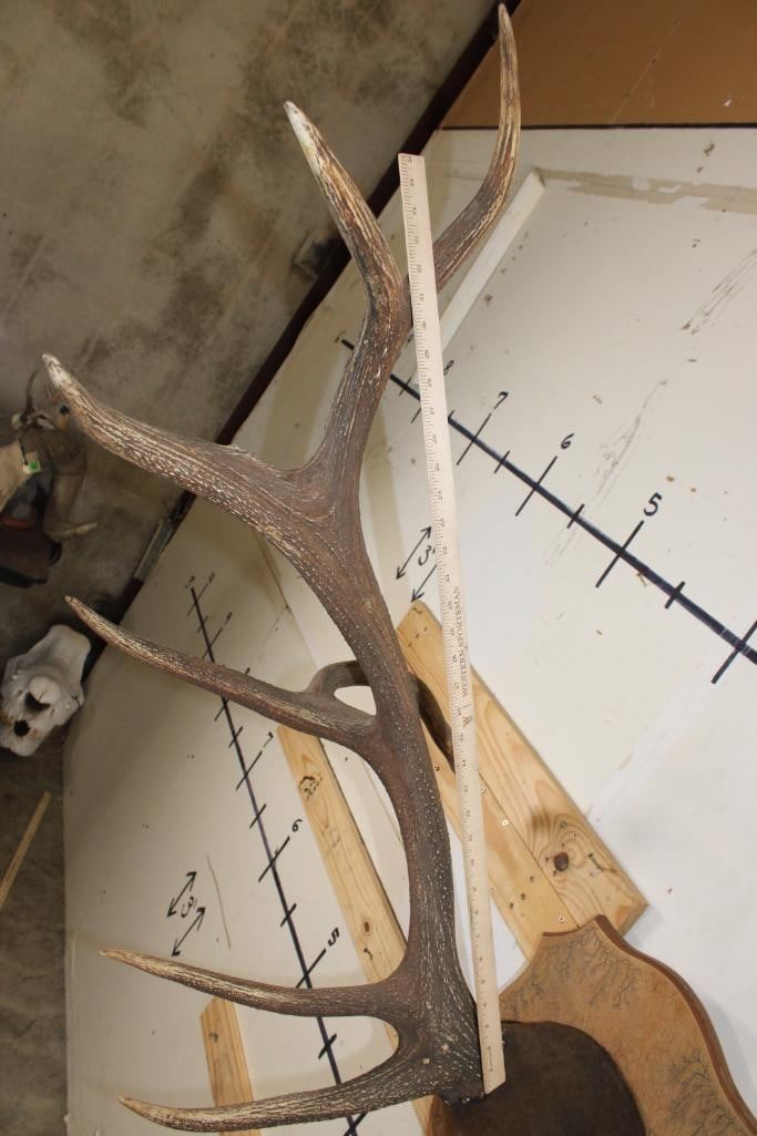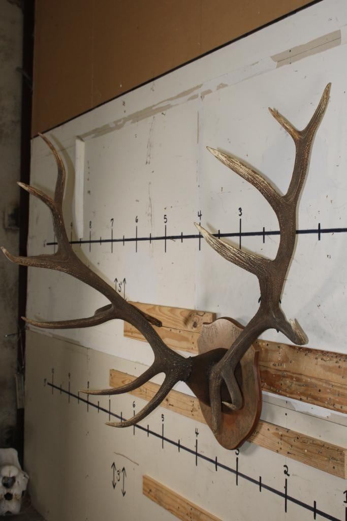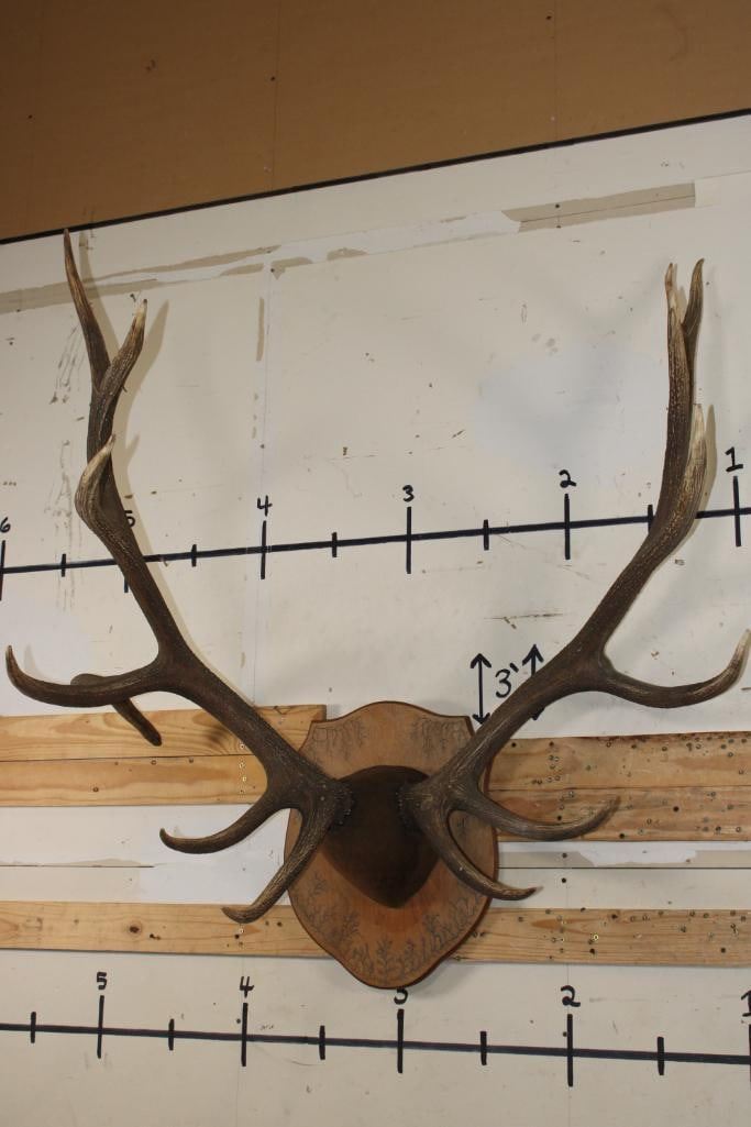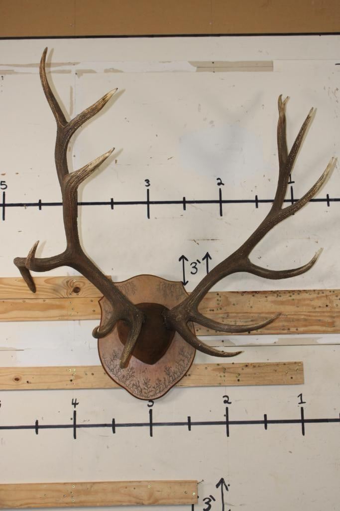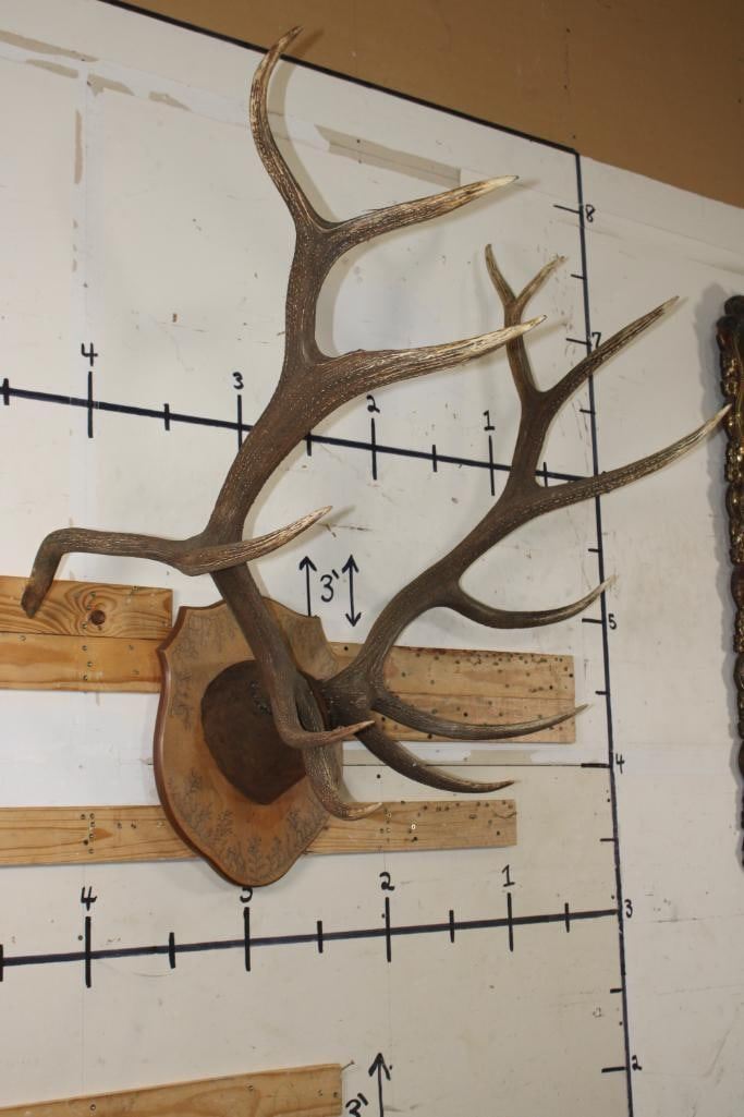 XL 14-Point ELK Antler Rack. It has been mounted on a nice Fractal Wood Burned Plaque and has a 44.5" Spread. TAXIDERMY
