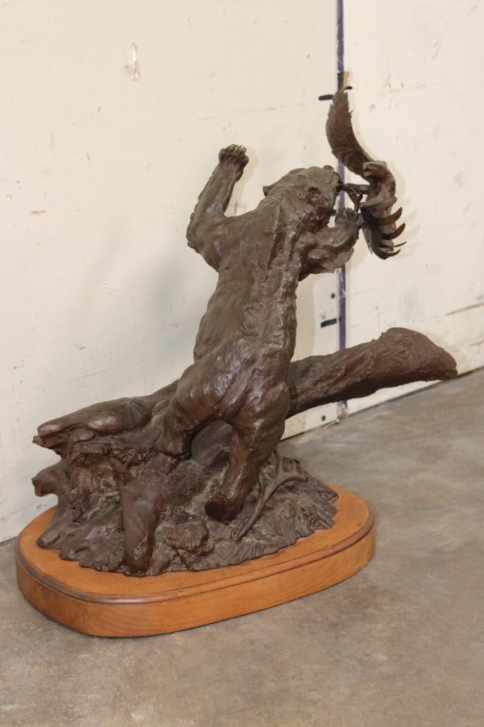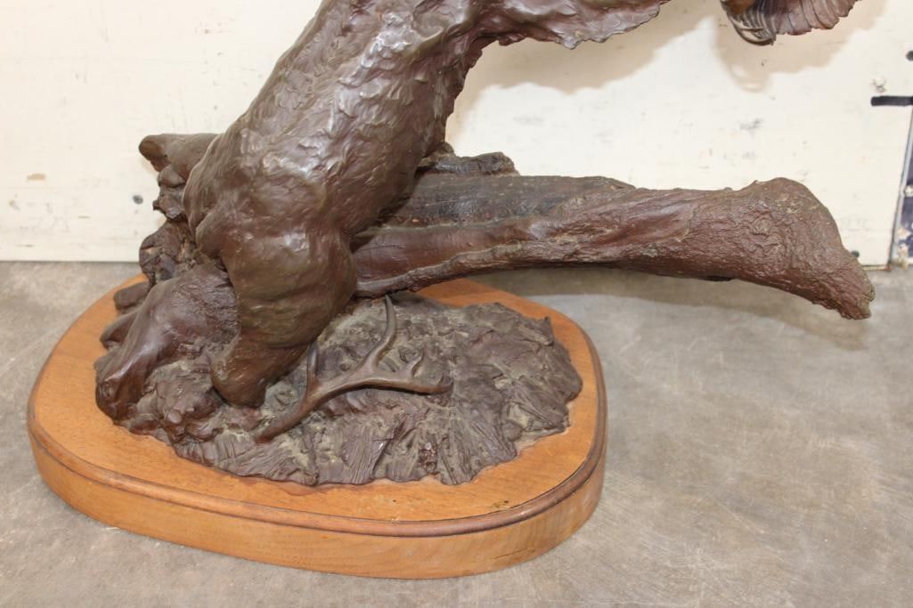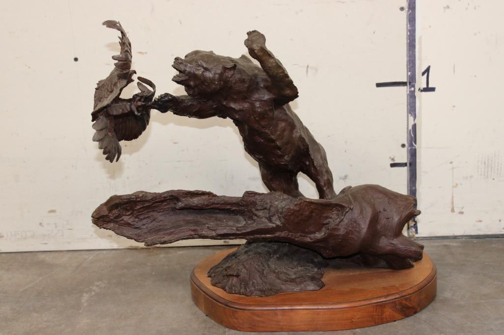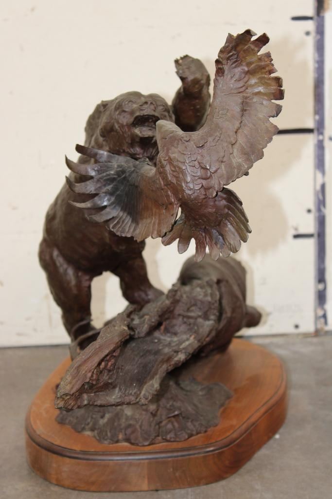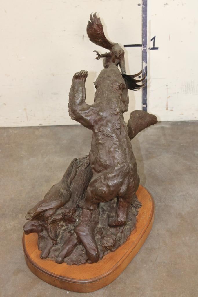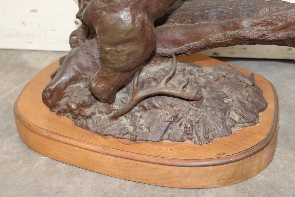 Limited Edition XL Original BRONZE Sculpture by Johnathan Bronson (American 1952-2009), Numbered #4/24. It depicts a Bear, an Eagle on a Log, and an Antler Shed on a circular Wooden Base. It measures 20" Tall x 22" Long x 13.5" Wide and Weighs: 54 lbs 13 oz. COLLECTIBLE ART BRONZE SCULPTURES