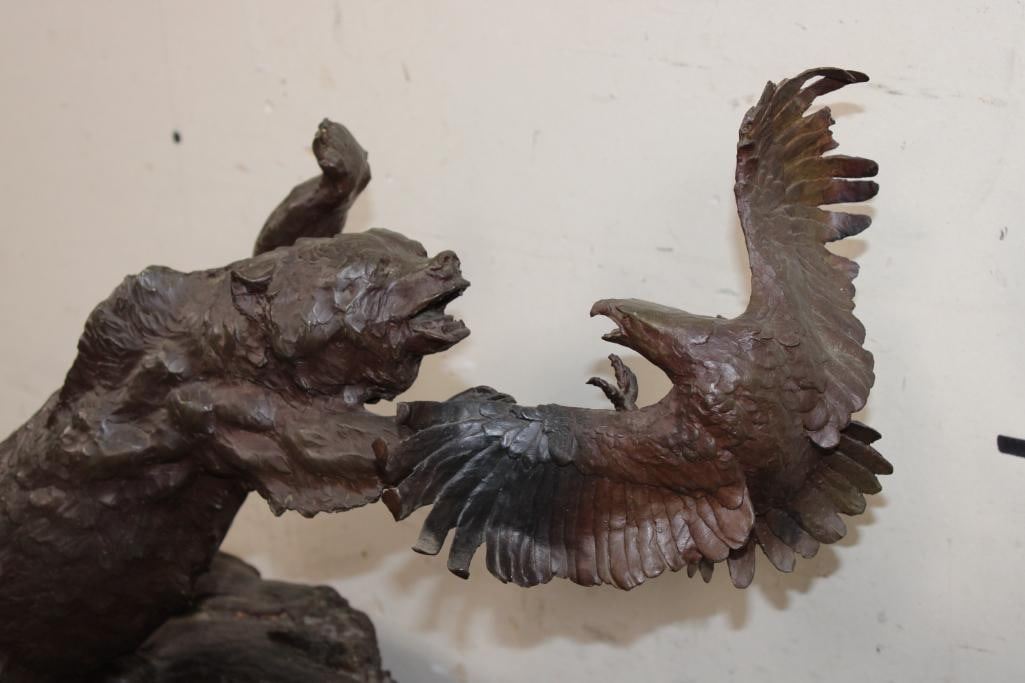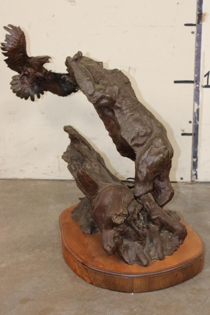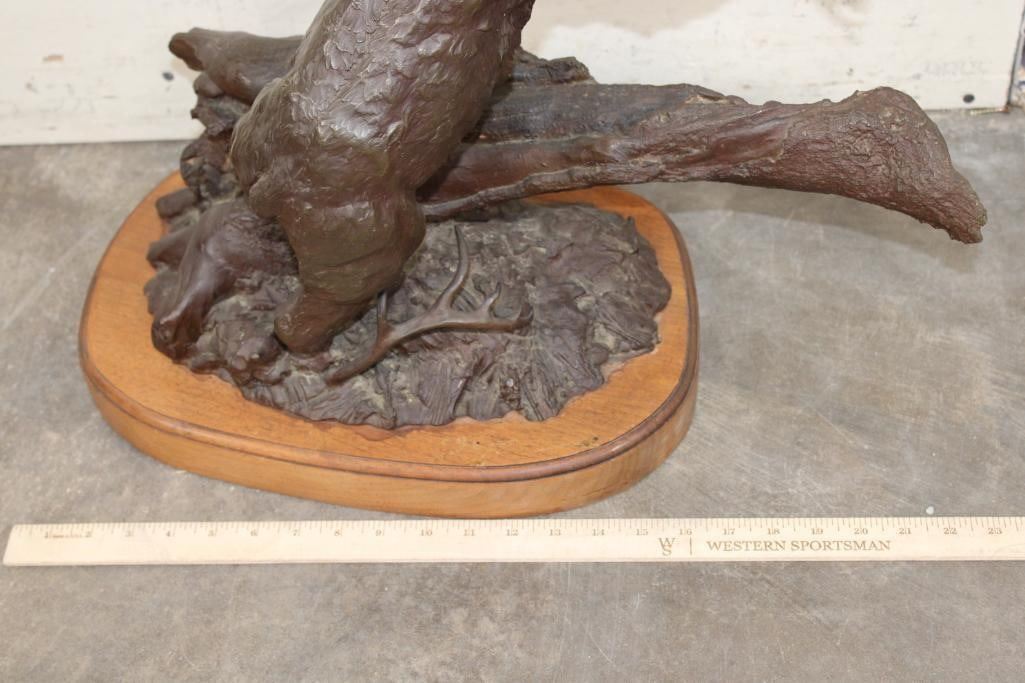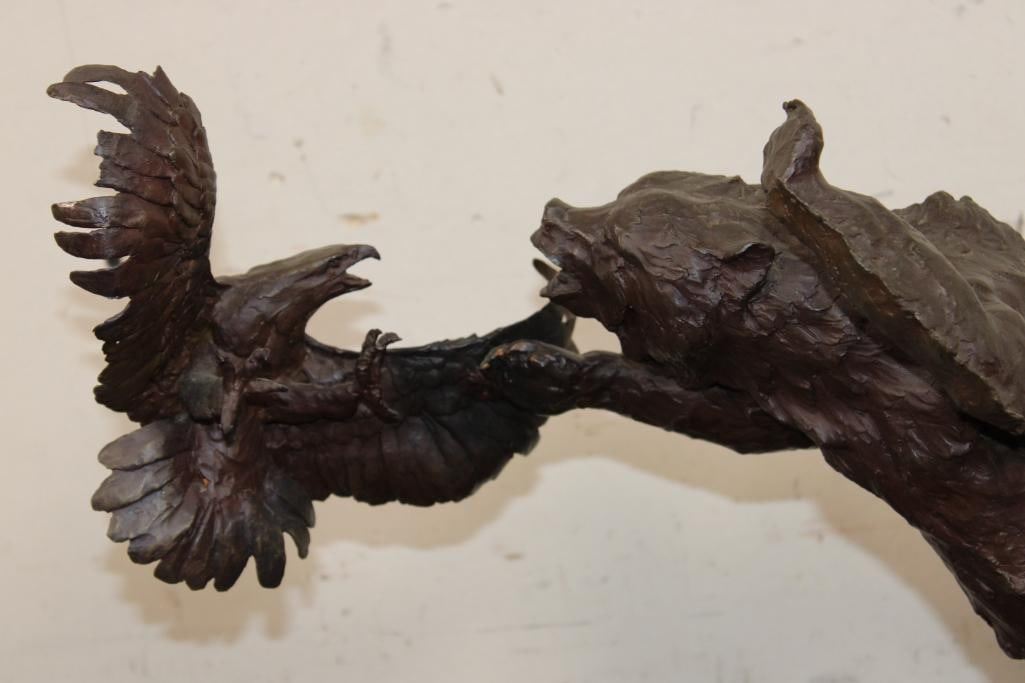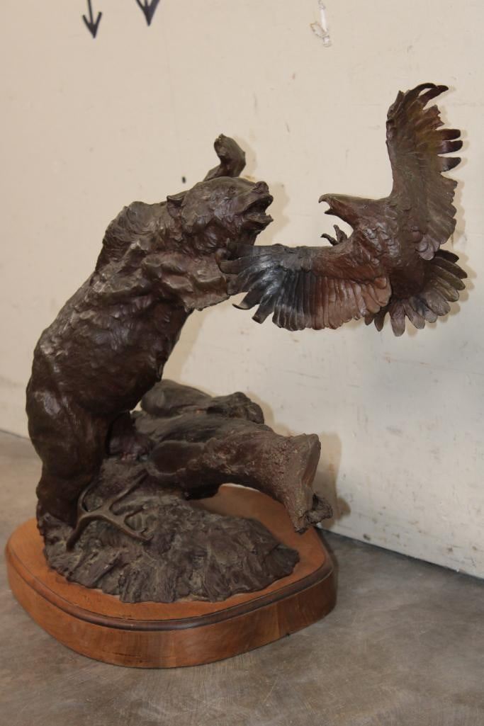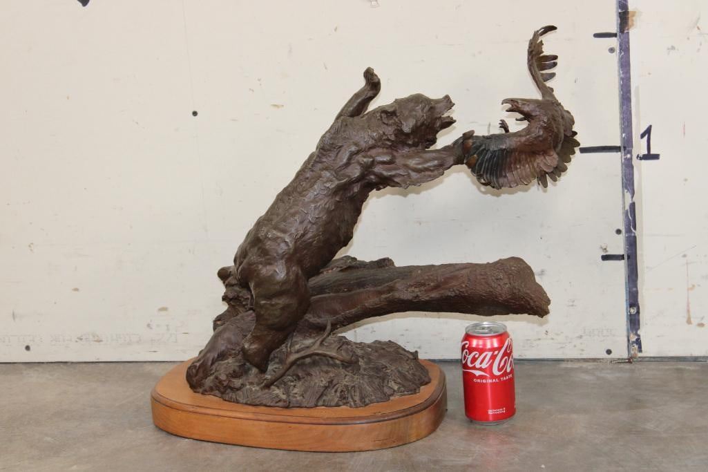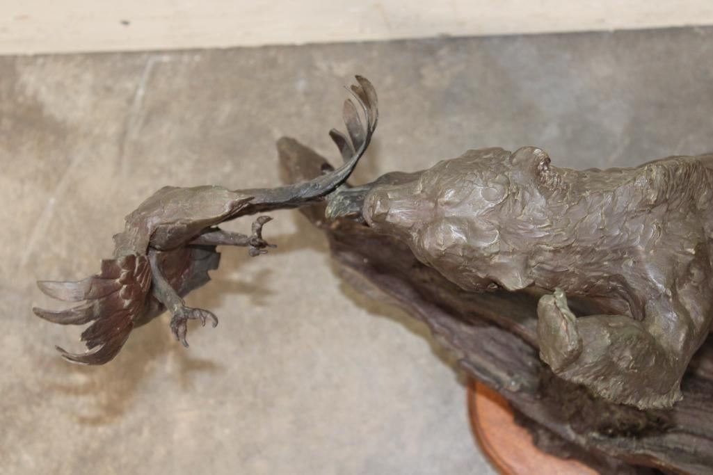 Limited Edition XL Original BRONZE Sculpture by Johnathan Bronson (American 1952-2009), Numbered #4/24. It depicts a Bear, an Eagle on a Log, and an Antler Shed on a circular Wooden Base. It measures 20" Tall x 22" Long x 13.5" Wide and Weighs: 54 lbs 13 oz. COLLECTIBLE ART BRONZE SCULPTURES
