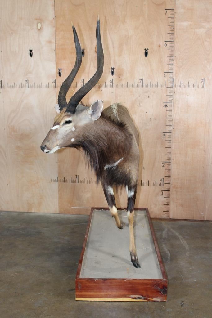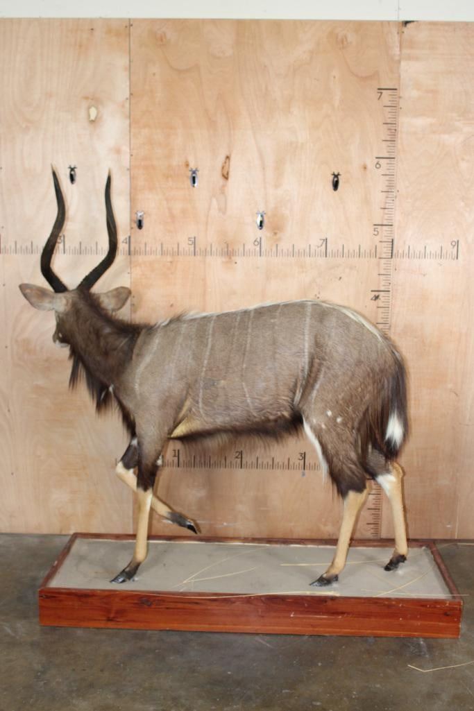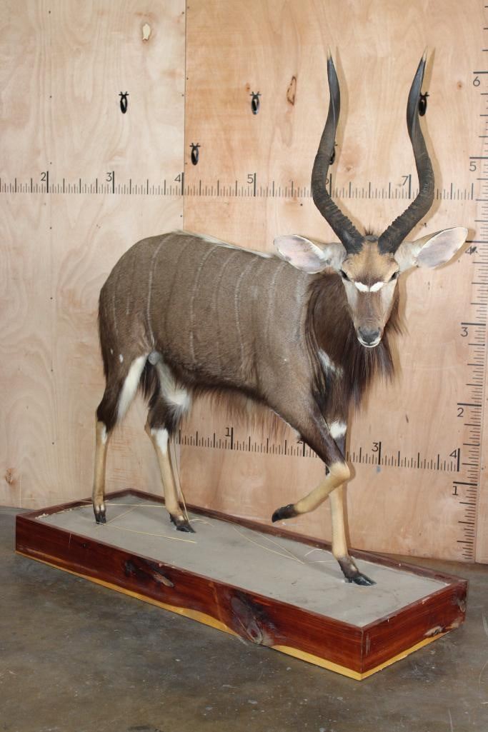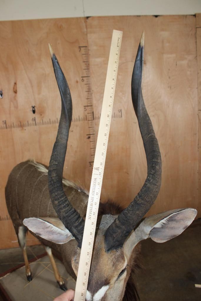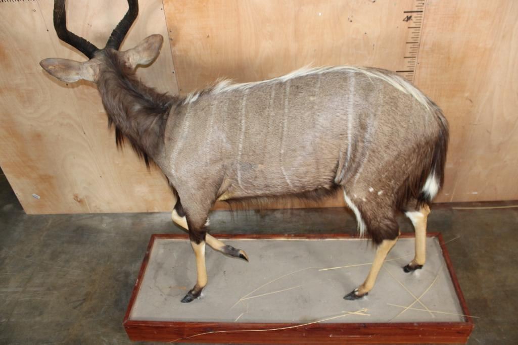 Nice XL Life-sized NYALA. The Left Horn measures 28 1/8" Long and the Right Horn measures 27.5" Long. It is mounted on a Wood Base with No Wheels that measures 63.25" Long x 23" Wide. It is in Good Condition. TAXIDERMY