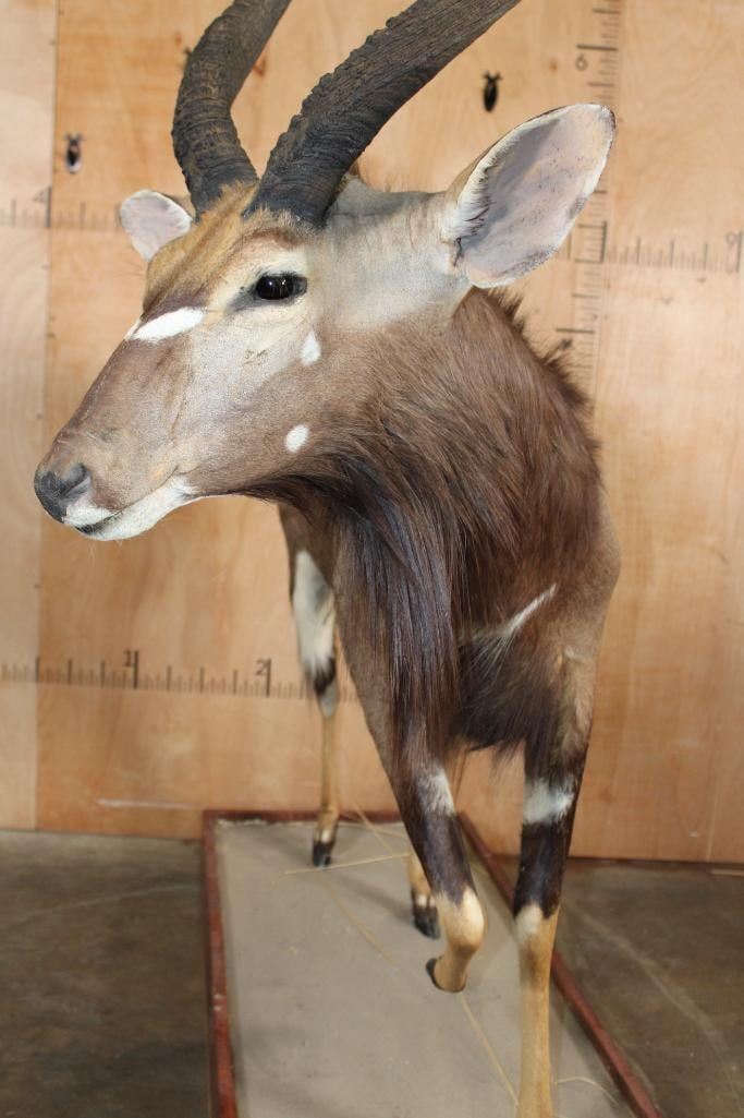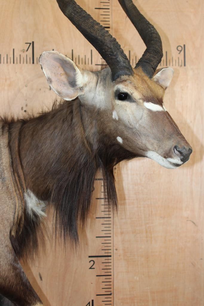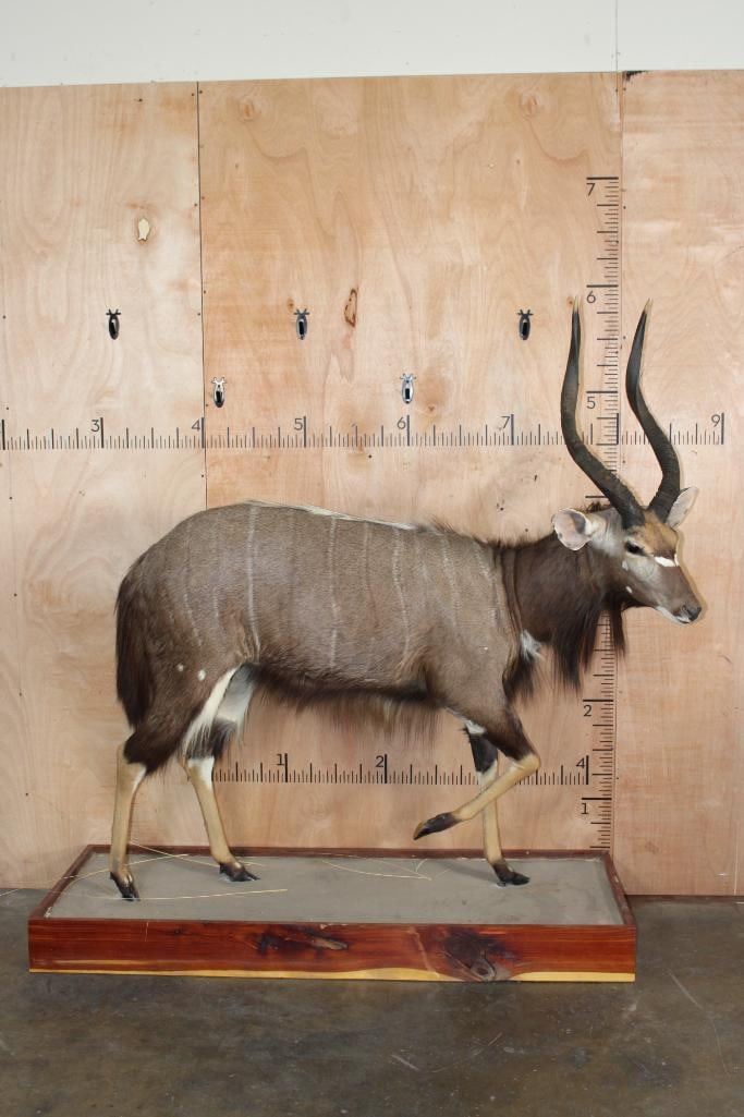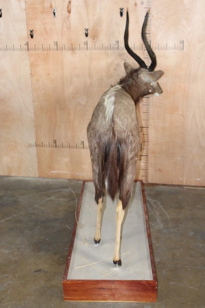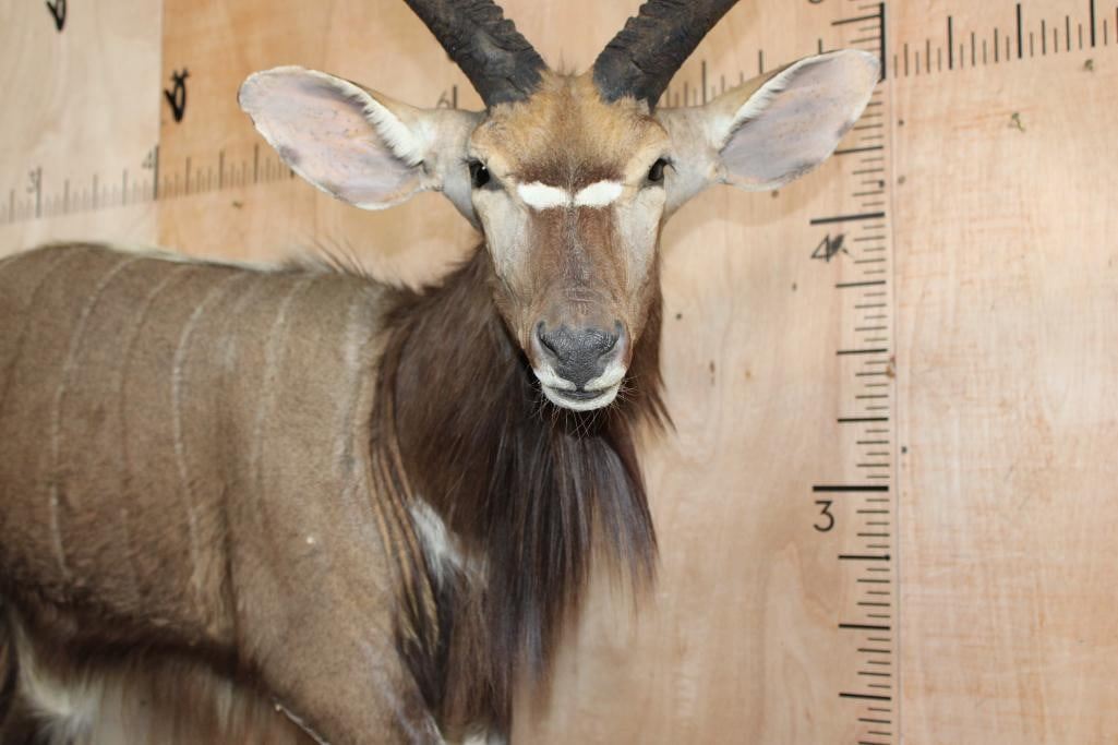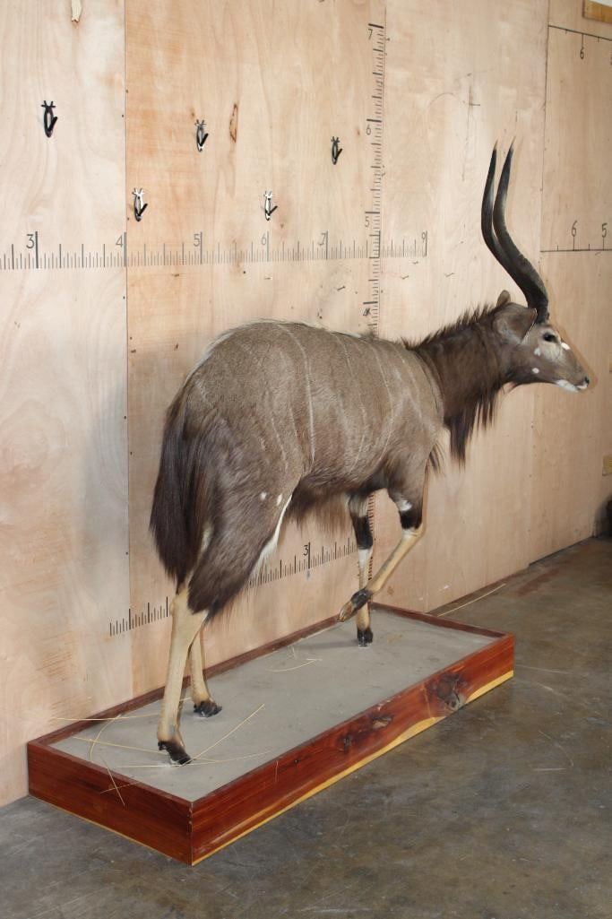 Nice XL Life-sized NYALA. The Left Horn measures 28 1/8" Long and the Right Horn measures 27.5" Long. It is mounted on a Wood Base with No Wheels that measures 63.25" Long x 23" Wide. It is in Good Condition. TAXIDERMY