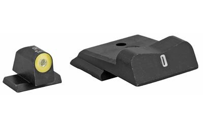 XS DXT2 Big Dot Night Sights offer the best front sight visibility in all lighting conditions. DXT2 Big Dot sights drive focus to the front sight using a high-contrast front and a V-notch rear for an unobstructed view of the front sight. DXT2 Big Dot front sights use a patent pending glow dot that absorbs light and glows in low light levels before it is dark enough to see the tritium. Optic Yellow is the best option for low light and has the brightest glow intensity. Primarily based on the white light spectrum" optic yellow is very reflective and will excite the photoluminescent properties of the dot faster than any other color. The increased surface area of the convex dot increases light absorption" intensifying the charge of the glow properties of the dot. The dot-the "i" sight picture" with a tritium dot in the front sight and a tritium bar in the rear" prevents confusing the front and rear sight in high-stress situations. The wide field of view increases visibility of the front sight and of the threat downrange.