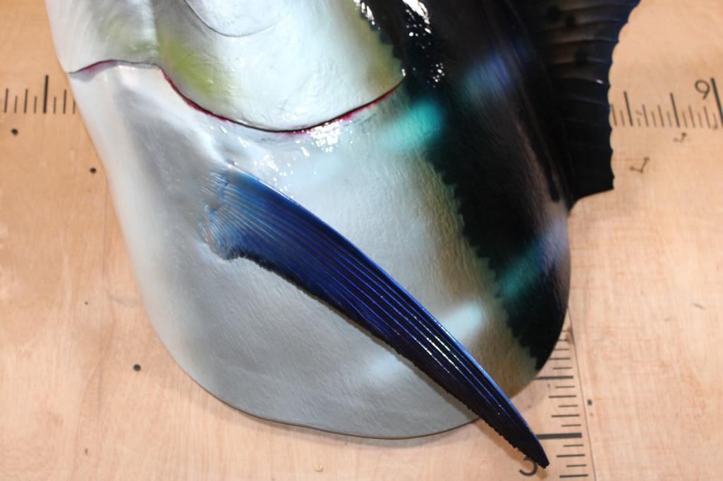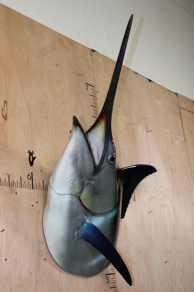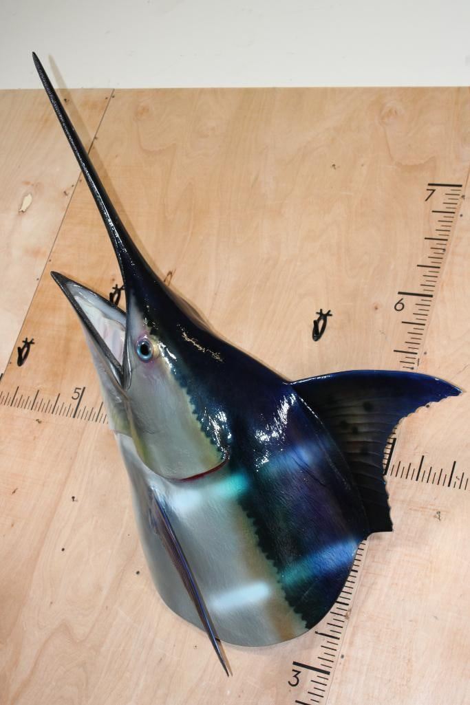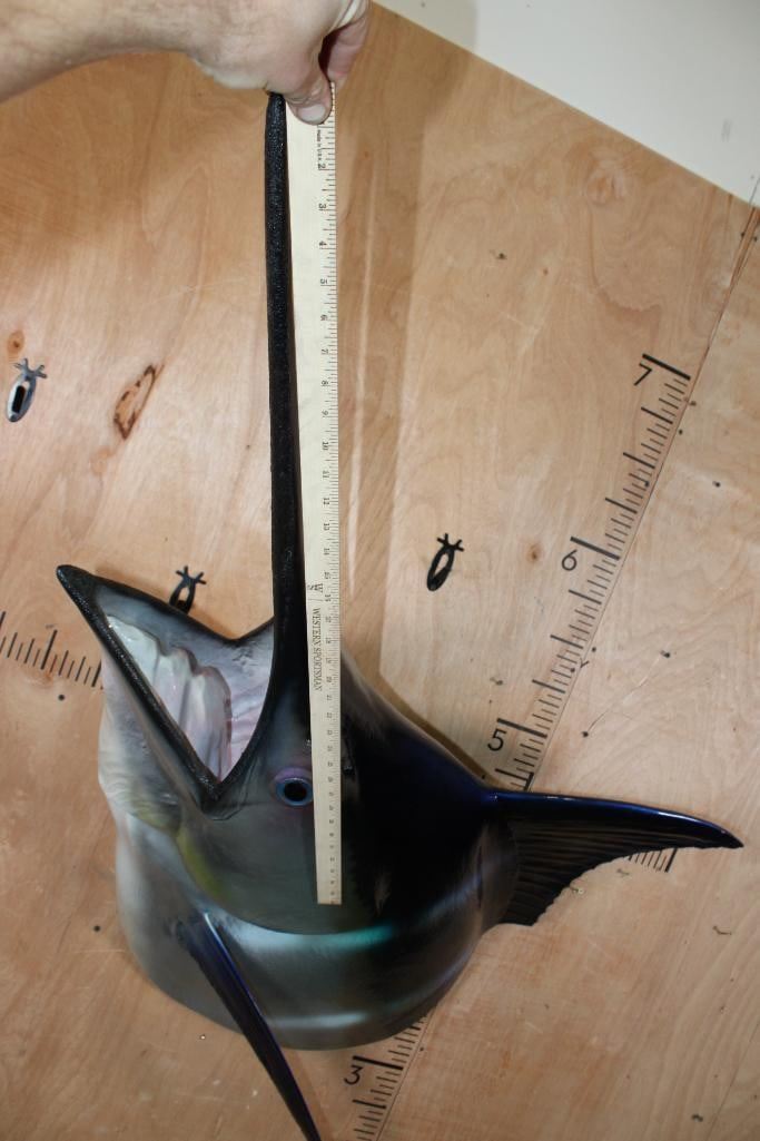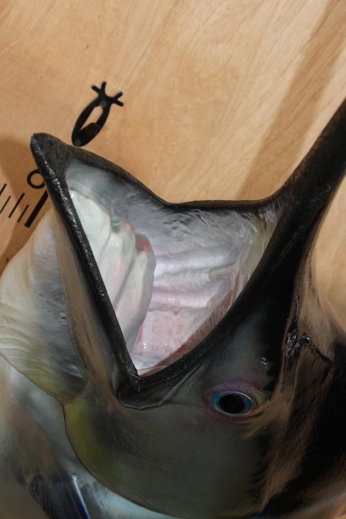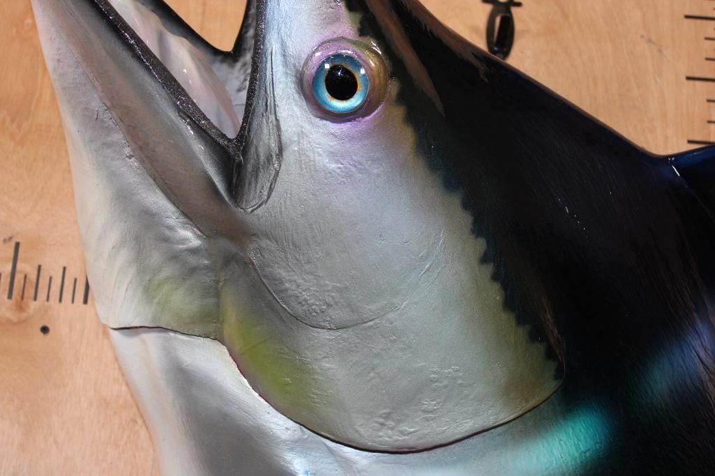Very Nice XXL 1/3 Body MARLIN Reproduction Mount. It measures 55.5" Long x 35" Wide x 32" Depth and is in Very Good Condition. Marlins, an apex predator, are among the fastest marine swimmers. The family's common name is thought to derive from their resemblance to a sailor's "marlinspike". TAXIDERMY FISH