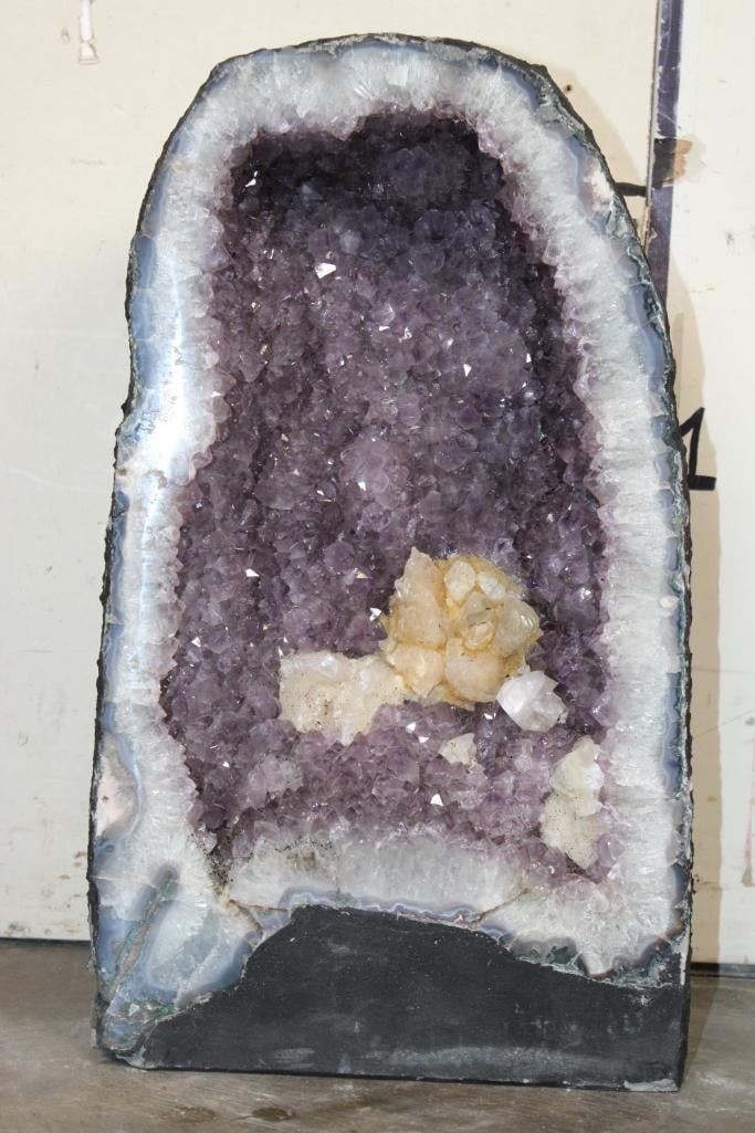 XXL AMETHYST CRYSTAL GEODE CATHEDRAL with a Clear Quartz Cluster from Brazil. It measures 19.75" Tall x 11.75" Wide x 9.5" Depth and the Total Weight is 100.75 lbs or 45.8 kg. ROCKS MINERALS FOSSILS