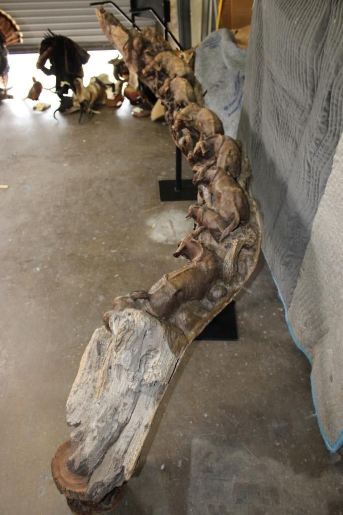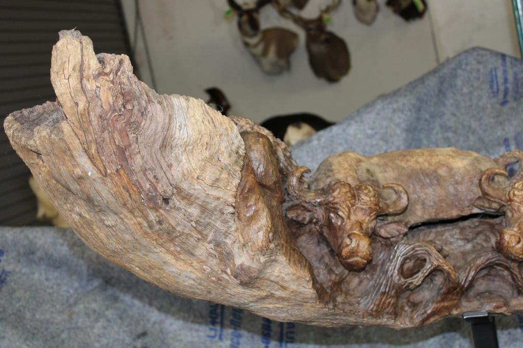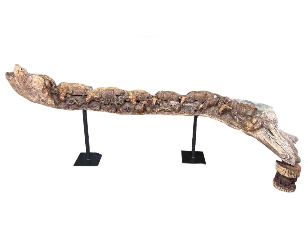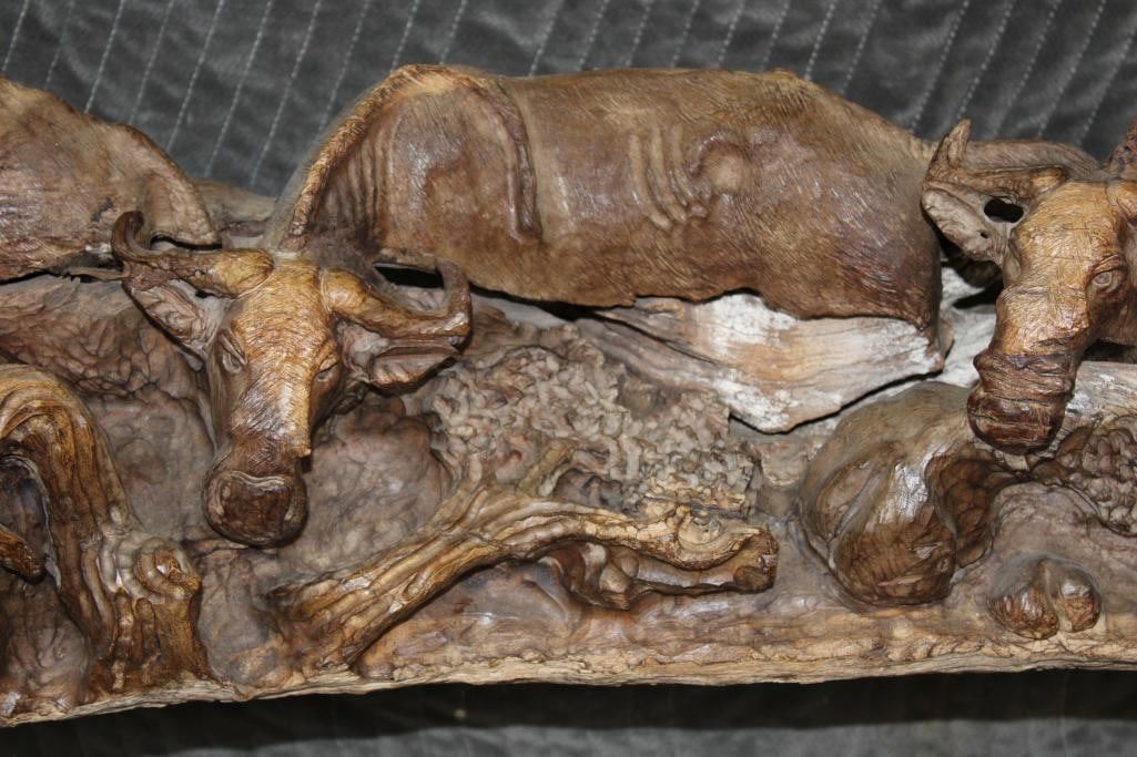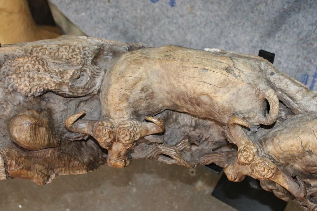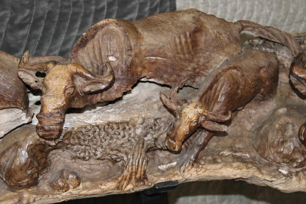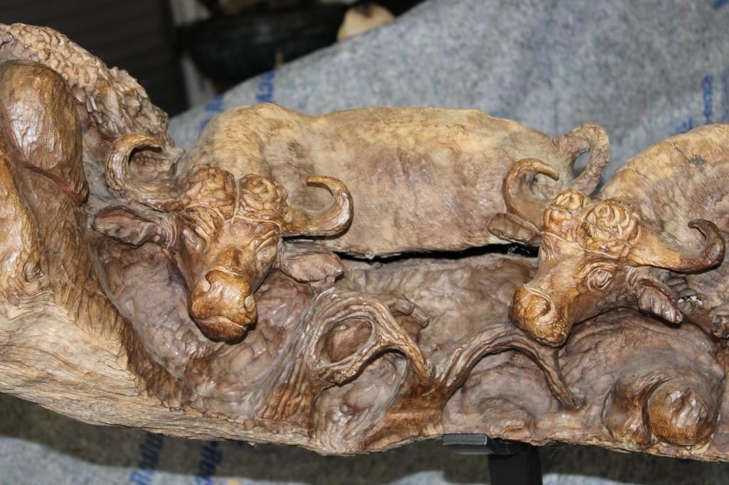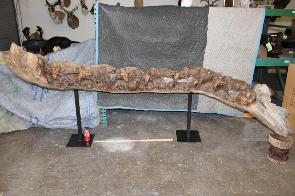 XXL 8' 10" Long Original Leadwood Carving of 3 CAPE BUFFALO and 4 WILDEBEEST by African artist Robert Nzali. The Sculpture has been masterfully carved from a single piece of a leadwood tree and measures 8'10" Long x 12" Thick x 48" Tall. It has been mounted on a Custom 2 piece Metal Stand Base with the 3rd Leg being part of the Leadwood sculpture. The sculpture is removable from the Base. COLLECTIBLE AFRICAN ART CARVINGS AND SCULPTURES *This item was sold in our last auction. The buyer did not pay, it is being resold*.
