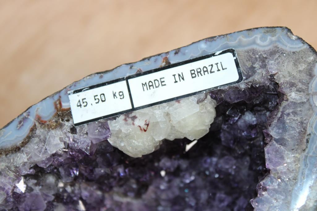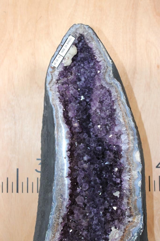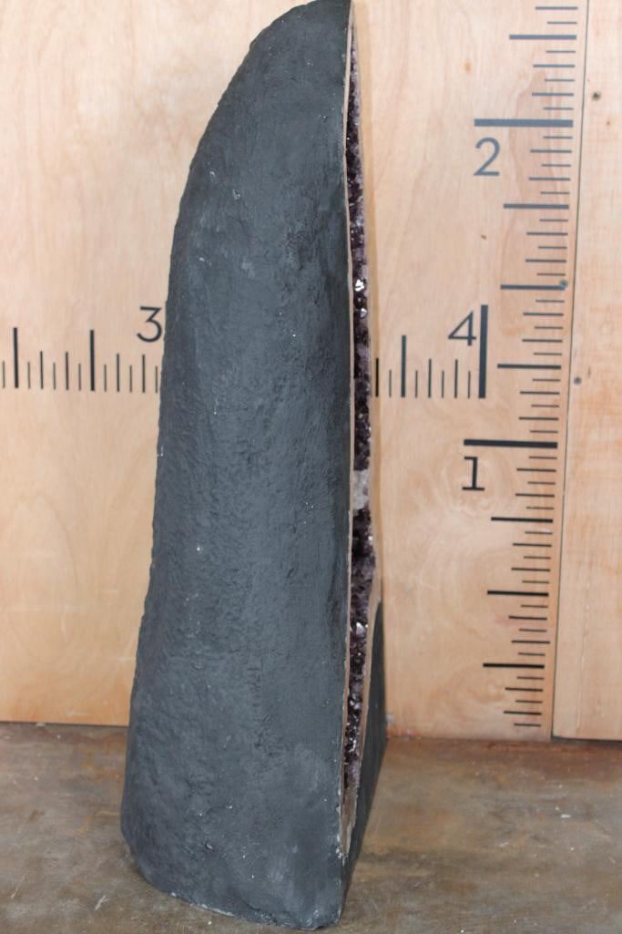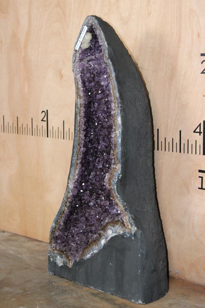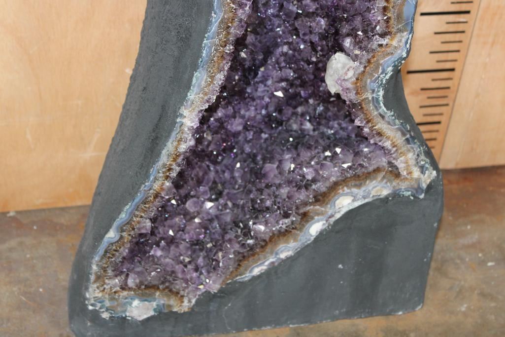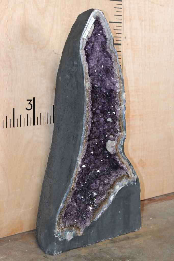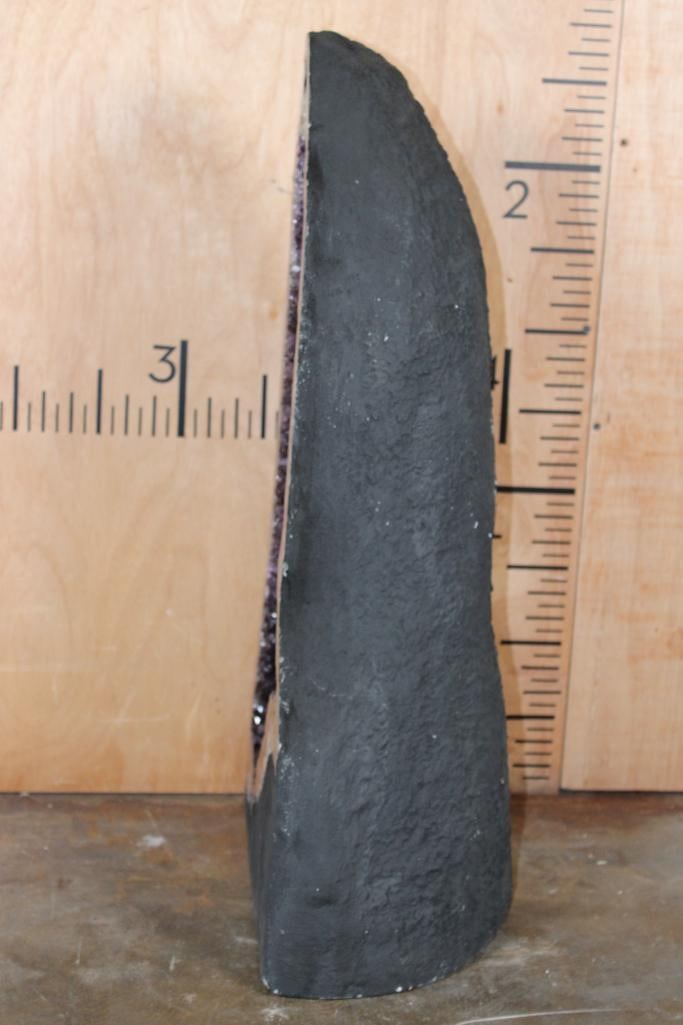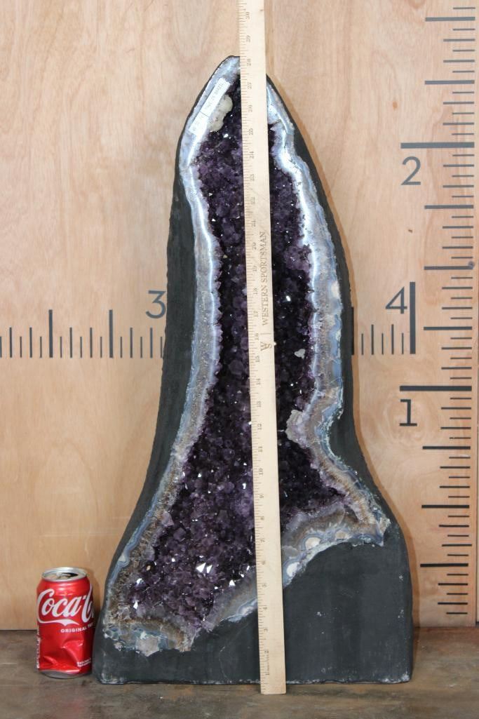 Breathtaking XXL AMETHYST Crystal Geode Cathedral mined in Brazil. Clear Quartz Deposits can be seen at the top and inside edge of the cathedral. It measures 28.25" Tall x 14.75" Wide x 8.75" Depth. The Total Weight is 100 lbs. This Amethyst Cathedral has a unique shape and deep purple points. ROCKS FOSSILS MINERALS CRYSTALS