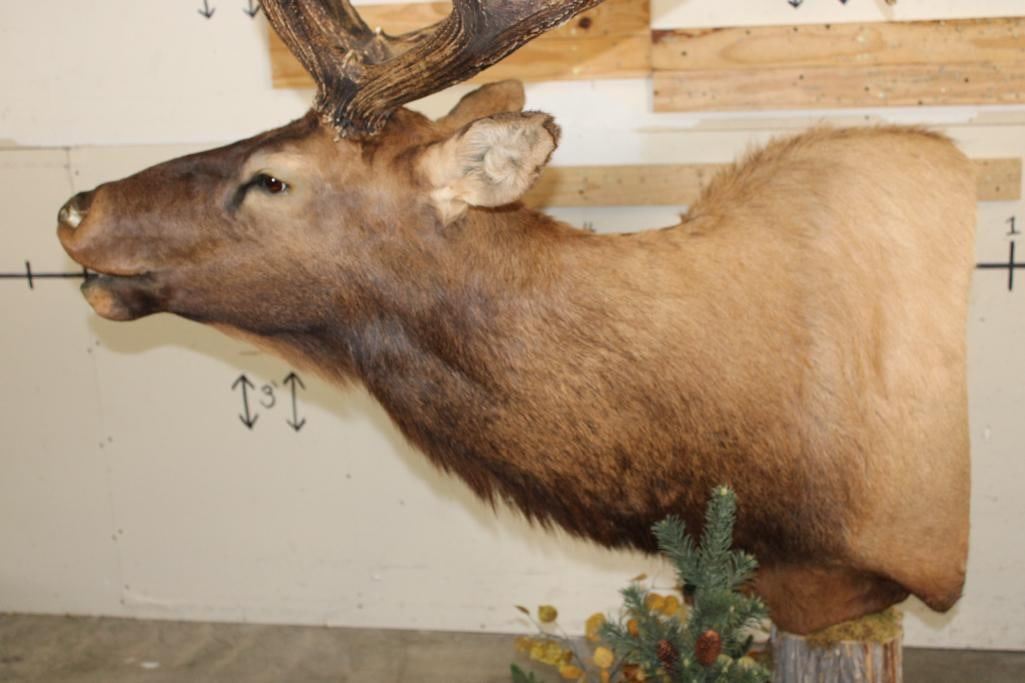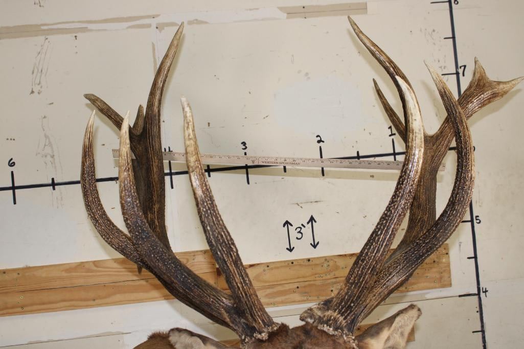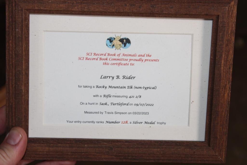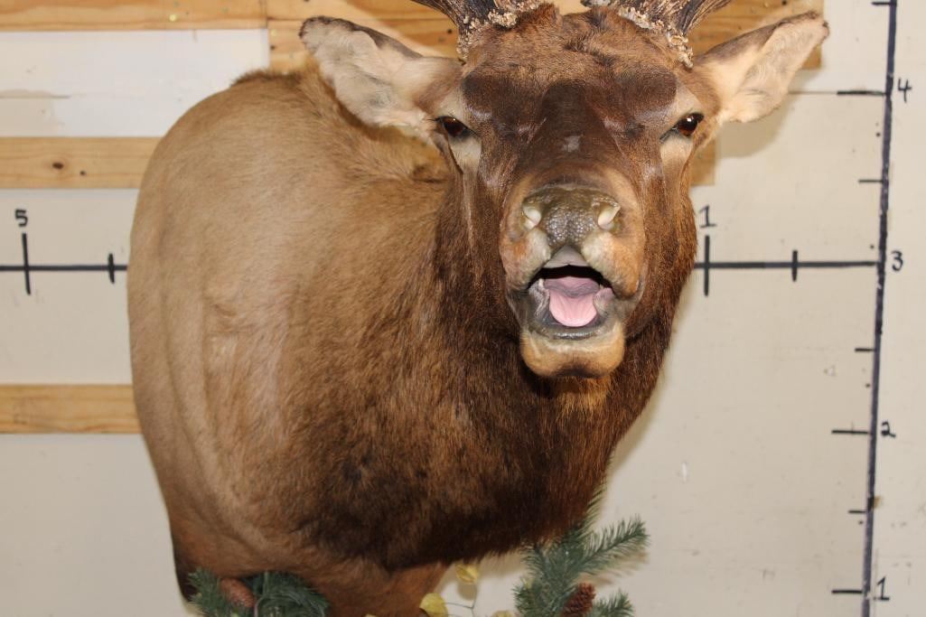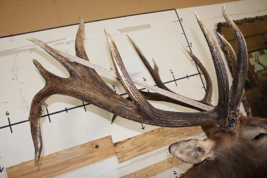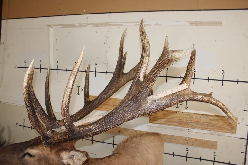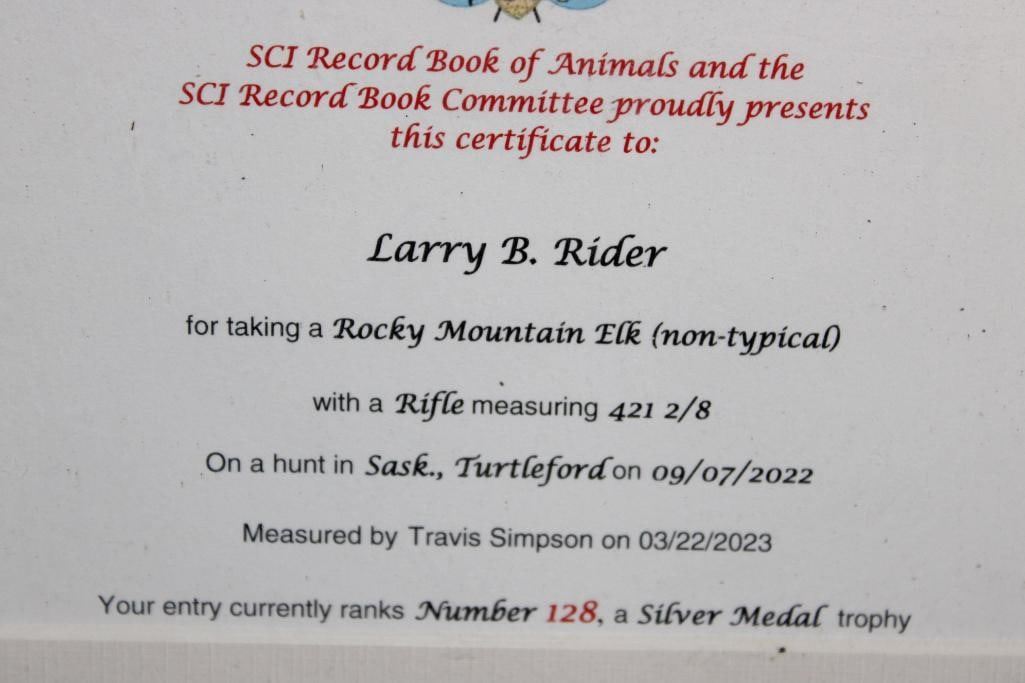 #128 in the SCI Record Book! This XXL "Bugling" Non-Typical ROCKY MOUNTAIN ELK has a 421 2/8 SCI Score. It has 16-Points and a 49 1/8" Spread. It was Taken in 2022 and is mounted on a Wood Pedestal with Wheels. TAXIDERMY