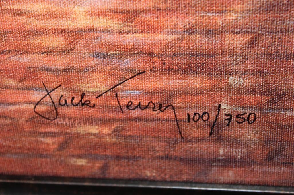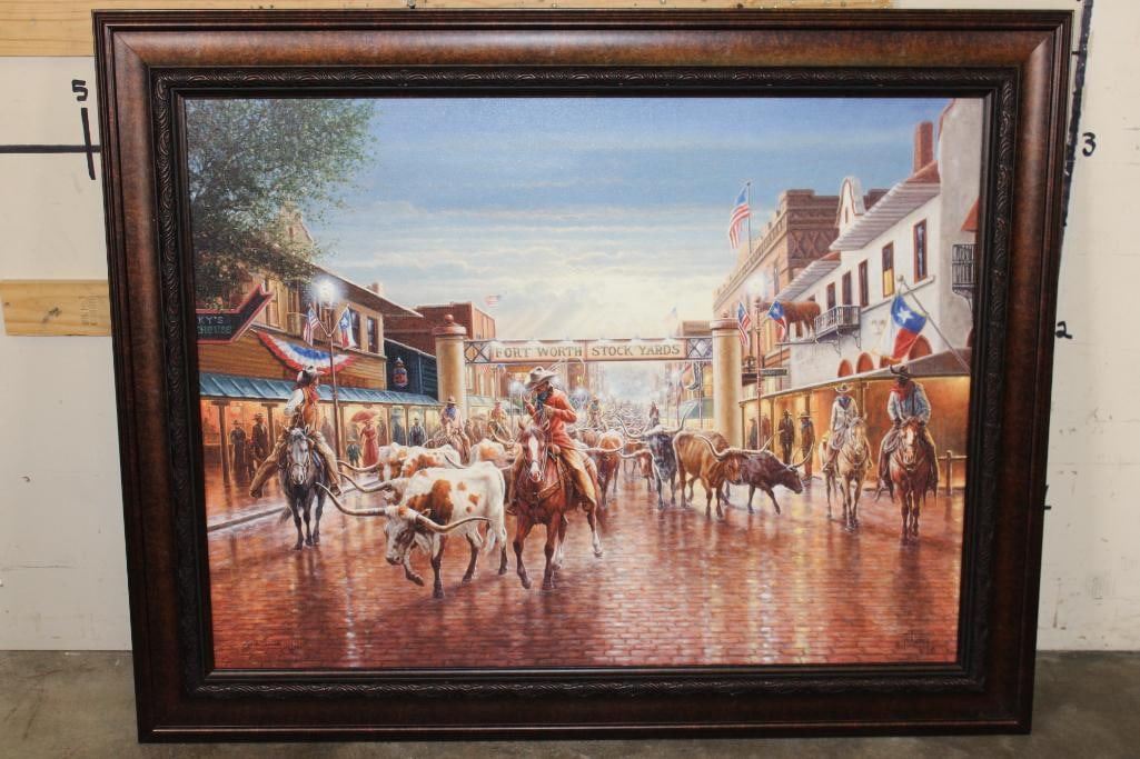 Big and Beautiful Limited Edition "Cowtown" Giclee signed and numbered #100/750 by renowned Texas Artist Jack Terry. It is displayed in a quality wood frame with glass that measures 57" Long x 46" Wide. The Certificate of Authenticity is included. Back in the day, Texas longhorns were driven through the Fort Worth streets to get to the town's historical Stockyards. Similar to that of a parade, the mighty longhorns would be sold to ranchers and cowboys. Today the Stockyards National Historic District is one of the most beloved attractions in Texas. This beautiful piece of art offers a glance into the experience of the true American West. COLLECTIBLE AMERICANA AND WESTERN ART