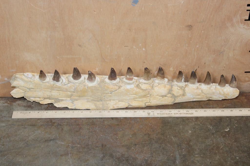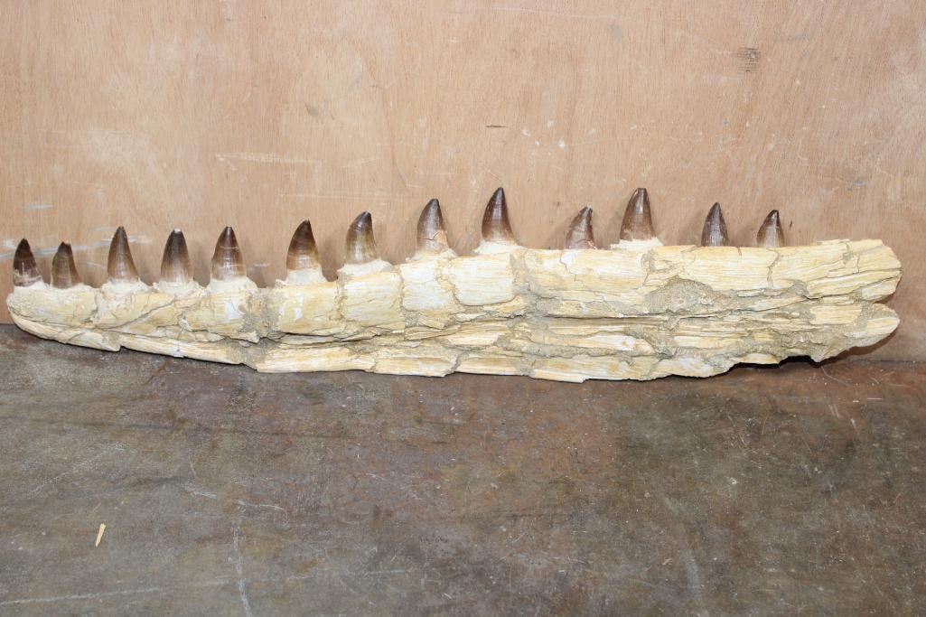 XXL Fossilized MOSASAUR Jaw Section with 13 Fully Rooted Teeth. This is an awesome specimen from Morocco that measures 26" Long x 5 5/8" Wide x 2" Thick. The Total Weight is 4 lbs 4 oz. Mosasaurs lived during the Late Cretaceous Period, from about 90 million years ago until they went extinct around 66 million years ago. ROCKS FOSSILS MINERALS