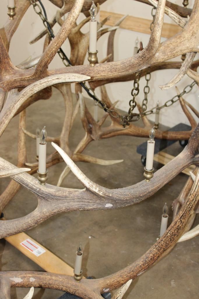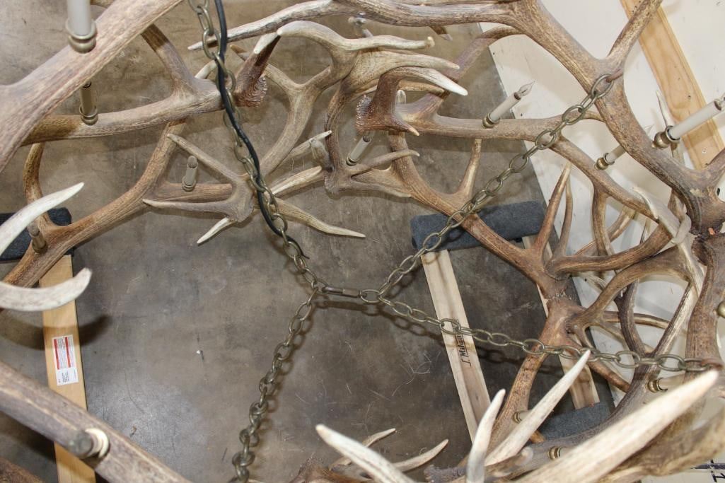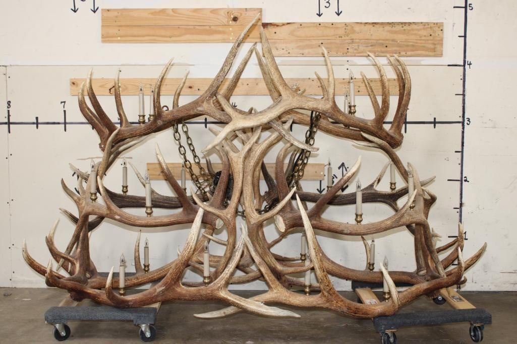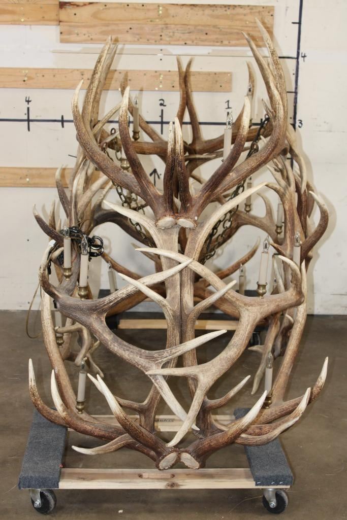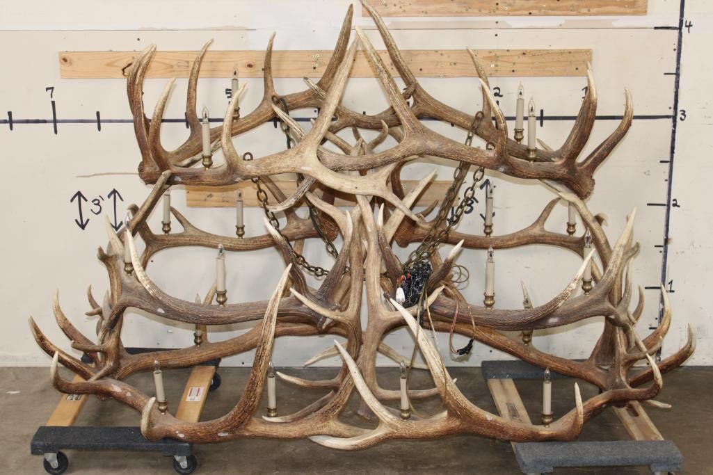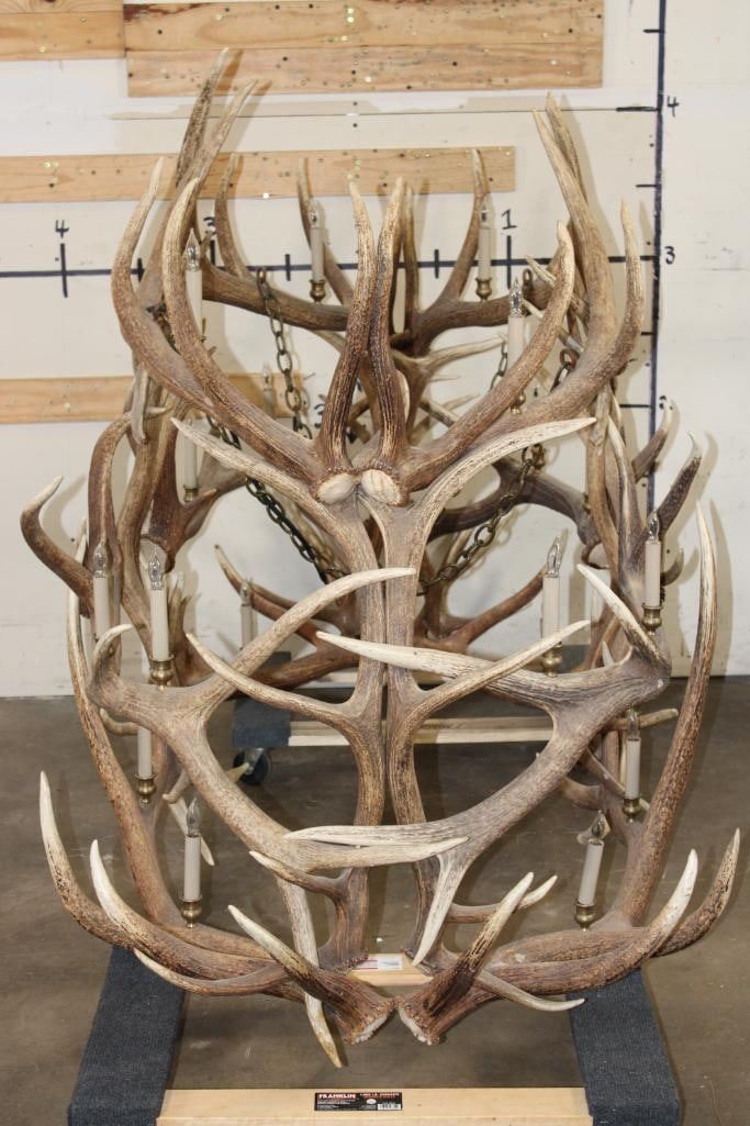 XXL ELK Antler Chandelier made from 20 Antler Sheds. This 3-Tier Chandelier is very well made by hand and has 20 Light Bulbs. It measures 6'7" Long x 3.5" Wide x 4'5" Tall. It has a Heavy Duty Chain Hanger for installation. LIGHTING FIXTURES AND