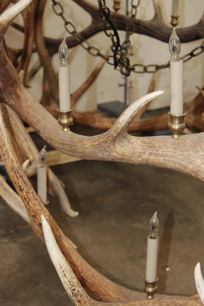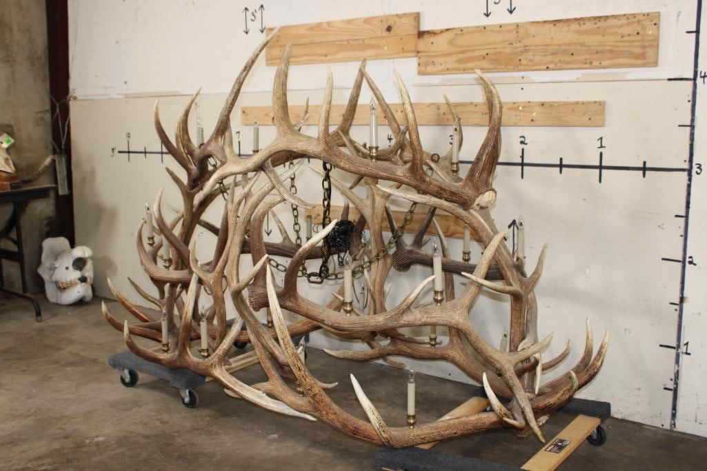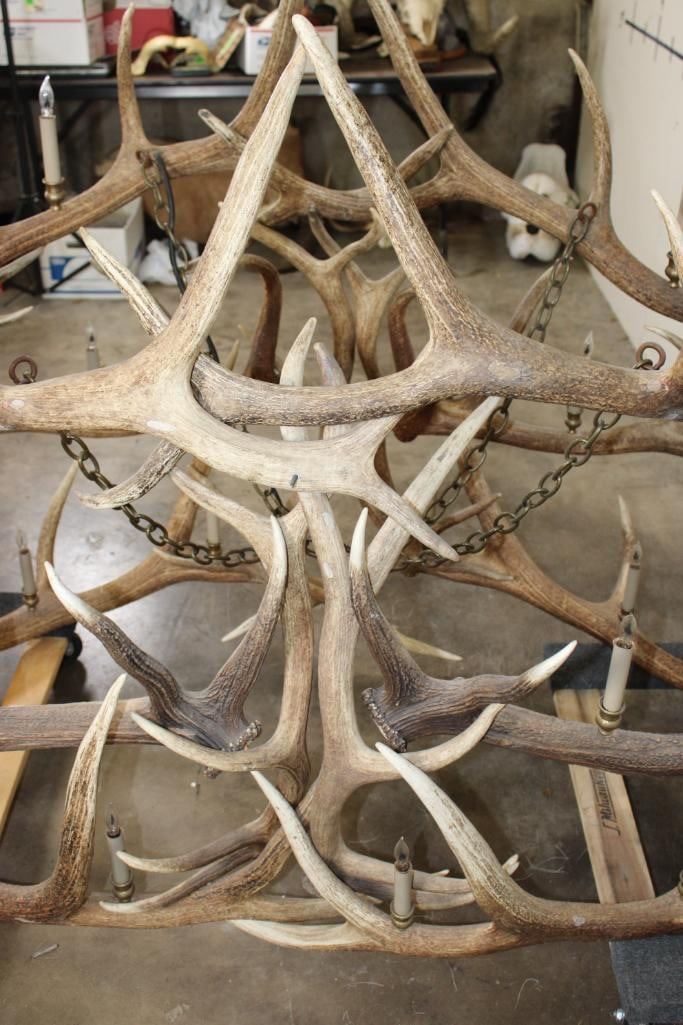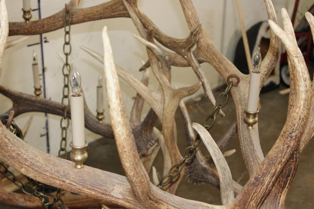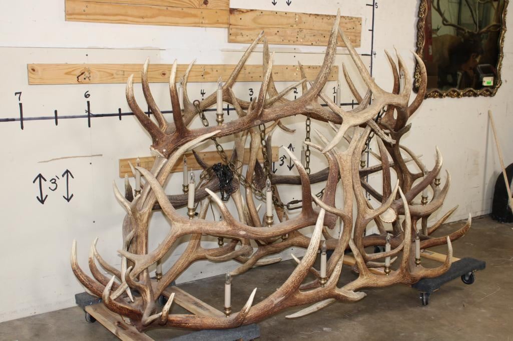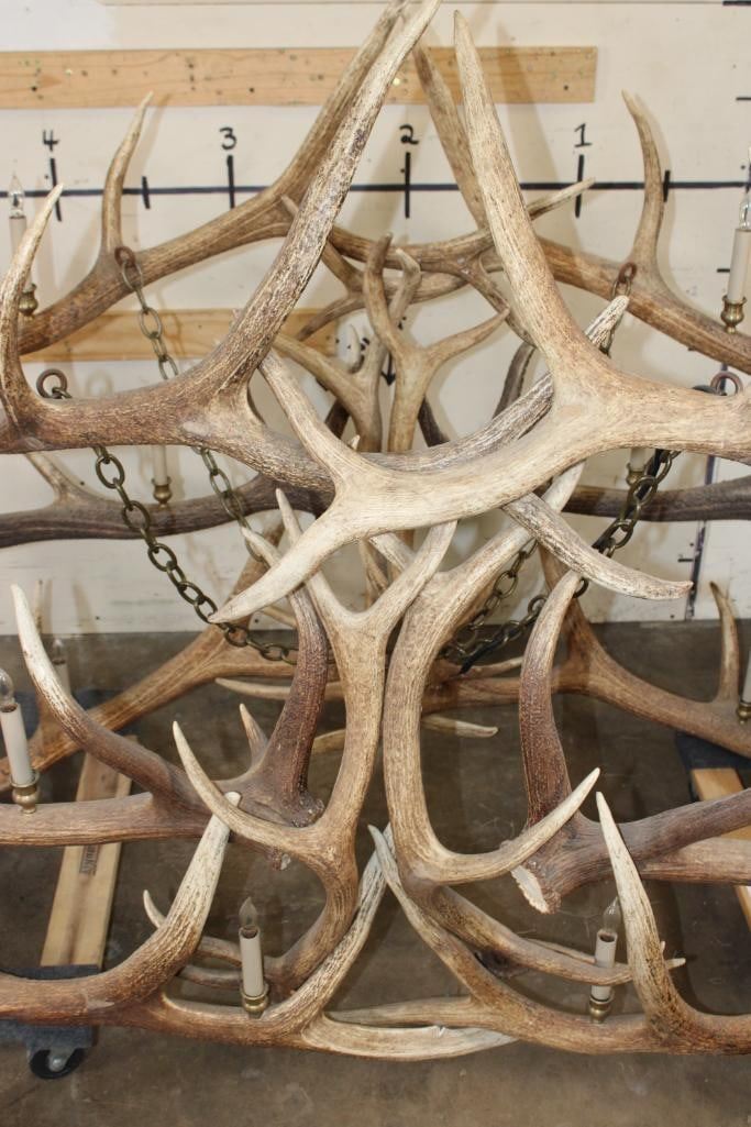 XXL ELK Antler Chandelier made from 20 Antler Sheds. This 3-Tier Chandelier is very well made by hand and has 20 Light Bulbs. It measures 6'7" Long x 3.5" Wide x 4'5" Tall. It has a Heavy Duty Chain Hanger for installation. LIGHTING FIXTURES AND