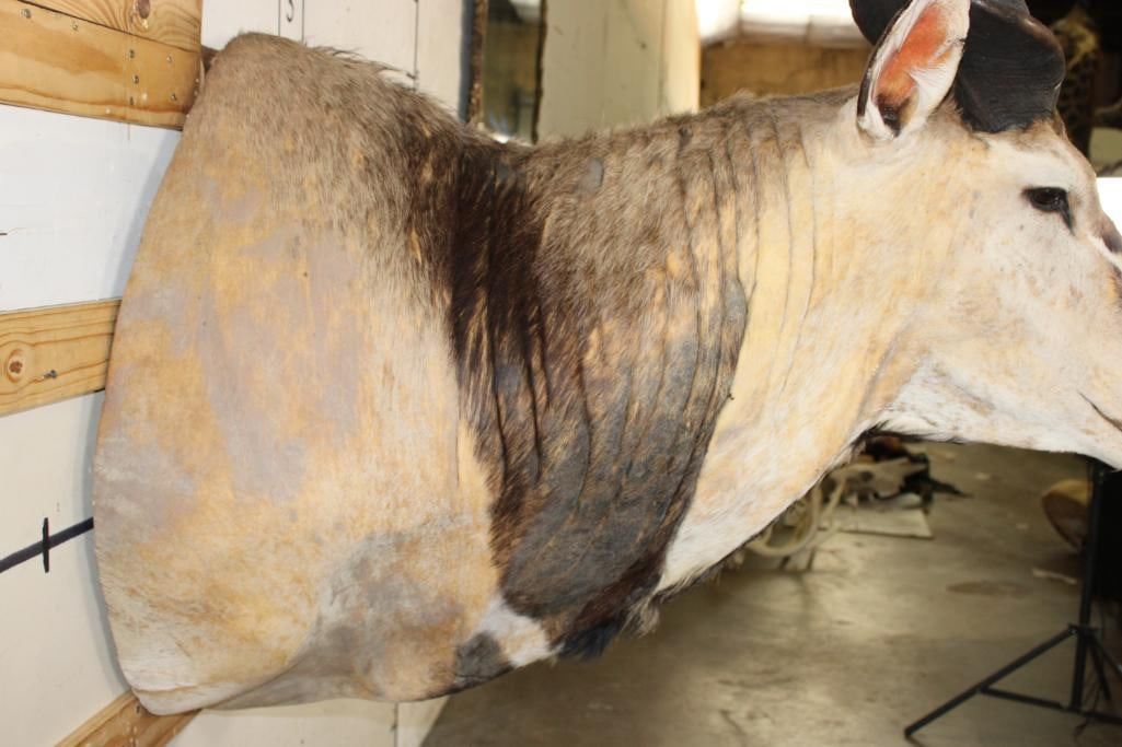 XXL LORD DERBY ELAND Shoulder Mount. The Left Horn measures 47.5" around the Spiral Ridge and the Right Horn measures 46.75" around the Spiral Ridge. The hair is thinning in some spots but otherwise it is in Good Condition. TAXIDERMY