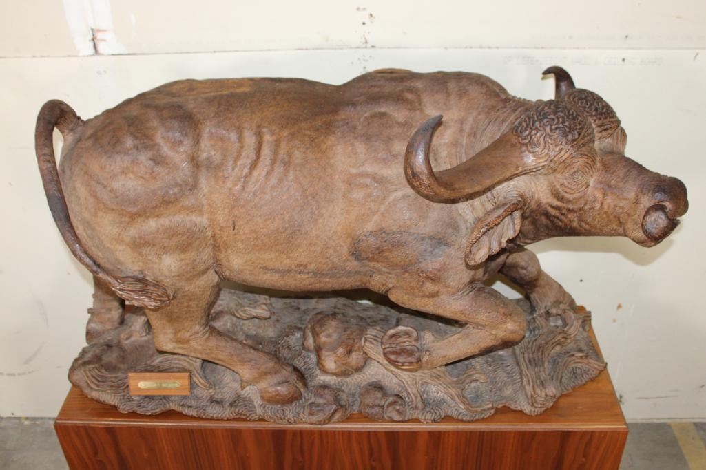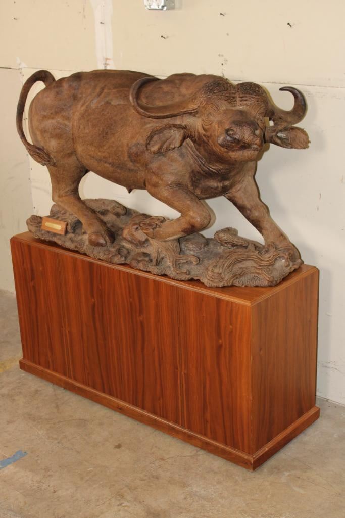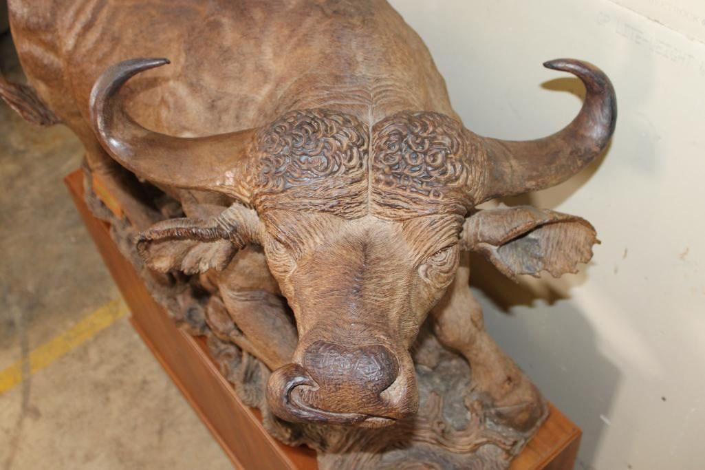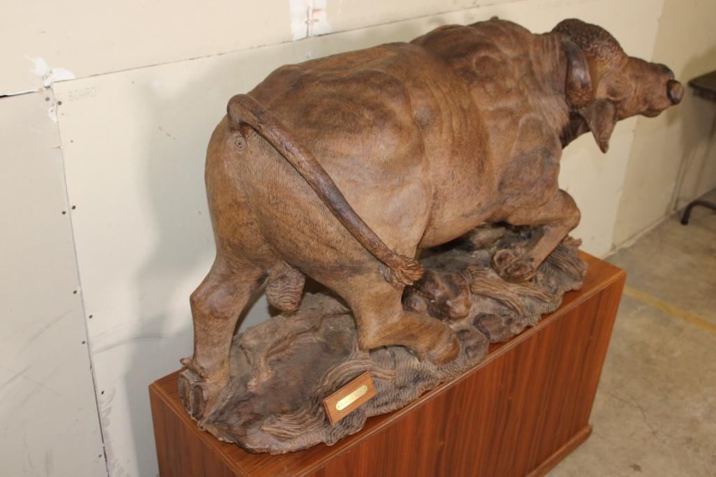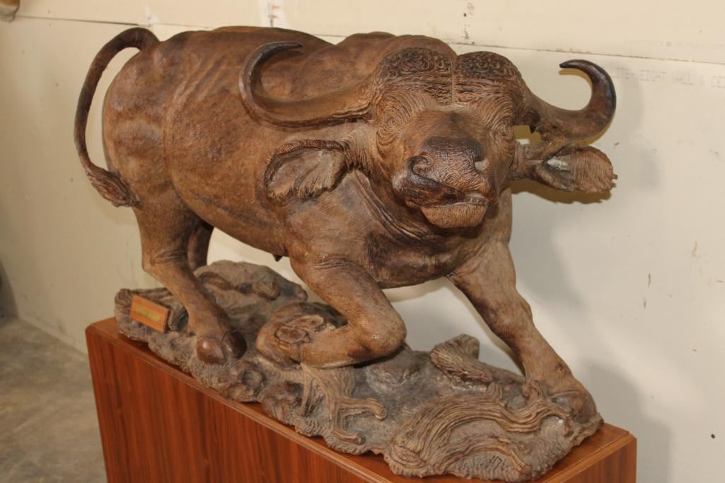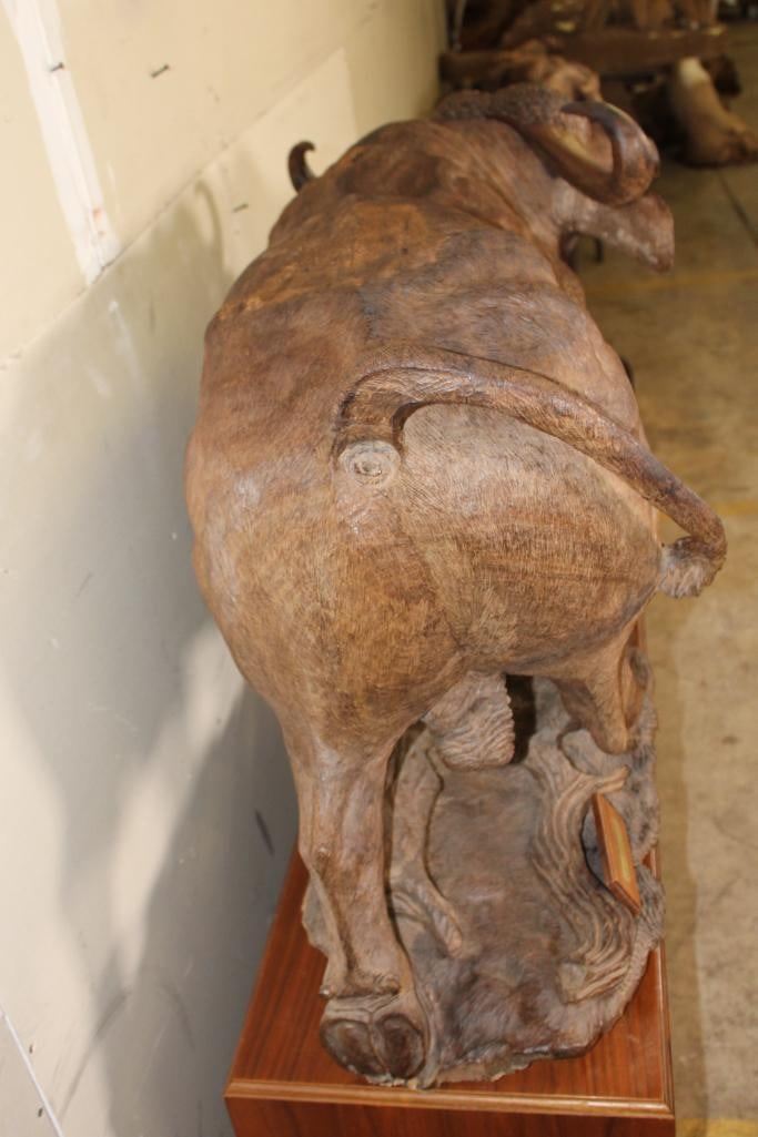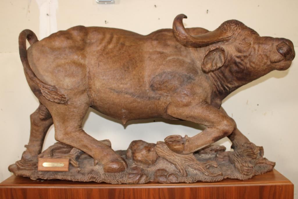 XXL Original African Leadwood sculpture of a Cape Buffalo by African artist Robert Nzali. This piece has been artfully hand-carved with beautiful detail from a single leadwood tree stump. The signature "Robert Nzali 94" can be seen at the bottom front and a name plate has been included. The Cape Buffalo Sculpture measures 48" Long x 22" Wide x 27" Tall. It has been mounted on a Wooden Base with Wheels that measures 49.25" Long x 17" Wide x 25" Tall. The Total Mount Height is approximately 51" Tall. The sculpture is removable from the base. COLLECTIBLE AFRICAN ART CARVINGS AND SCULPTURES