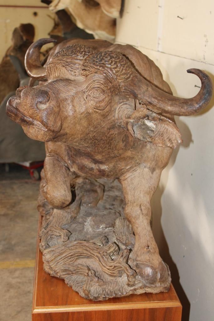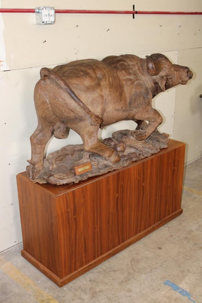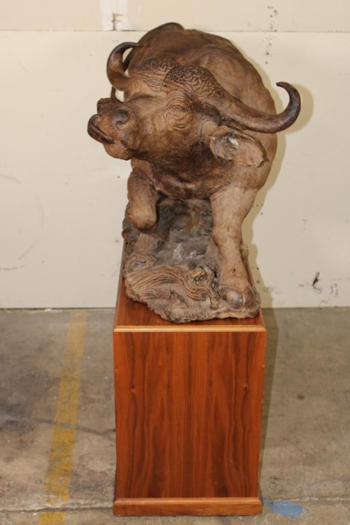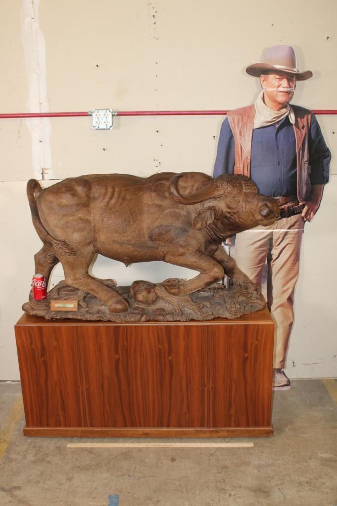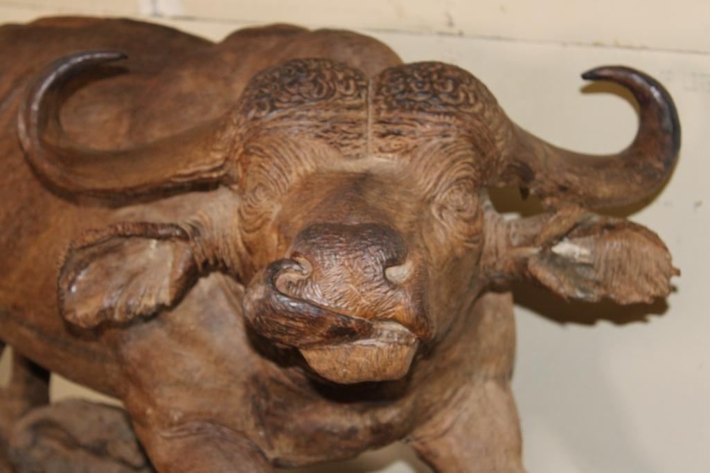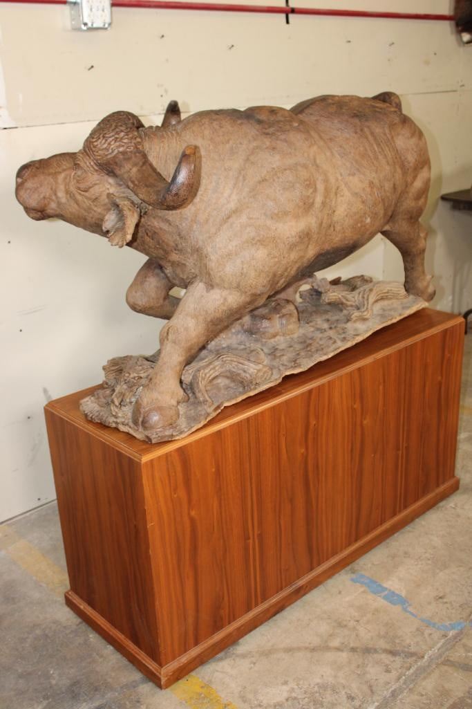 XXL Original African Leadwood sculpture of a Cape Buffalo by African artist Robert Nzali. This piece has been artfully hand-carved with beautiful detail from a single leadwood tree stump. The signature "Robert Nzali 94" can be seen at the bottom front and a name plate has been included. The Cape Buffalo Sculpture measures 48" Long x 22" Wide x 27" Tall. It has been mounted on a Wooden Base with Wheels that measures 49.25" Long x 17" Wide x 25" Tall. The Total Mount Height is approximately 51" Tall. The sculpture is removable from the base. COLLECTIBLE AFRICAN ART CARVINGS AND SCULPTURES