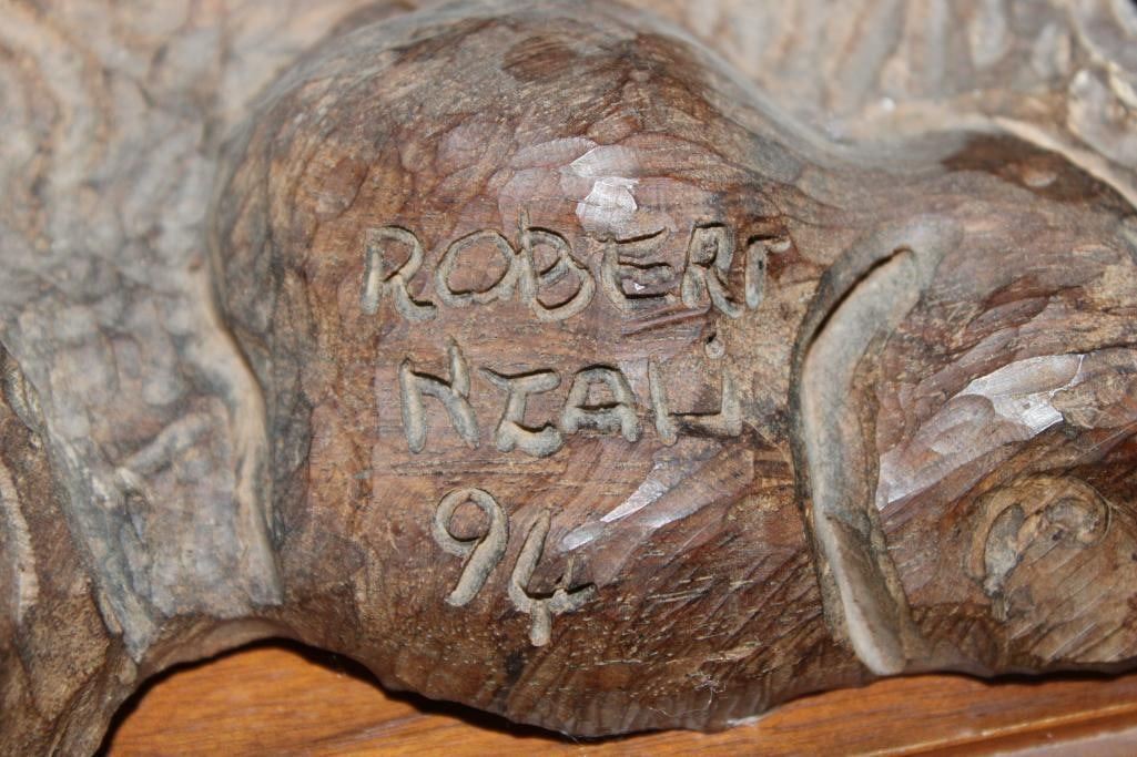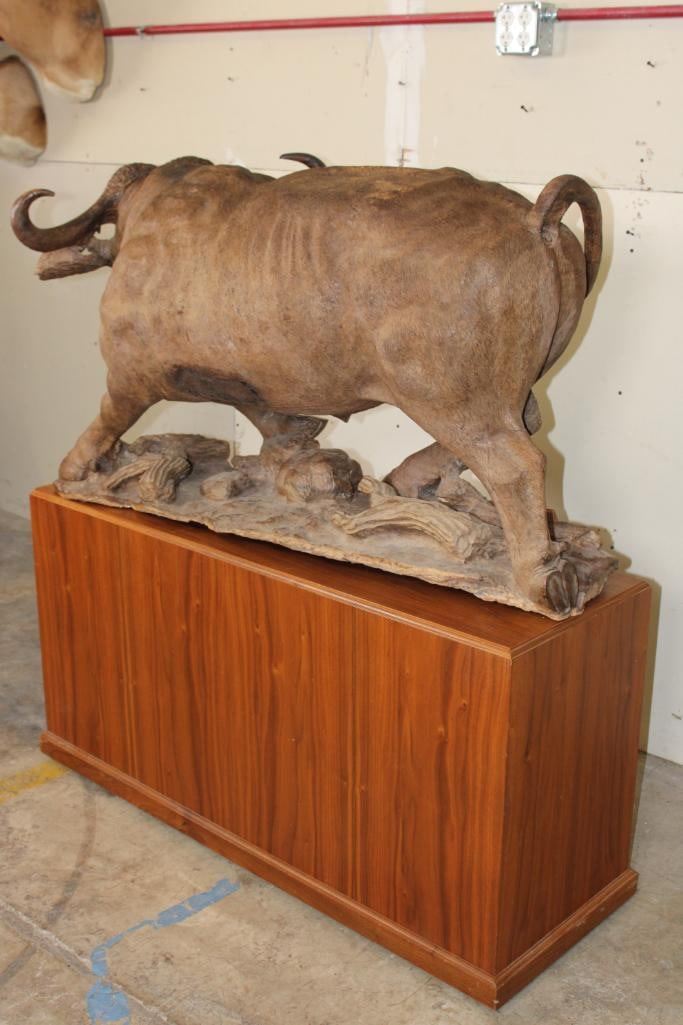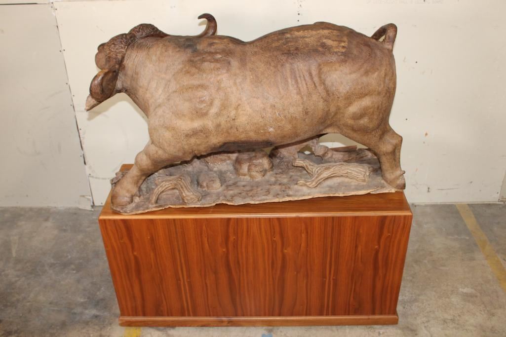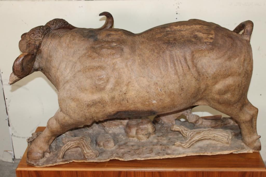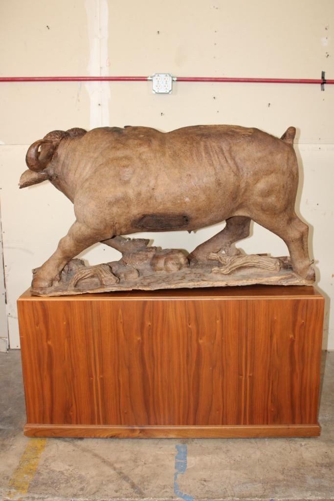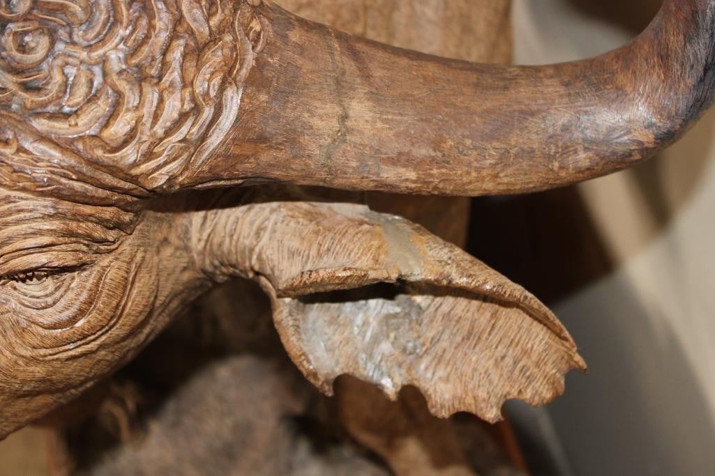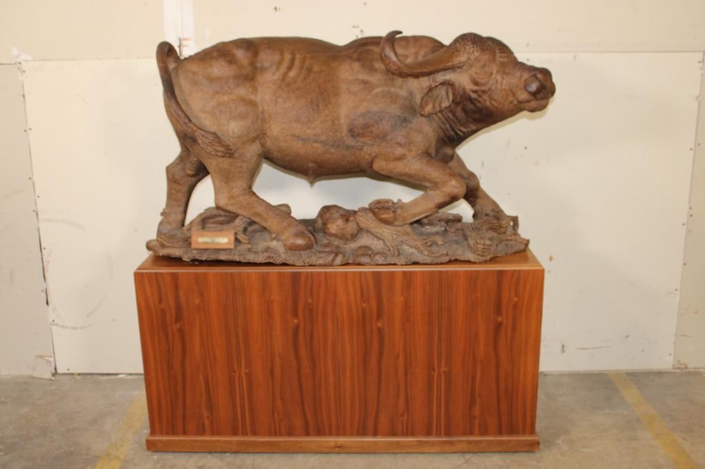 XXL Original African Leadwood sculpture of a Cape Buffalo by African artist Robert Nzali. This piece has been artfully hand-carved with beautiful detail from a single leadwood tree stump. The signature "Robert Nzali 94" can be seen at the bottom front and a name plate has been included. The Cape Buffalo Sculpture measures 48" Long x 22" Wide x 27" Tall. It has been mounted on a Wooden Base with Wheels that measures 49.25" Long x 17" Wide x 25" Tall. The Total Mount Height is approximately 51" Tall. The sculpture is removable from the base. COLLECTIBLE AFRICAN ART CARVINGS AND SCULPTURES