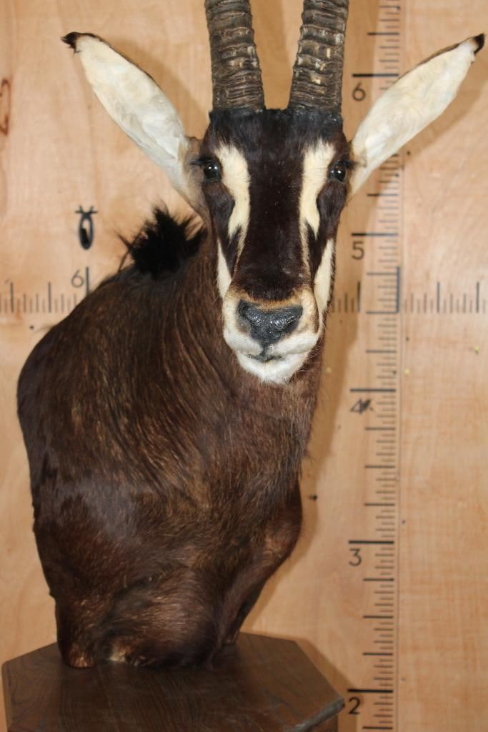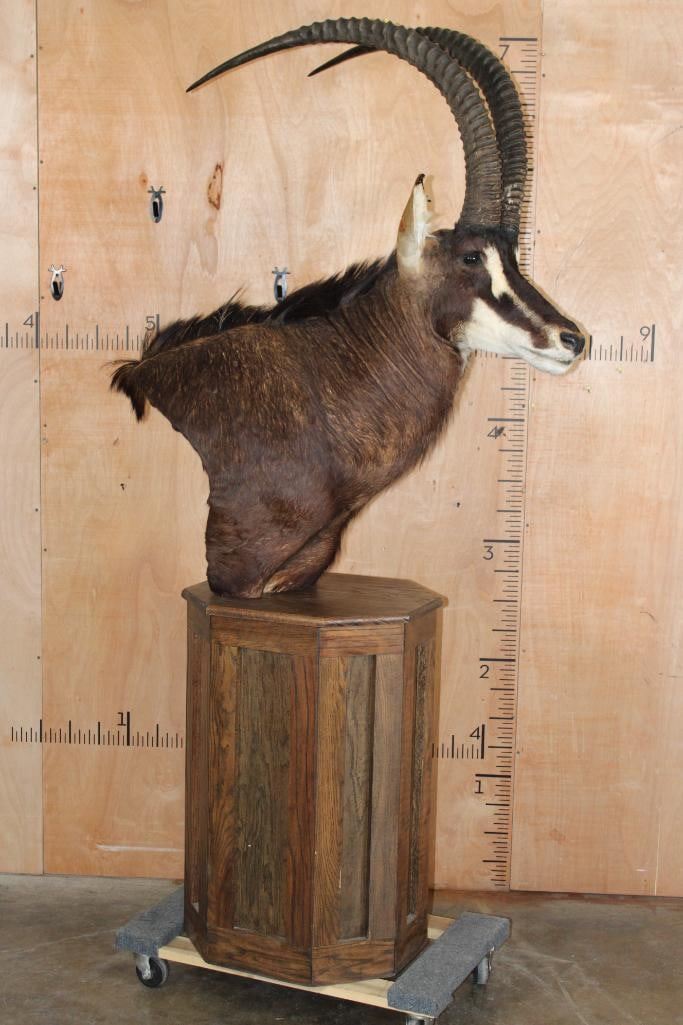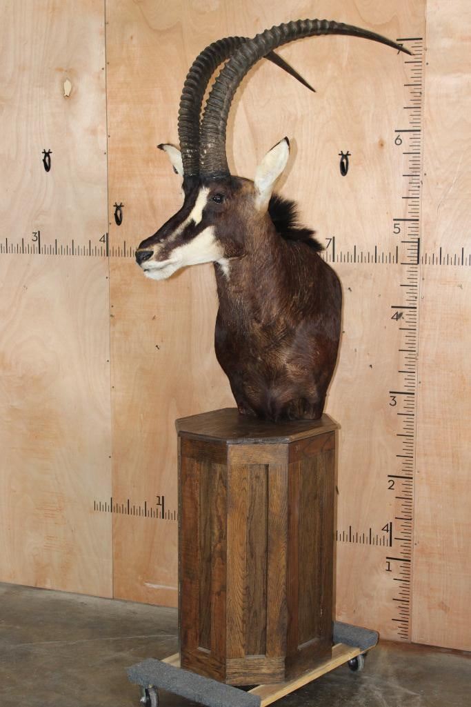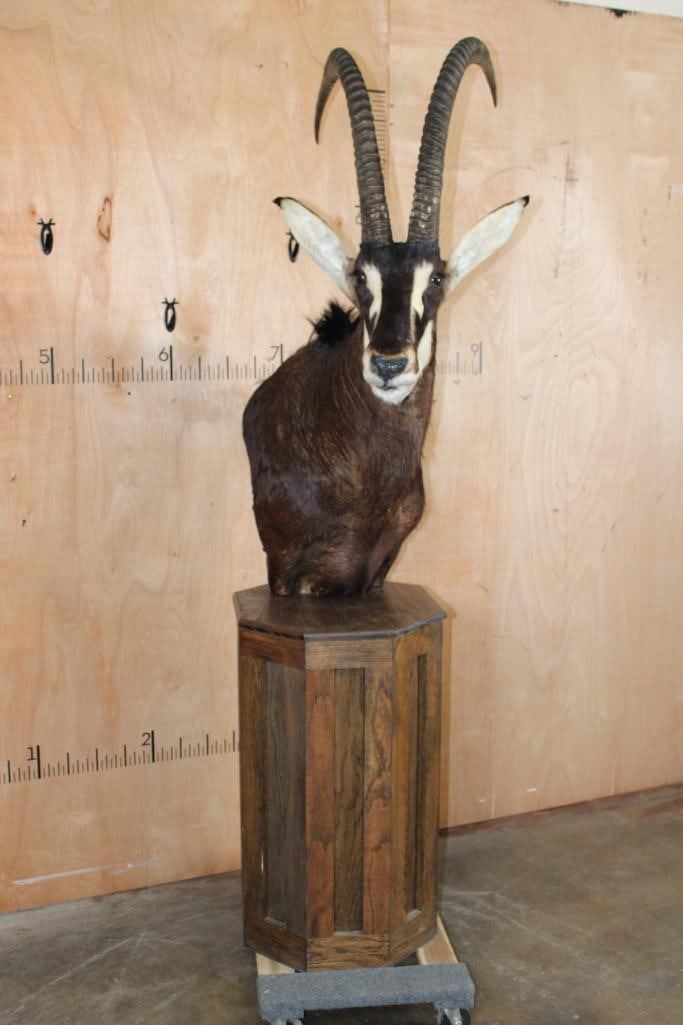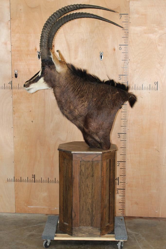 Very Nice, Clean, and Newer XXL SABLE Pedestal Mount. The Left Horn measures 40" Long and the Right Horn measures 40 5/8" Long. The Top Piece and Sable are removable, this mount is in Very Good Condition. TAXIDERMY