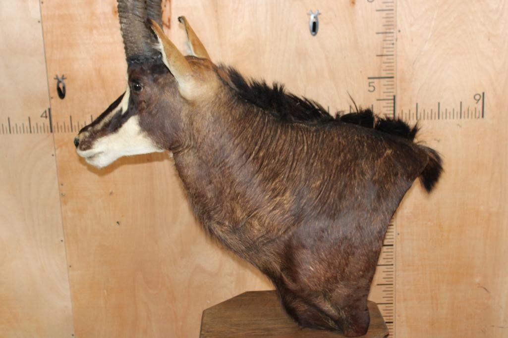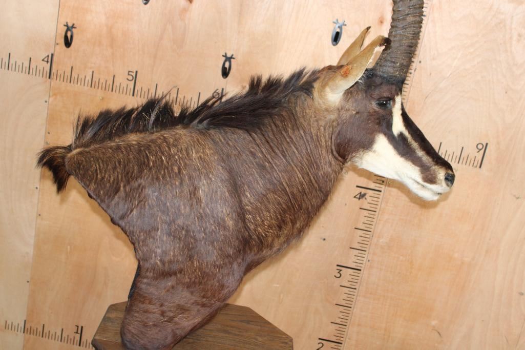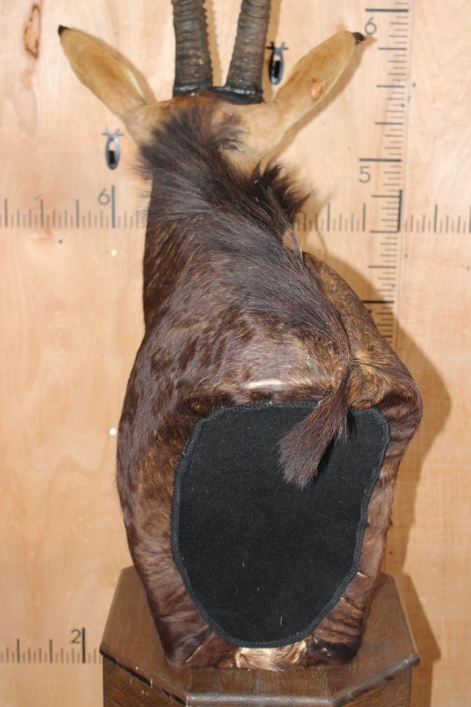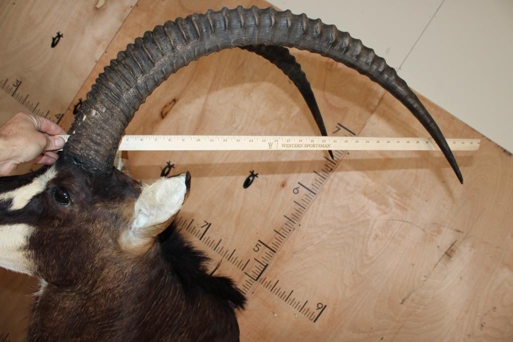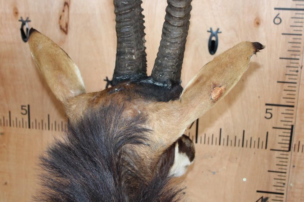Very Nice, Clean, and Newer XXL SABLE Pedestal Mount. The Left Horn measures 40" Long and the Right Horn measures 40 5/8" Long. The Top Piece and Sable are removable, this mount is in Very Good Condition. TAXIDERMY