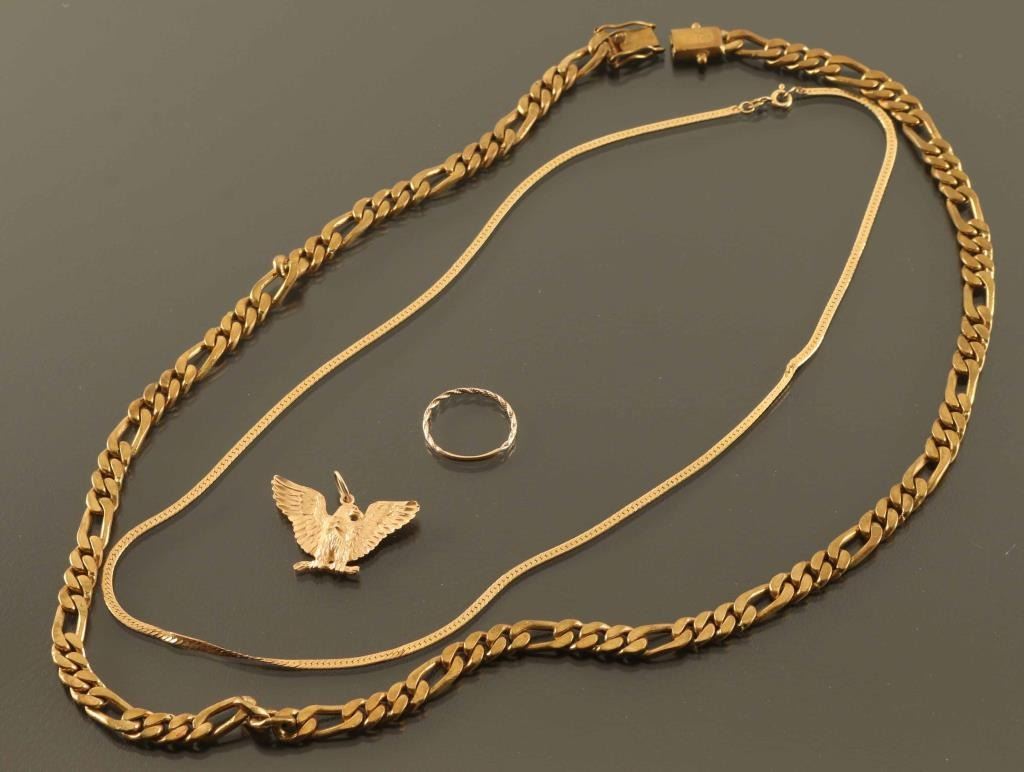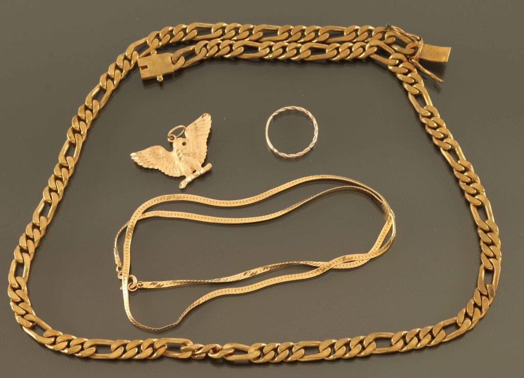 Including an Italian 14k yellow gold mens chain, a ladies flat link chain marked 14k Italian gold, 14k yellow gold eagle pendant, a 14k gold rope band. All weigh approximately 2.6 ounces together.