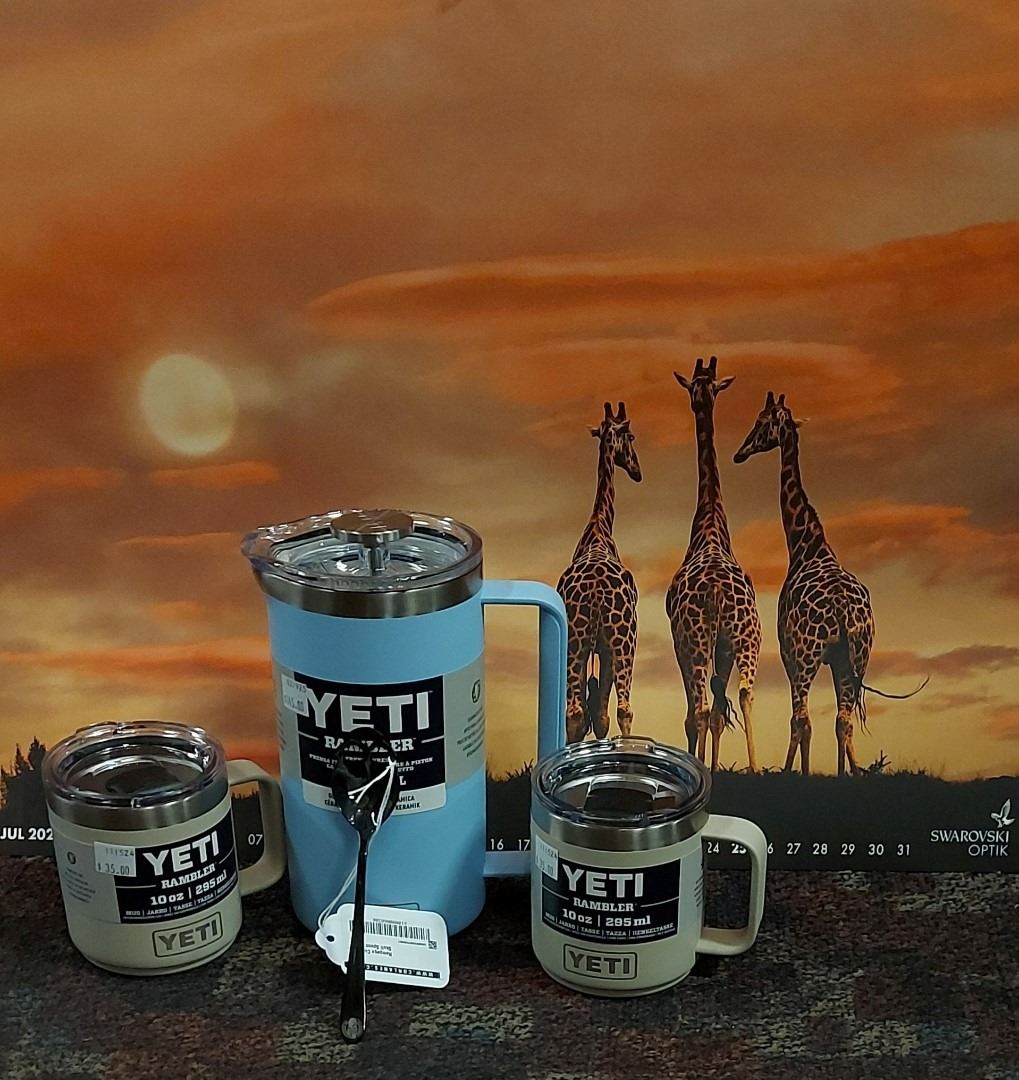 Camping coffee package featuring the Yeti Rambler Coffee French Press, 2 Yeti Rambler mugs, and a Rampage Coffee Co. Skull Spoon in black.