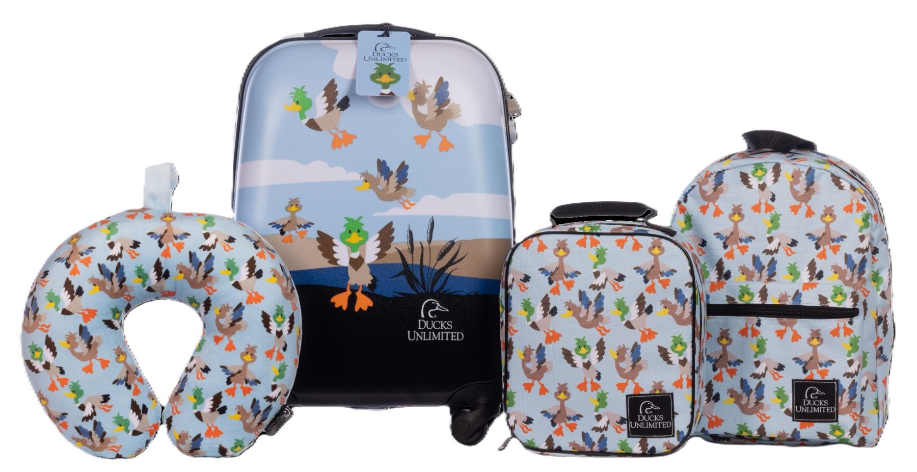The 5pc Kids Travel Set is a delightful choice for family vacations or weekend trips to the grandparents' house. This set includes everything a young traveler needs: an 18" hardsided, wheeled suitcase, a 15" backpack, a 10" lunch bag, a neck pillow, and a luggage tag. Each piece features whimsical duck characters and the Ducks Unlimited logos, adding a playful touch. Designed with durability and lightweight materials, the set can withstand the rigors of travel while making it easy for kids to carry their treasures. Whether exploring new places or visiting family, this travel set combines functionality with adorable design, making it a favorite among young adventurers.