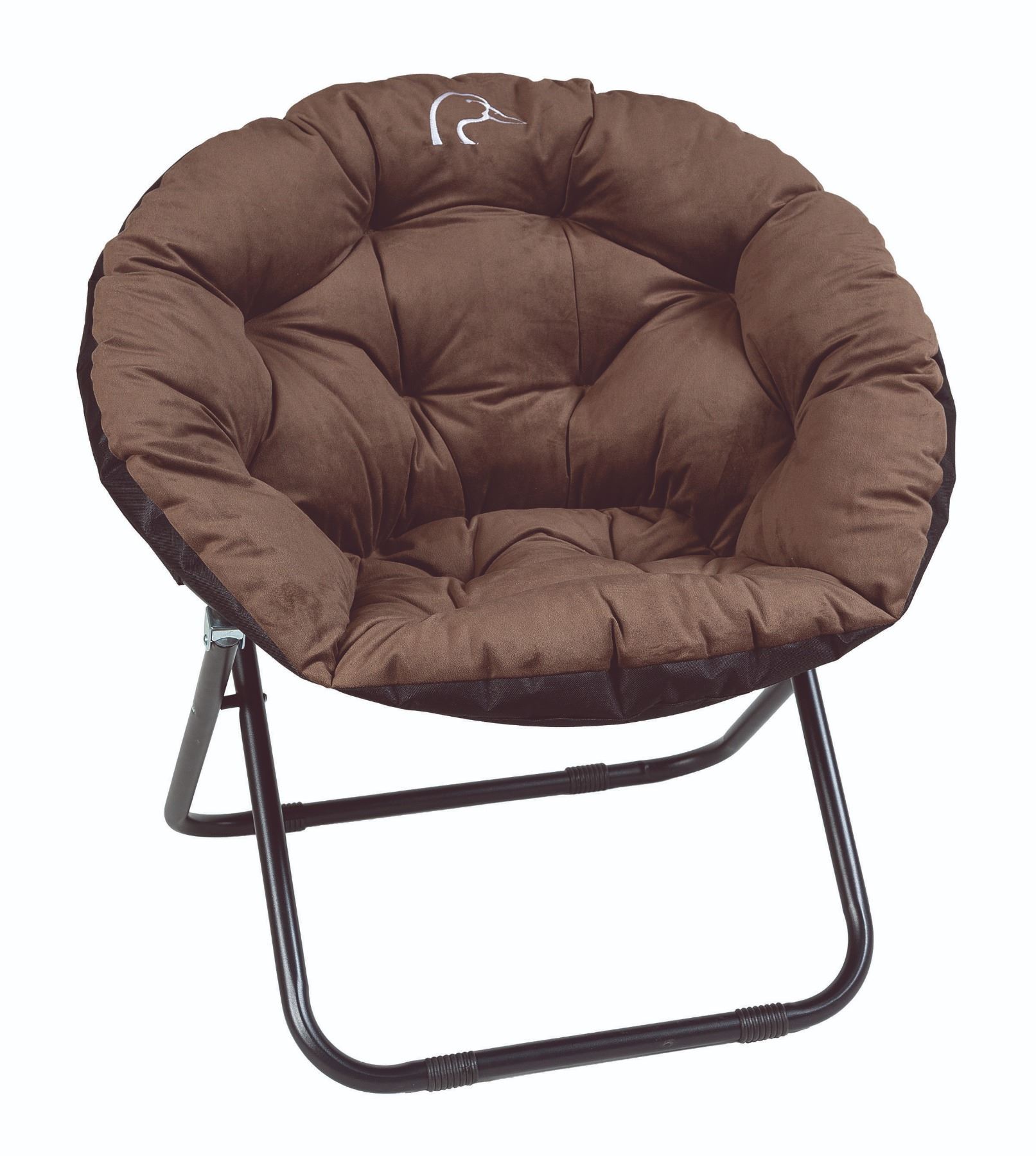 The Saucer Youth Chair is a quick set-up and portable to take anywhere. The chair is brown rushed velour with an ivory duckhead logo. Weight limit is 125 pounds, legs lock to keep chair securely open for safety. The chair measures 29.5” T x 30” W x 27” D.