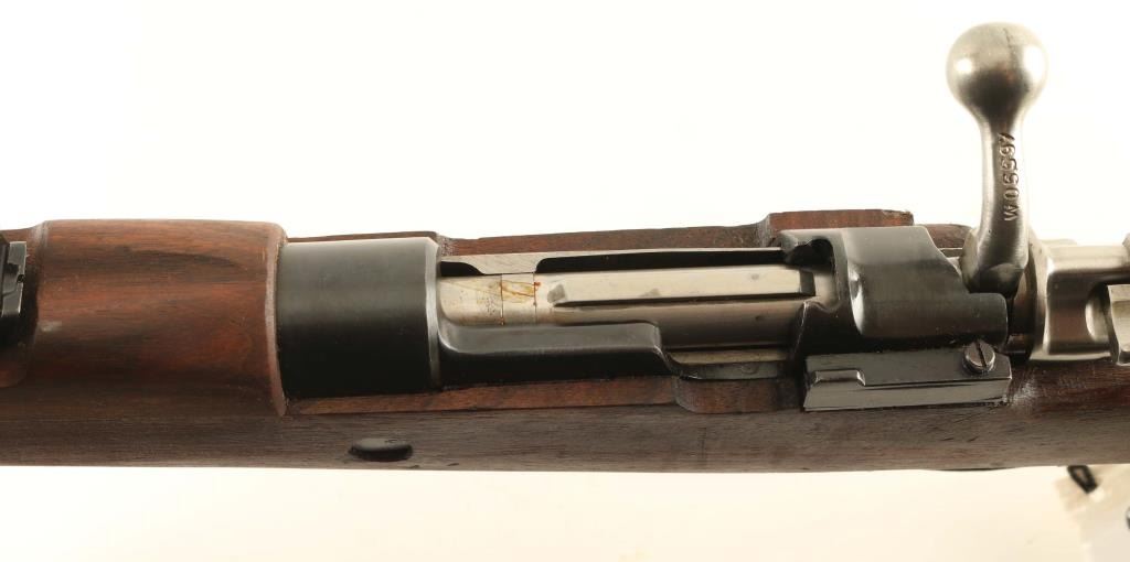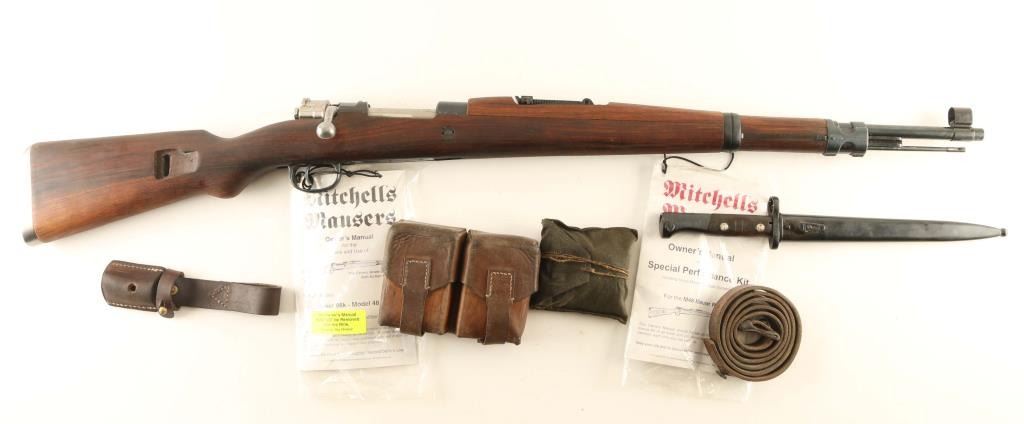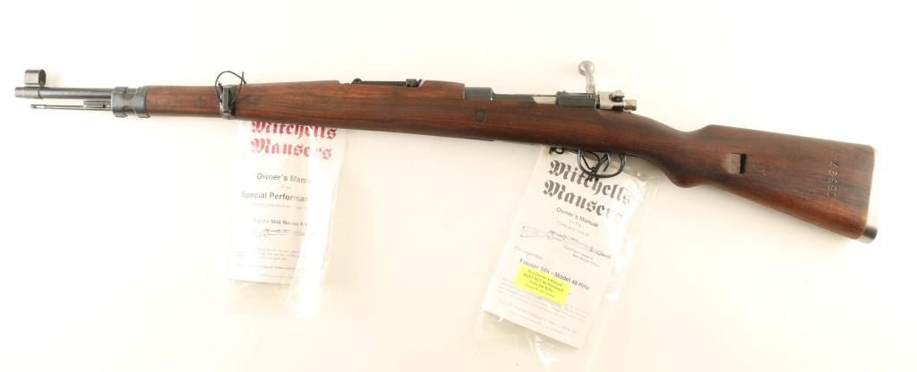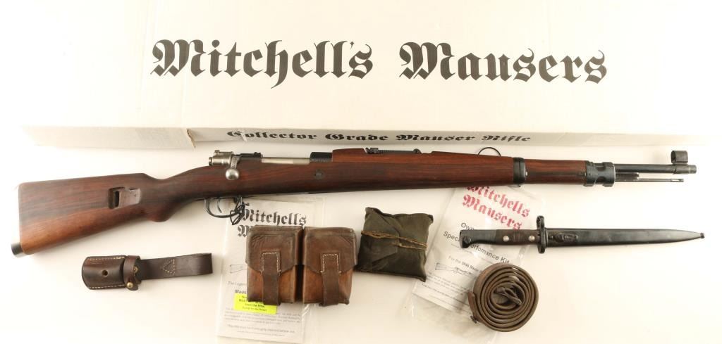 Yugoslavian military rifle, imported by Mitchell's Mausers (MMC HB CA). Features approx 24" barrel, bent bolt handle, military sights, sling slots, bayonet lug, cleaning rod under barrel, front sight hood. Bore is excellent condition. Retains 95% blue, with some discoloration near front sight. Bolt assembly in the white. Wood is in excellent condition with few small dents and handling marks. No crest on receiver. All observed number match. Includes original Mitchell's shipping box, manual, certificate of authenticity, excellent bayonet with scabbard, good condition tan leather accessories to include: bayonet frog, sling, two pocket cartridge pouch. Condition is NRA Excellent *** C&R Firearm ***