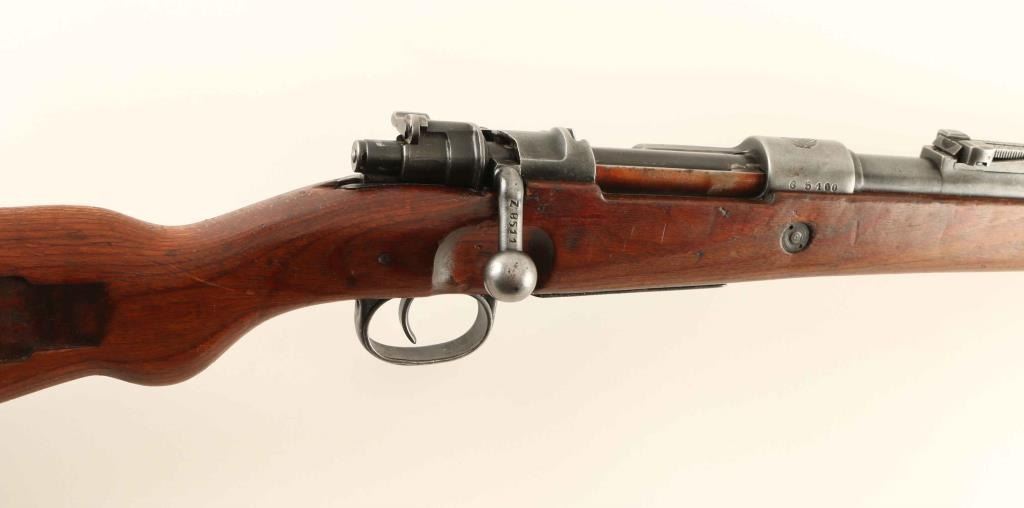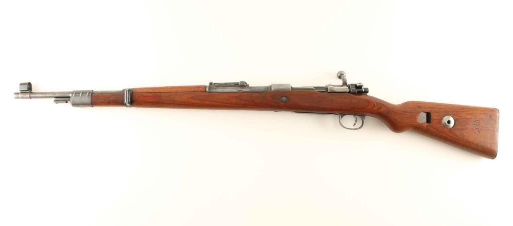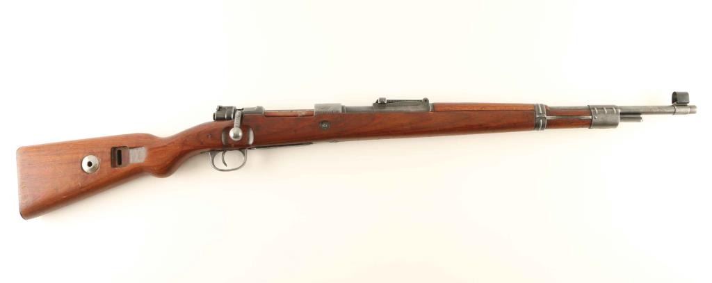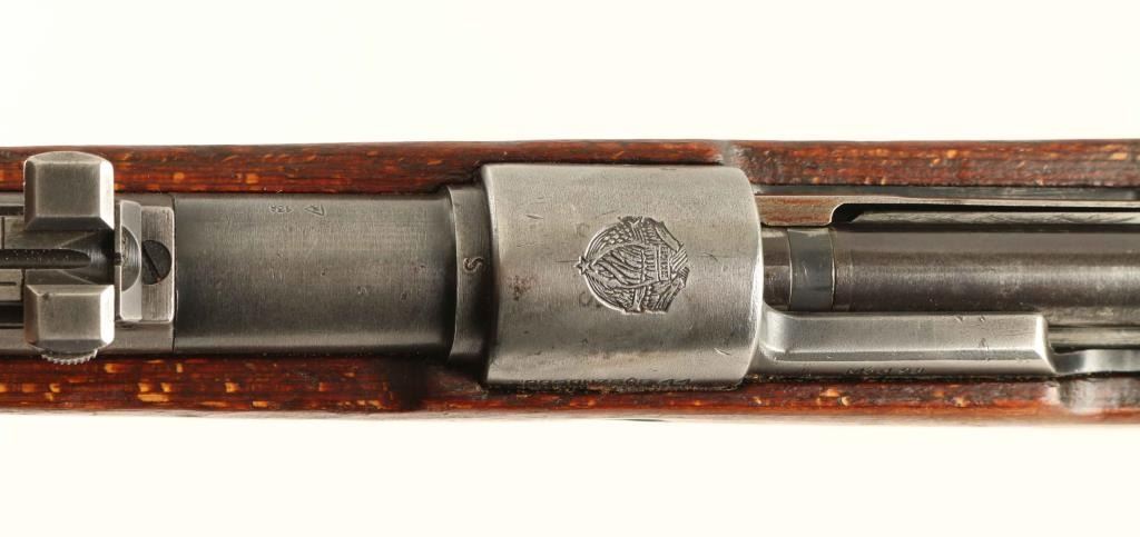 Late WWII era German military bolt action rifle that was refurbished and remarked by Zastava circa 1946-1950. Imported by C.A.I. of St. Albans, V.T. with import marks on the barrel. Features a blued finish, 23.25" barrel, hooded inverted 'v' front sight, tangent rear sight graduated to 2,000 meters, bayonet lug, stamped metal barrel bands, turned down bolt handle, three-position safety, smooth laminated wood handguard and pistol grip shoulder stock with bolt disassembly disc & smooth metal buttplate. The receiver ring is marked with the Yugoslavia Coat of Arms and "PREDUZECE 44" for Institute 44 - Kragujevac. Serial numbers match on the receiver and stock. Rifle exhibits approximately 10% of it's blued finish with the majority of the metal surfaces thinned to a light grey patina with a mild amount of scattered light surface rust. Action is smooth, the bore is excellent and the wood stocks are very good. Condition is near NRA good. ***C&R Firearm***