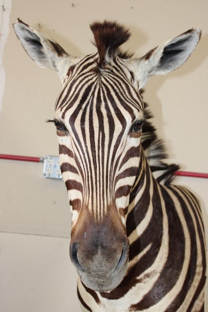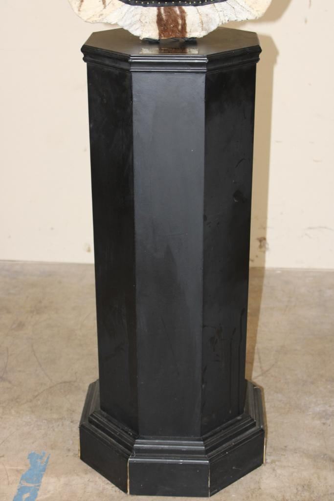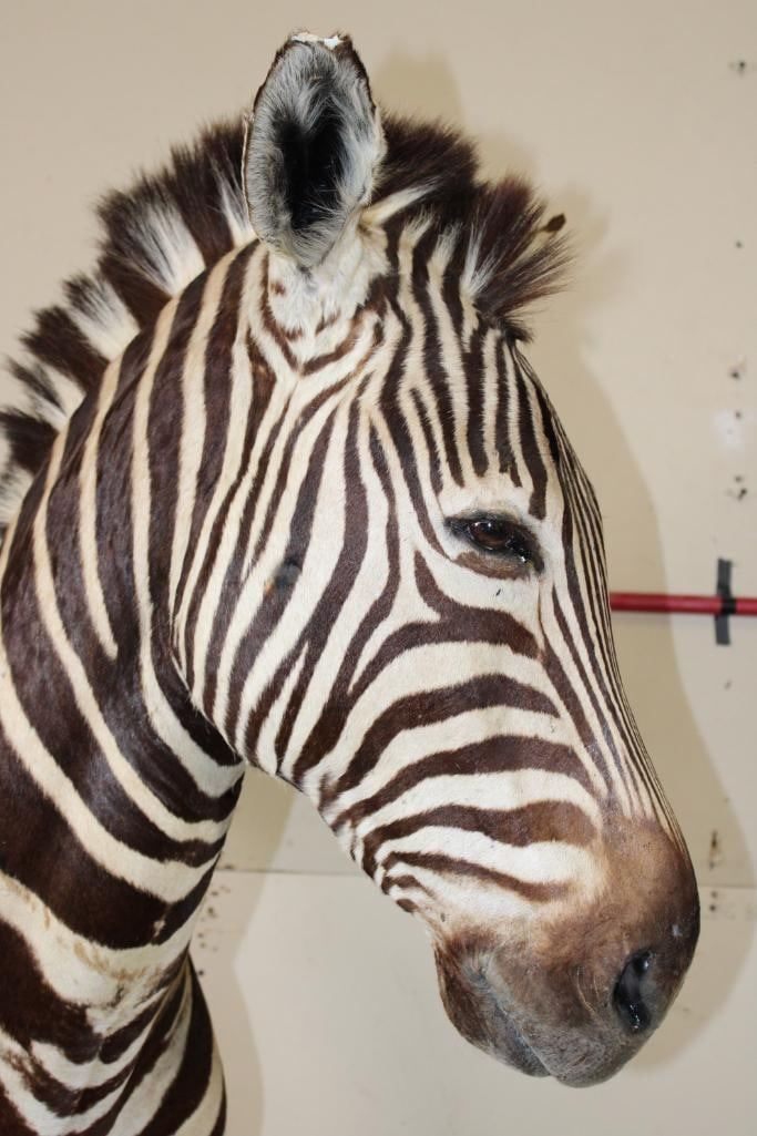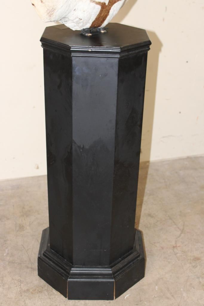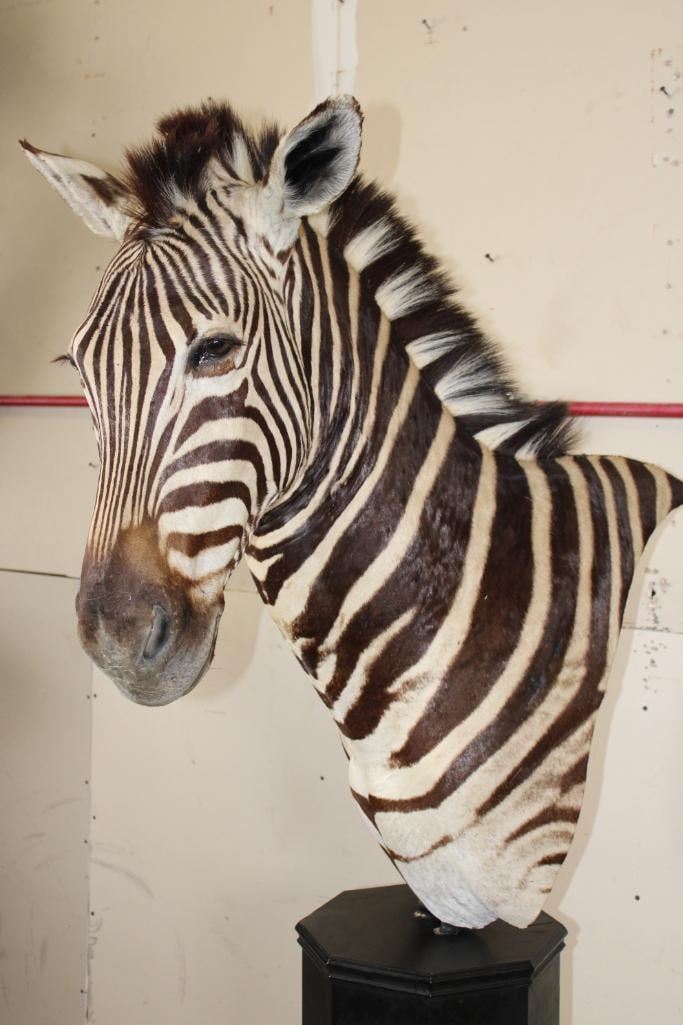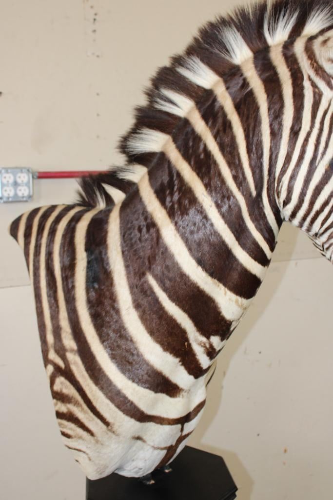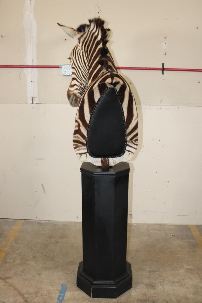 Beautiful ZEBRA Pedestal Mount. The Total Height is 74" Tall and the Zebra is removable. The hexagonal Base is made of light-weight wood and measures 35.5" Tall x 16" Wide. It has a Plaque that states "Taxidermy by George Swiderski. Old World Taxidermy Palatine, Illinois". TAXIDERMY