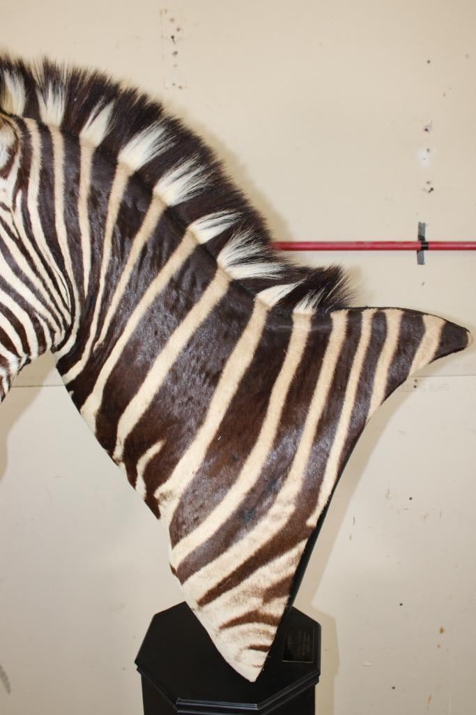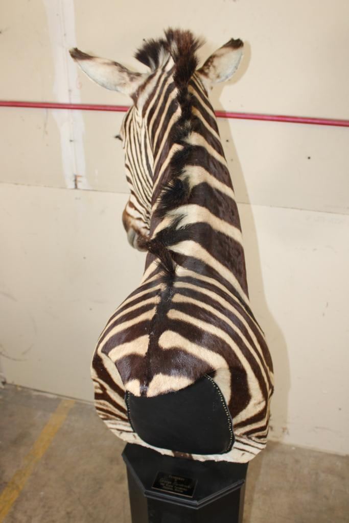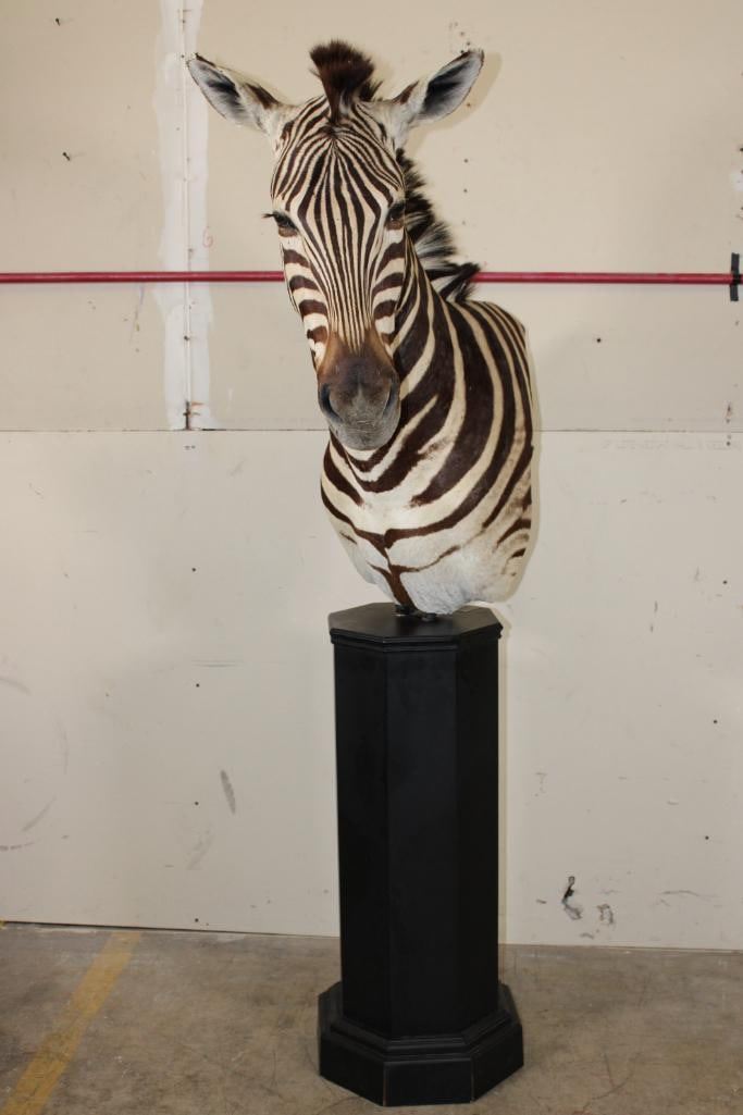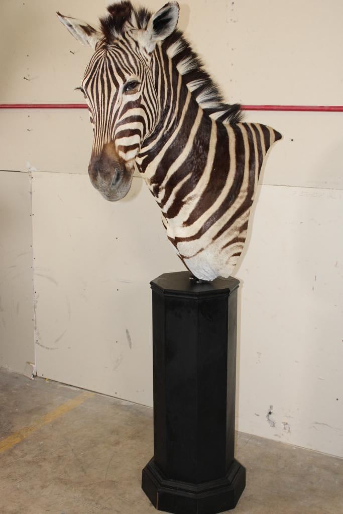 Beautiful ZEBRA Pedestal Mount. The Total Height is 74" Tall and the Zebra is removable. The hexagonal Base is made of light-weight wood and measures 35.5" Tall x 16" Wide. It has a Plaque that states "Taxidermy by George Swiderski. Old World Taxidermy Palatine, Illinois". TAXIDERMY