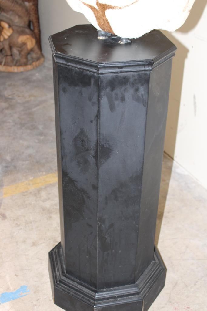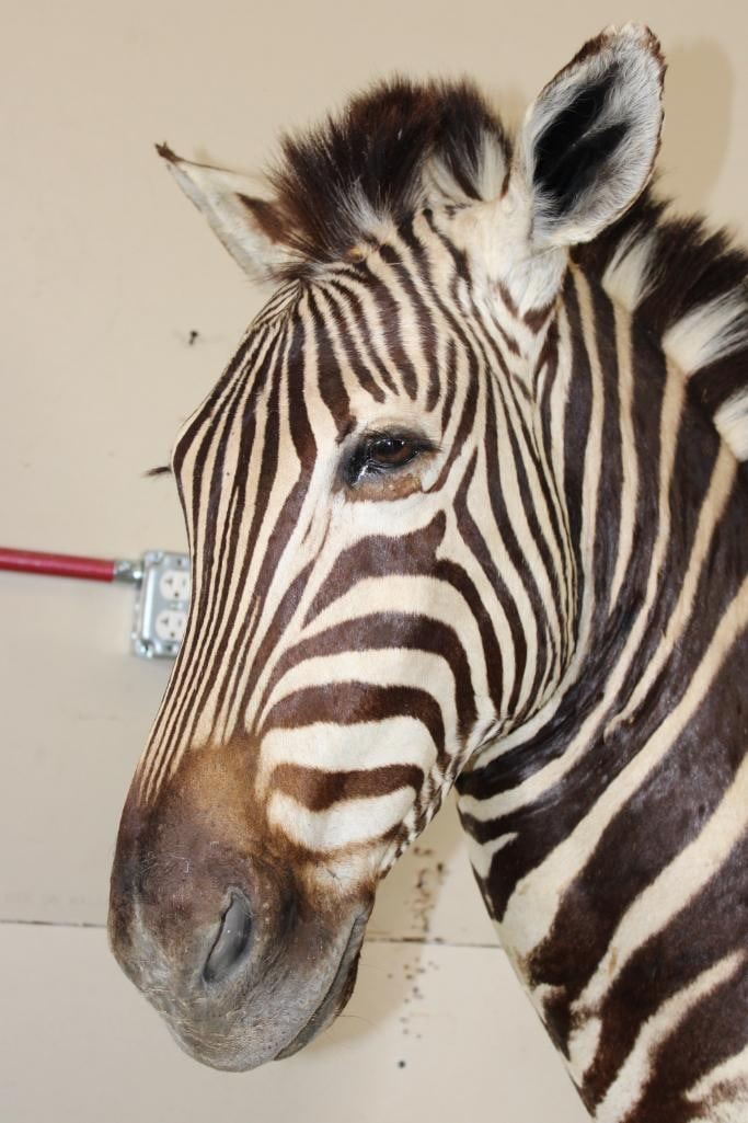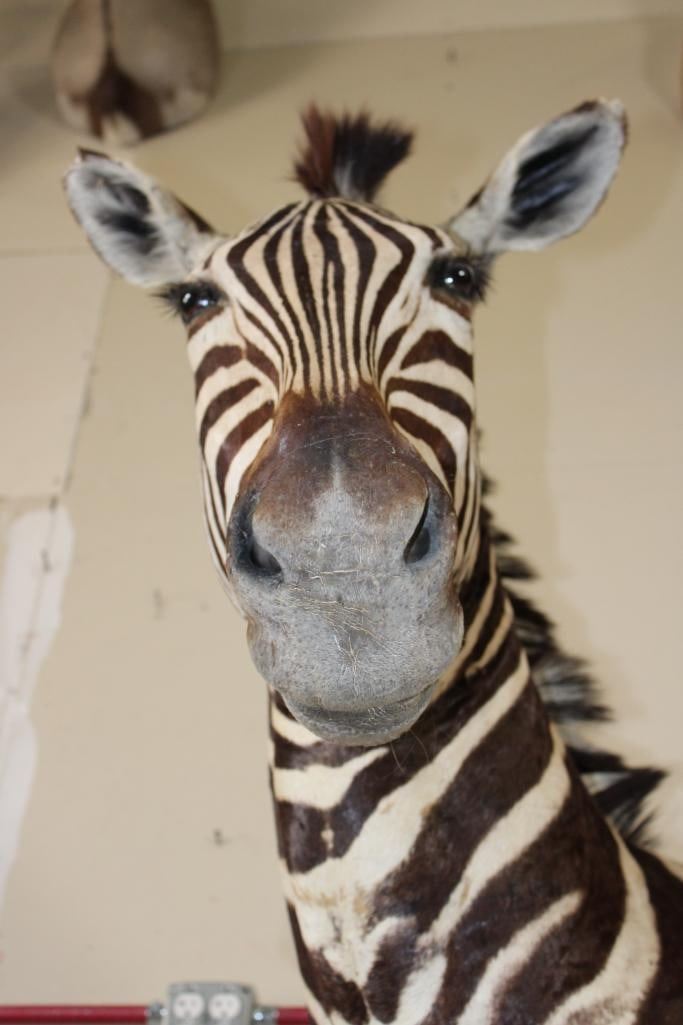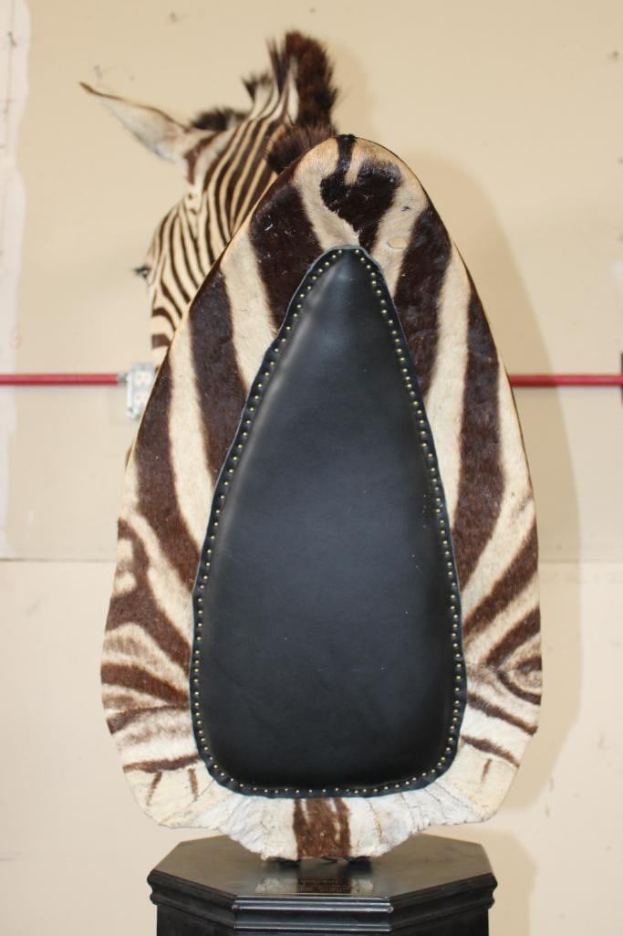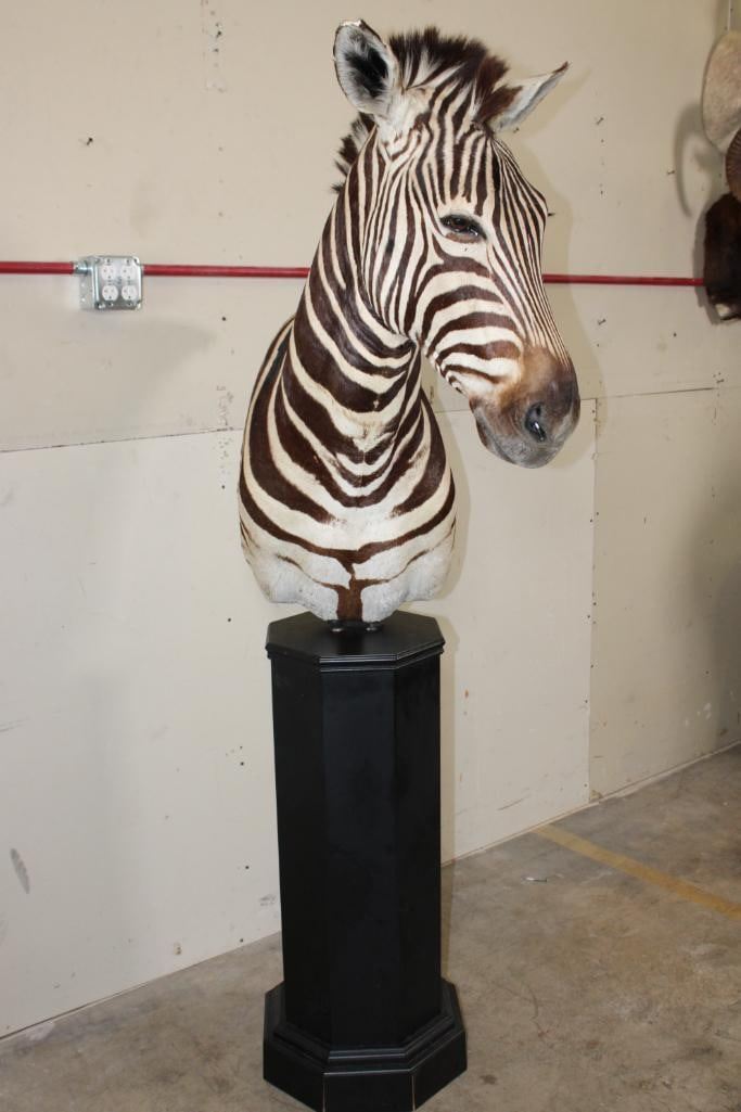 Beautiful ZEBRA Pedestal Mount. The Total Height is 74" Tall and the Zebra is removable. The hexagonal Base is made of light-weight wood and measures 35.5" Tall x 16" Wide. It has a Plaque that states "Taxidermy by George Swiderski. Old World Taxidermy Palatine, Illinois". TAXIDERMY