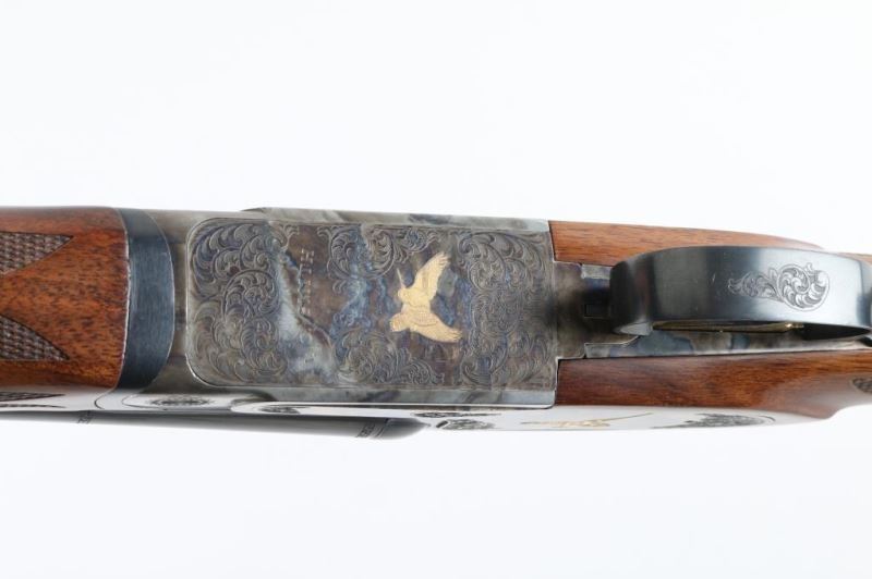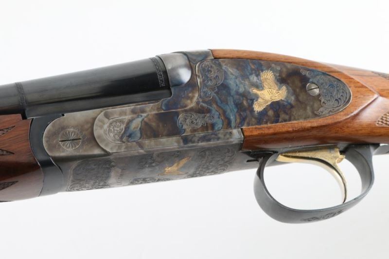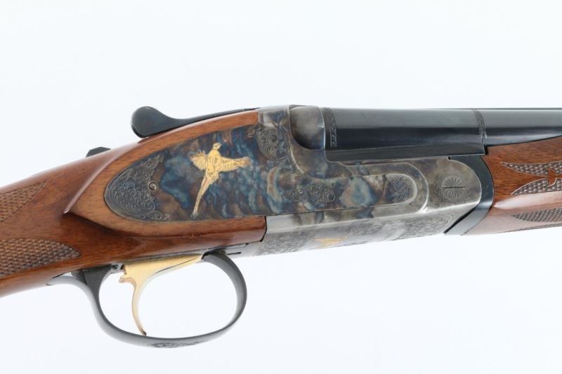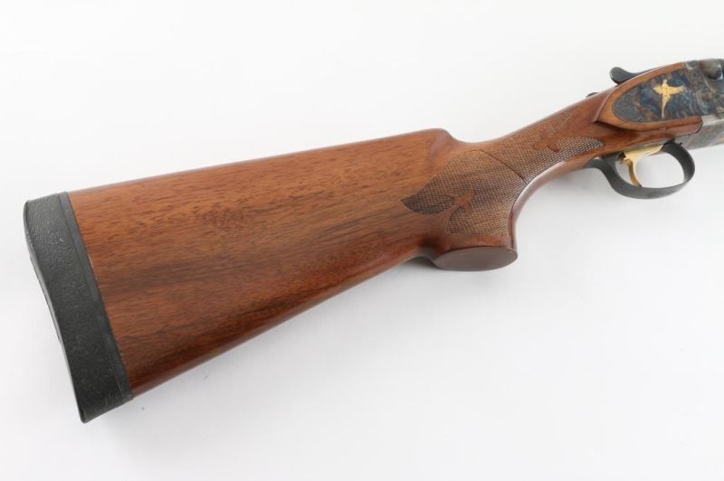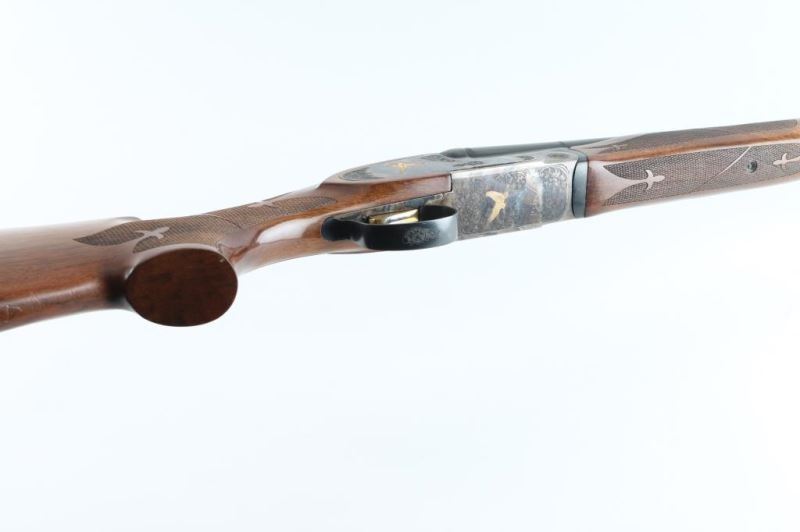Spanish made double barrel SxS side lock internal hammer shotgun imported by Marlin Firearms, North Haven CT, under the "LC Smith" trade name. Dated 2007. Accepts 2-3/4" shells. Features blued finish, case colored action with limited scroll engraving & gold inlaid game birds, 26" barrels, accepts choke tubes (tubes not marked, not removed for inspection, measure MOD/MOD), brass bead, gold color accent single inertia trigger, tang safety selects barrel, selective ejection, walnut stocks with semi-pistol grip, solid rubber recoil pad, fancy fleur-de-lis insets on checkered panels at wrist & forend. Bore is very good. Retains 95% finish with minor handling marks. Wood is very good. Includes the original cardboard box. Condition is NRA Excellent *** Modern Firearm ***