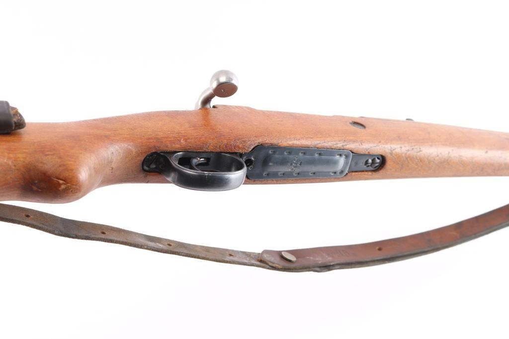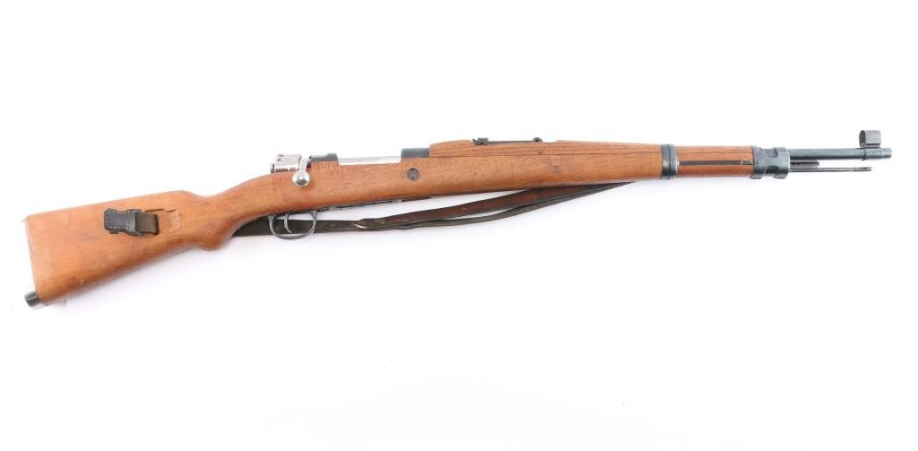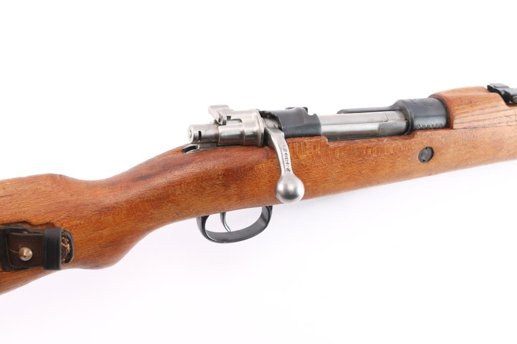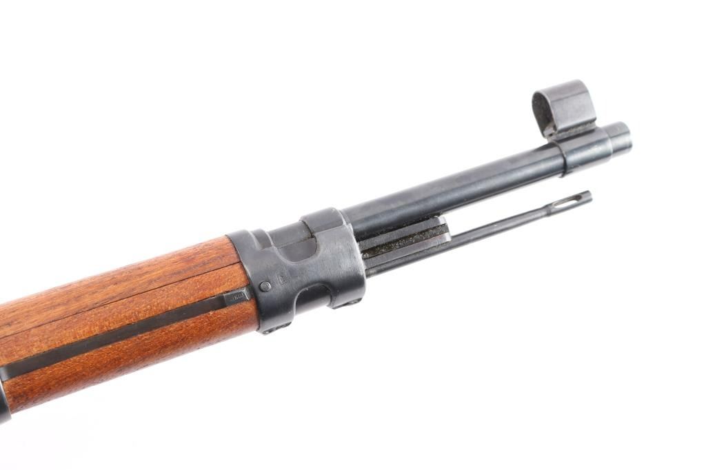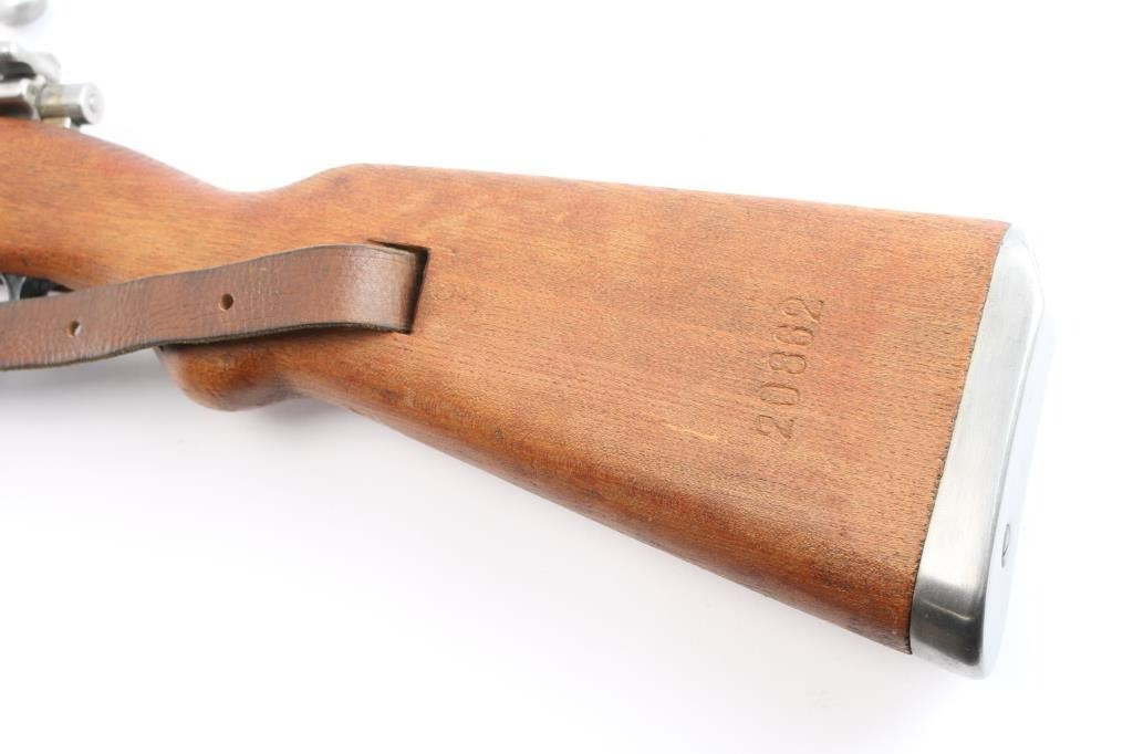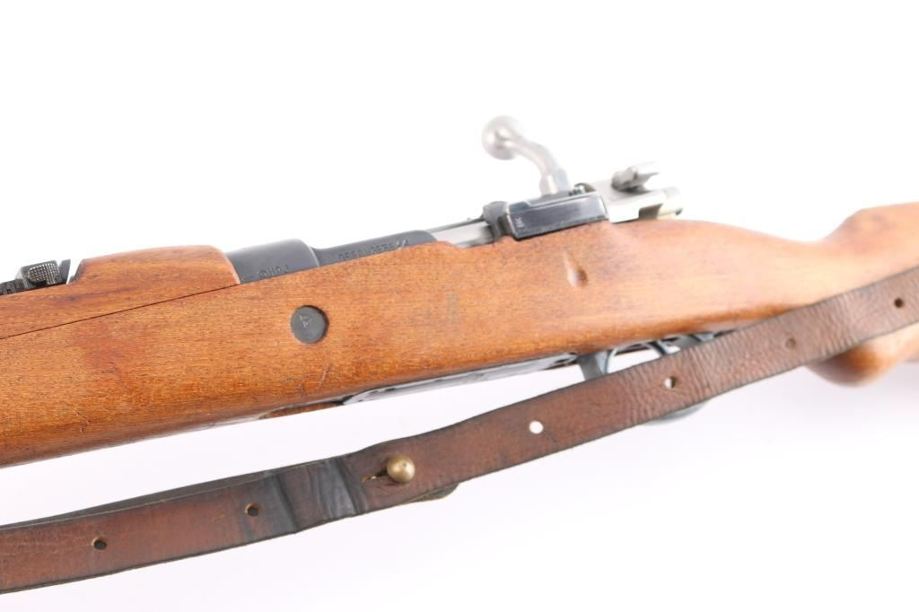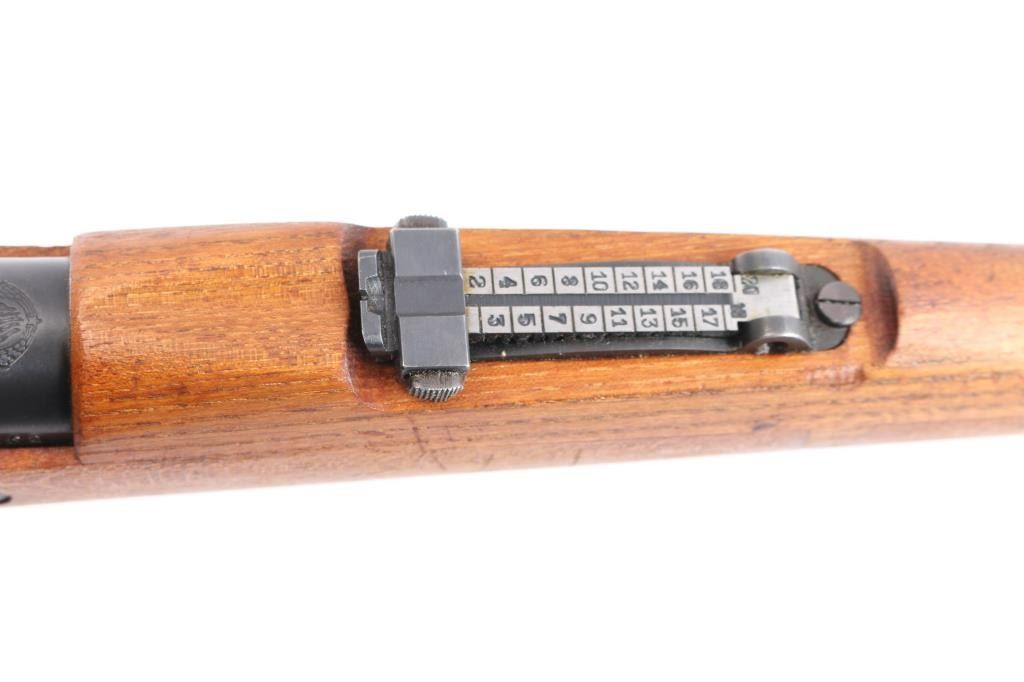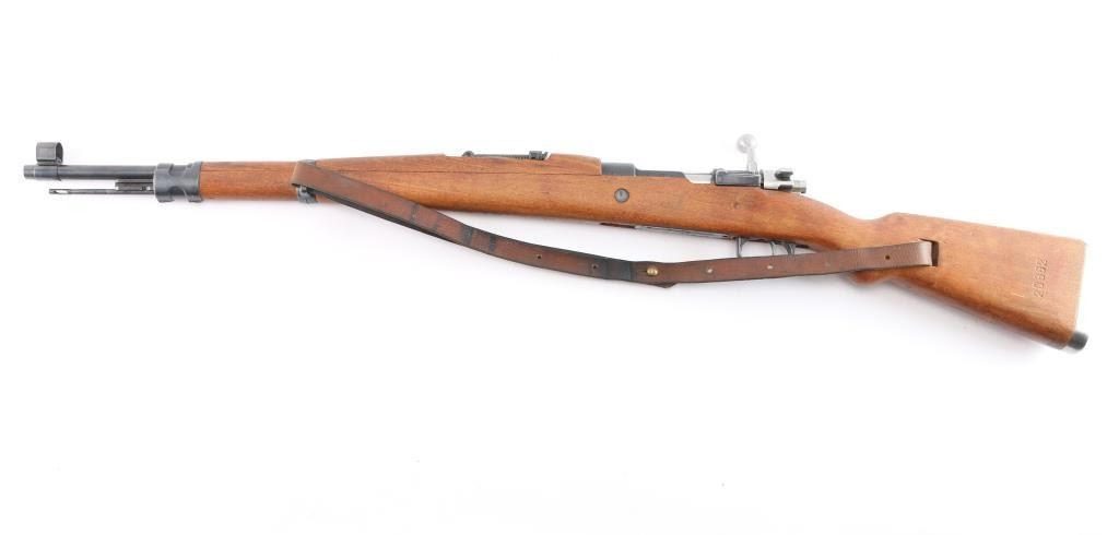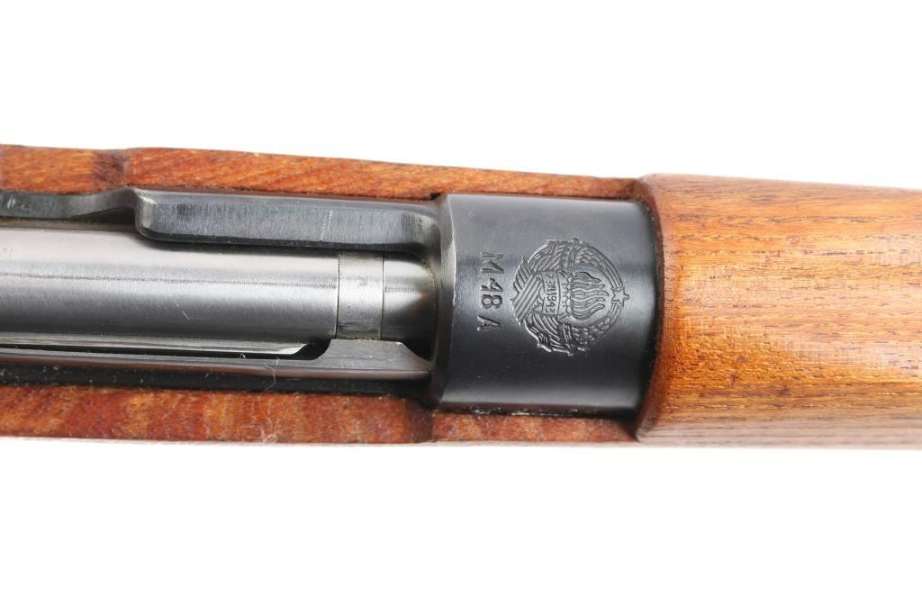 Military issued bolt-action rifle. Model M48A produced. 1952-1965. Yugoslavian made version of the German K98K, chambered in 7.92x57mm .Yugo crest and "M48A" on receiver ring. Features arsenal re-blued finish, polished bolt, wood stock & handguard with cupped steel buttplate, 24" barrel, hooded blade front sight, tangent rear sight, floorplate is stamped, cleaning rod, bayonet lug, sling slots, manual safety. "H" style front barrel band. Bore is excellent/bright, strong rifling. Action is smooth/tight. Retains 97% blue with scratches & dings. Wood is very good with minor scratches. Matched bolt & floorplate to receiver. Numerous Yugo inspector stamps. Correct issue brown leather sling. Imported by Cherry's, marked on the underside of the barrel.