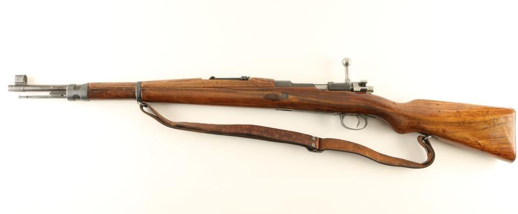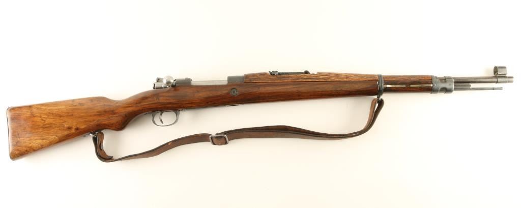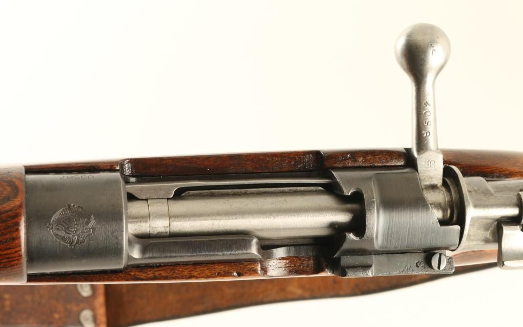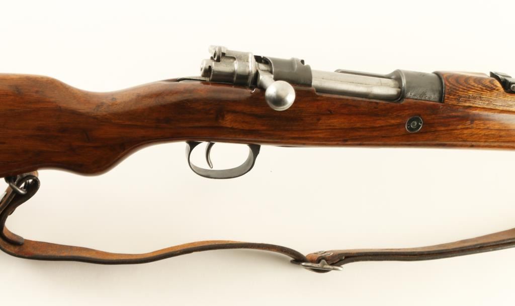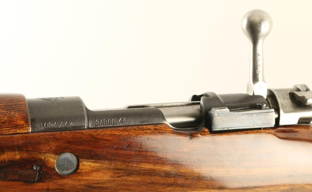 Rifle. Bolt-Action. Yugoslavian post-WW2 update of the M24. Basically a K98. 24" barrel, with elevation ramp rear, and hooded blade front sights. Clip fed 5 rd box magazine. Yugo Crest on receiver ring. Matching serial #s on receiver, mag plate, stock, and bolt. Imported by Samco, Fla, marked on underside of barrel. Chrome bolt, with Mauser safety. Bore appears excellent, but dirty. Varnished wood stock, and handguard are very good with the usual minor dings. Steel butt plate. Cleaning rod present. Blued finish is about 90%, with edge wear, and minor sctraches. Comes with a period leather sling. NRA condition-Very Good. C&R Firearm.