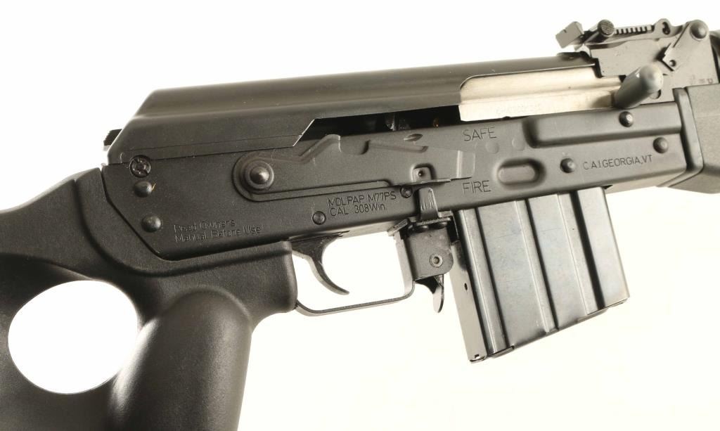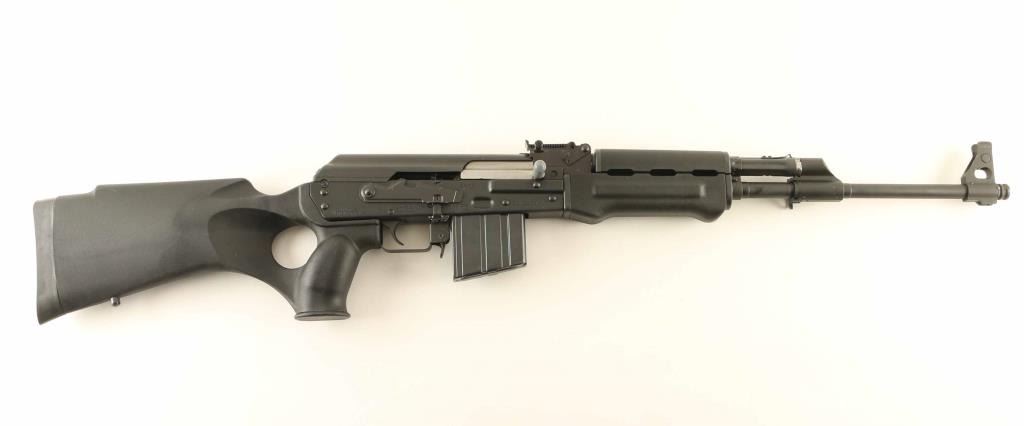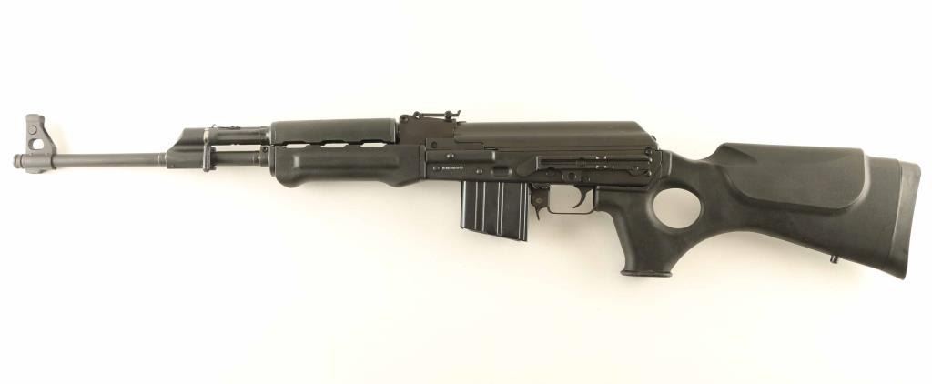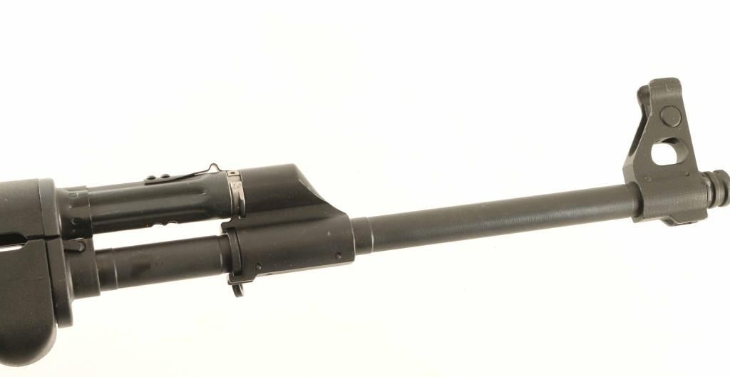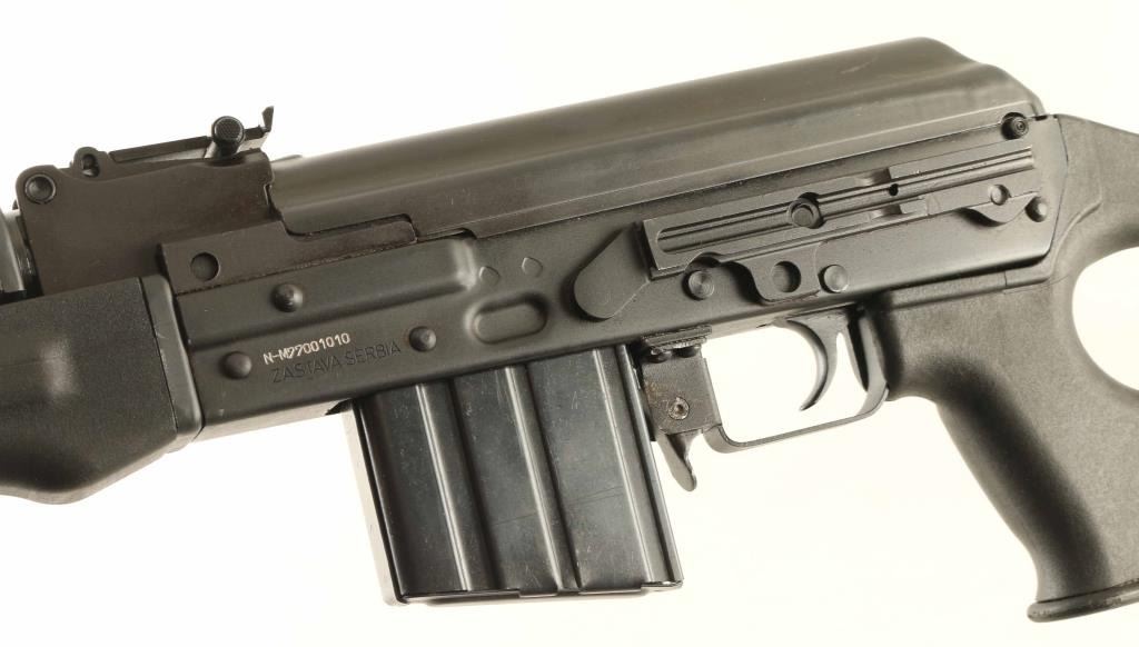 Rifle. Semi-Automatic. Serbian made. Gas-operated, piston-driven. In the style of an AK-47. 19.7" chrome-lined barrel. Welded muzzle nut, m14x1 mm threads. Black synthetic thumbhole stock, and fore grips. Rear ladder sight, and adjustable front post. Rubber butt plate. Bore appears excellent. Black metal finish is excellent with a couple of minor rubs. Furniture is excellent. Action is smooth/tight. 10 Rd box magazine included. Rifle is in almost new condition NRA Condition-Excellent. Modern Firearm.