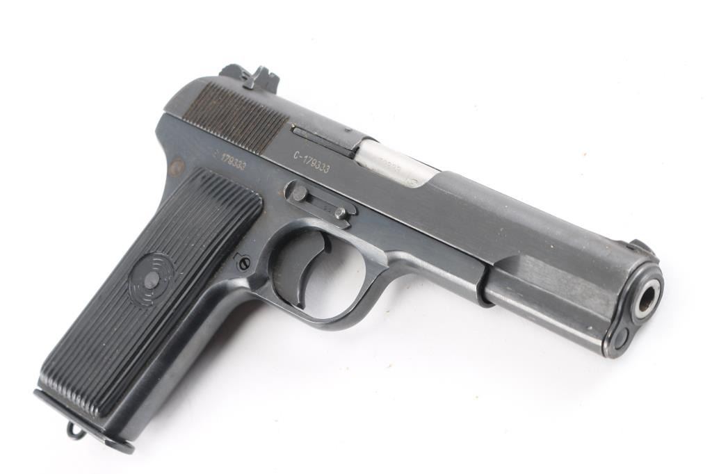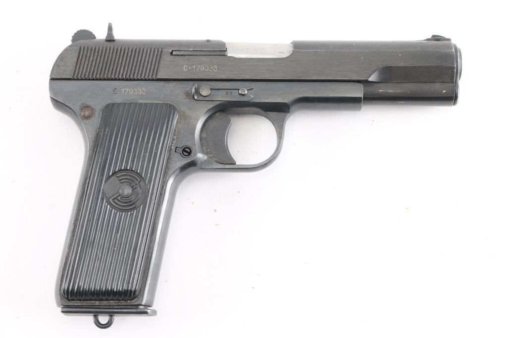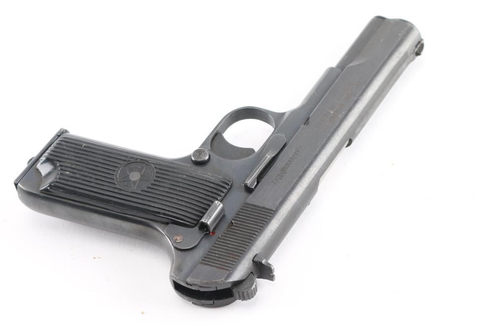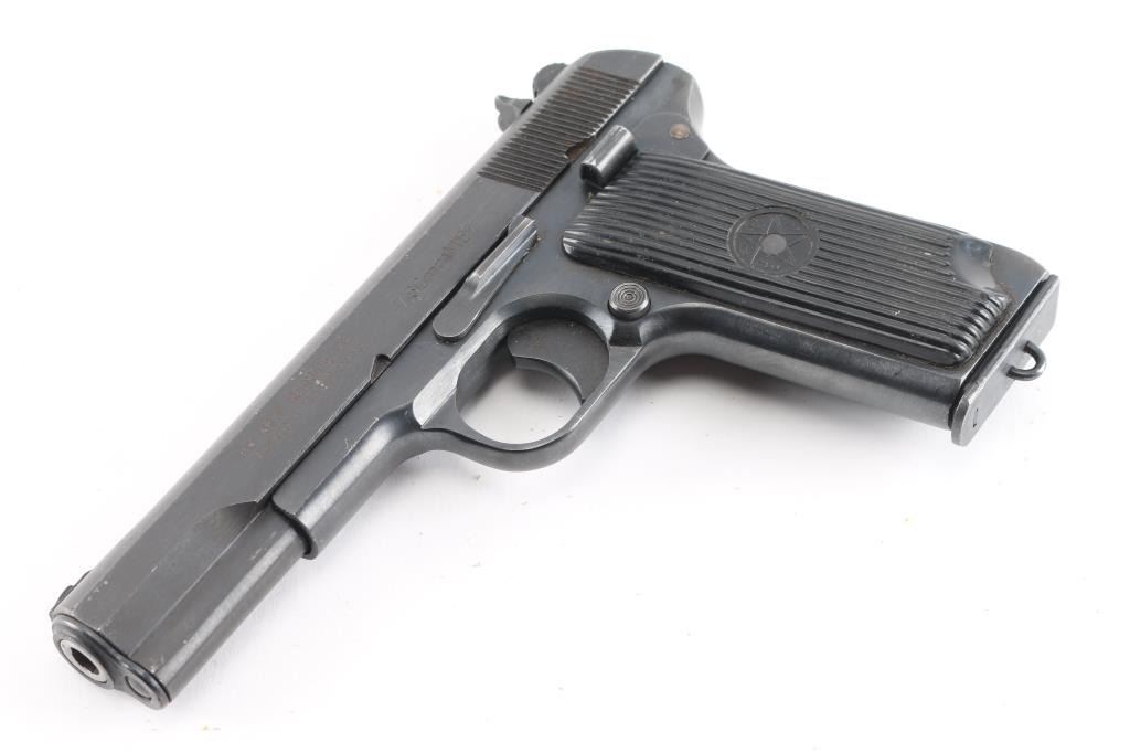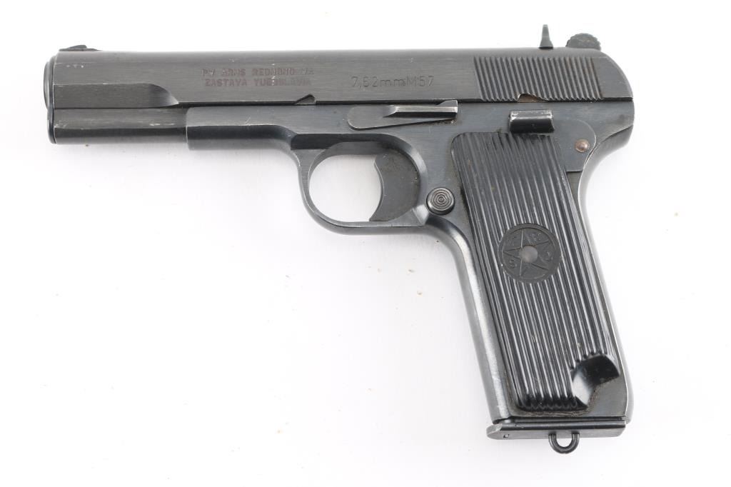 Yugoslavian military pistol imported by PW Arms, Redmond WA. Tokarev type pistol with slightly longer frame, takes a longer magazine that standard TT-33's. Features approx 4.5" barrel, fixed sights, detachable magazine, magazine safety, frame mounted manual safety, grooved plastic grips with "SFRJ" star on one side & "CZ" logo on other, lanyard loop, single action trigger. Bore is very good condition. Finish is blued with 90% coverage, some scratches and scuffs. Appears to be factory reblue. Black plastic grips in very good condition. Observed numbers match. Includes one lanyard loop magazine.