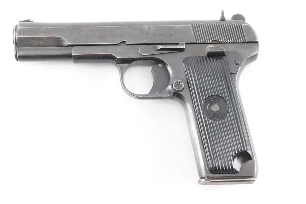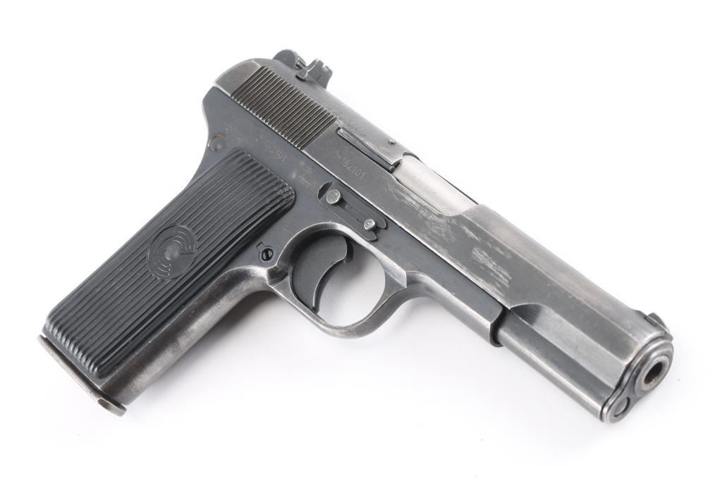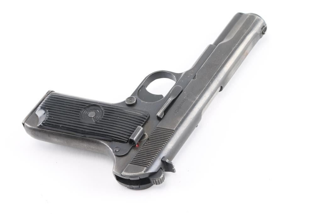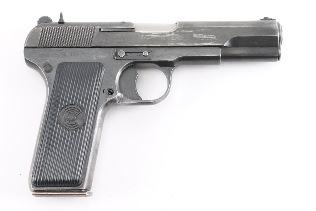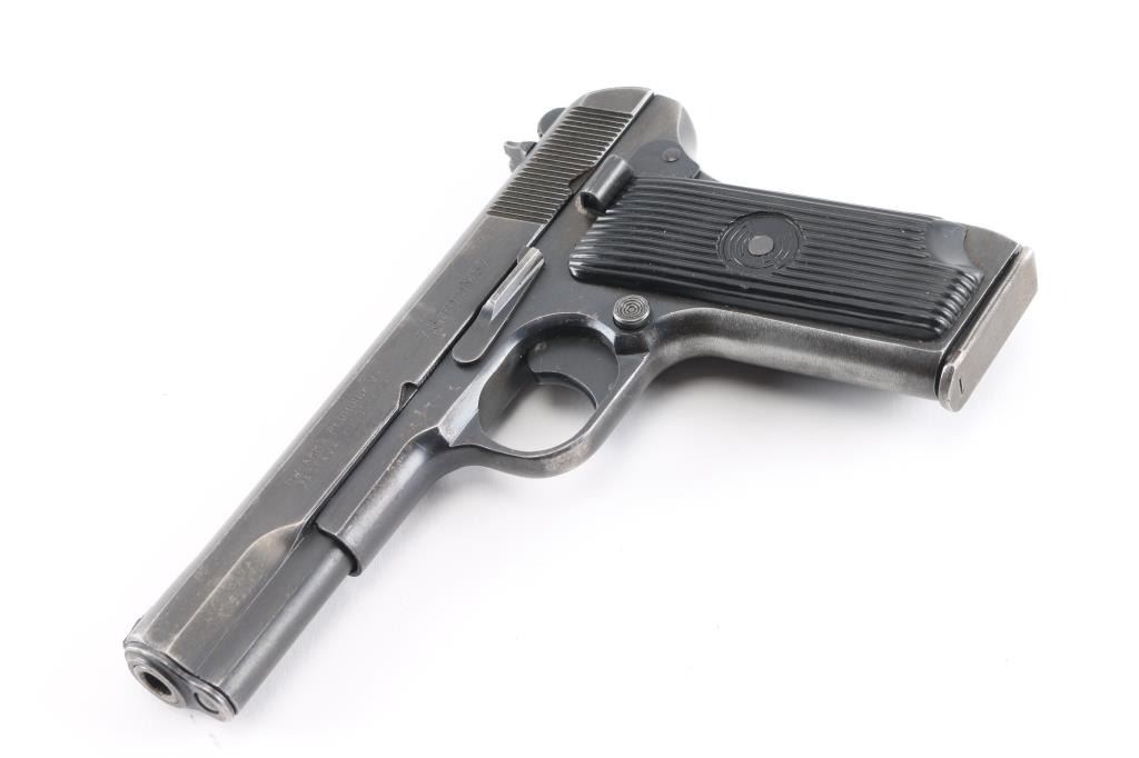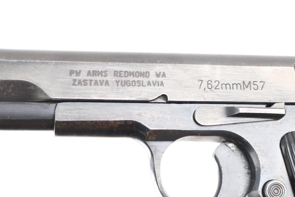 Yugoslavian military pistol imported by PW Arms, Redmond WA. Tokarev type pistol with slightly longer frame, takes a longer magazine that standard TT-33's. Features approx 4.5" barrel, fixed sights, detachable magazine, magazine safety, frame mounted manual safety, grooved plastic grips with "SFRJ" star on one side & "CZ" logo on other, lanyard loop, single action trigger. Bore is good to very good condition, bright with very light frosting and minor pitting. Finish is blued with 80% coverage, some scratches and scuffs, edge losses & handling marks. Black plastic grips in very good condition. Observed numbers match. Includes one magazine.
