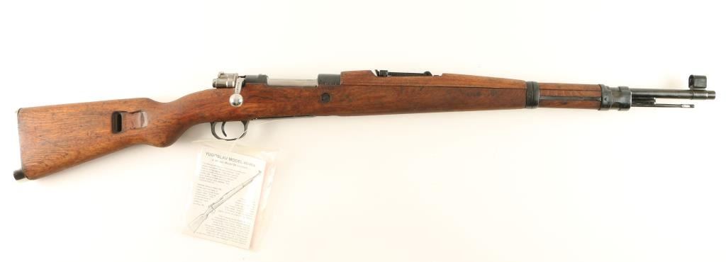 Arsenal reconditioned Yugoslavian military bolt action service rifle chambered in 8mm Mauser. Features a blued finish, 23.25" barrel, hooded front sight, adjustable rear graduated sight to 2,000 meters, bayonet lug, cleaning rod, straight bolt handle, manual safety, internal box magazine, smooth hardwood handguard and full length pistol grip shoulder stock with metal buttplate. Import marks on barrel. Matching numbers on receiver, floorplate, bolt and stock. Rifle exhibits approximately 98% of it's blued refinish showing little wear. Action is sound, bore is excellent and wood stocks are very good. Condition is near excellent. ***C&R Firearm*** ***Modern Firearm***