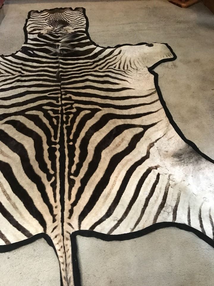 LARGE GENUINE TROPHY GRADE BURCHELL ZEBRA HIDE RUG WITH BLACK FELT APPLIED AT THE BOTTOM (HAS SOME PATCHS ON HIDE APPROXMITLY 4”X4”)